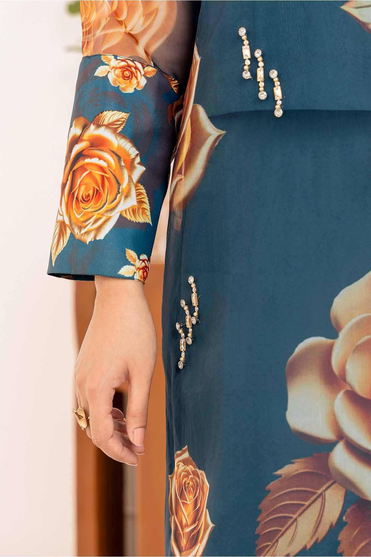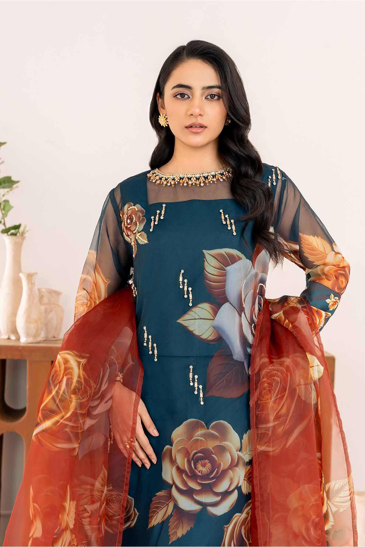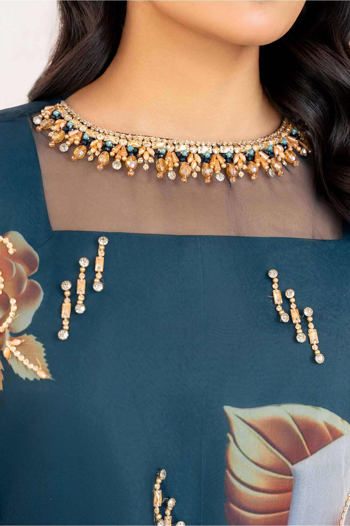 Shirt and Dupatta made in Organza front embellished with Beads and Crystals.Trouser and Tank Top made in Soft Crepe fabric.