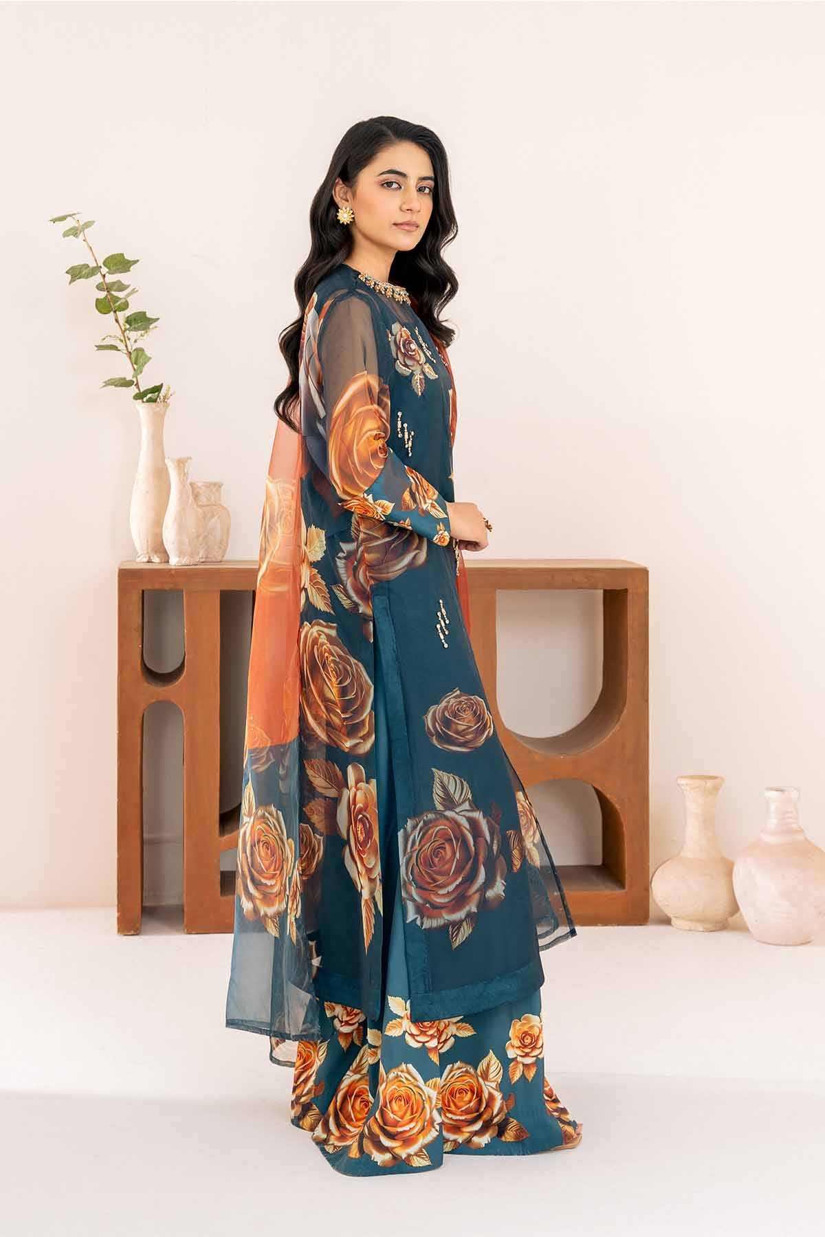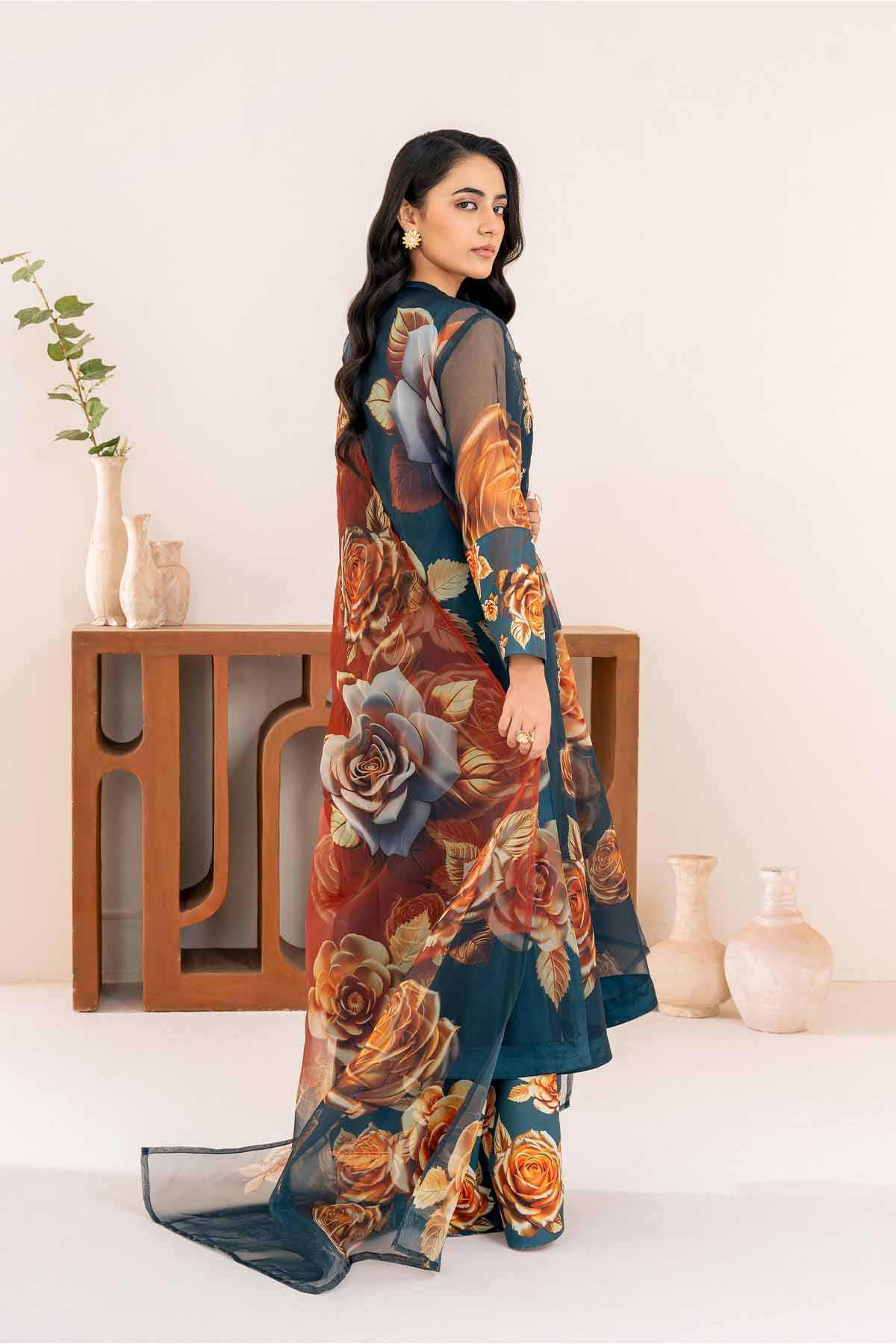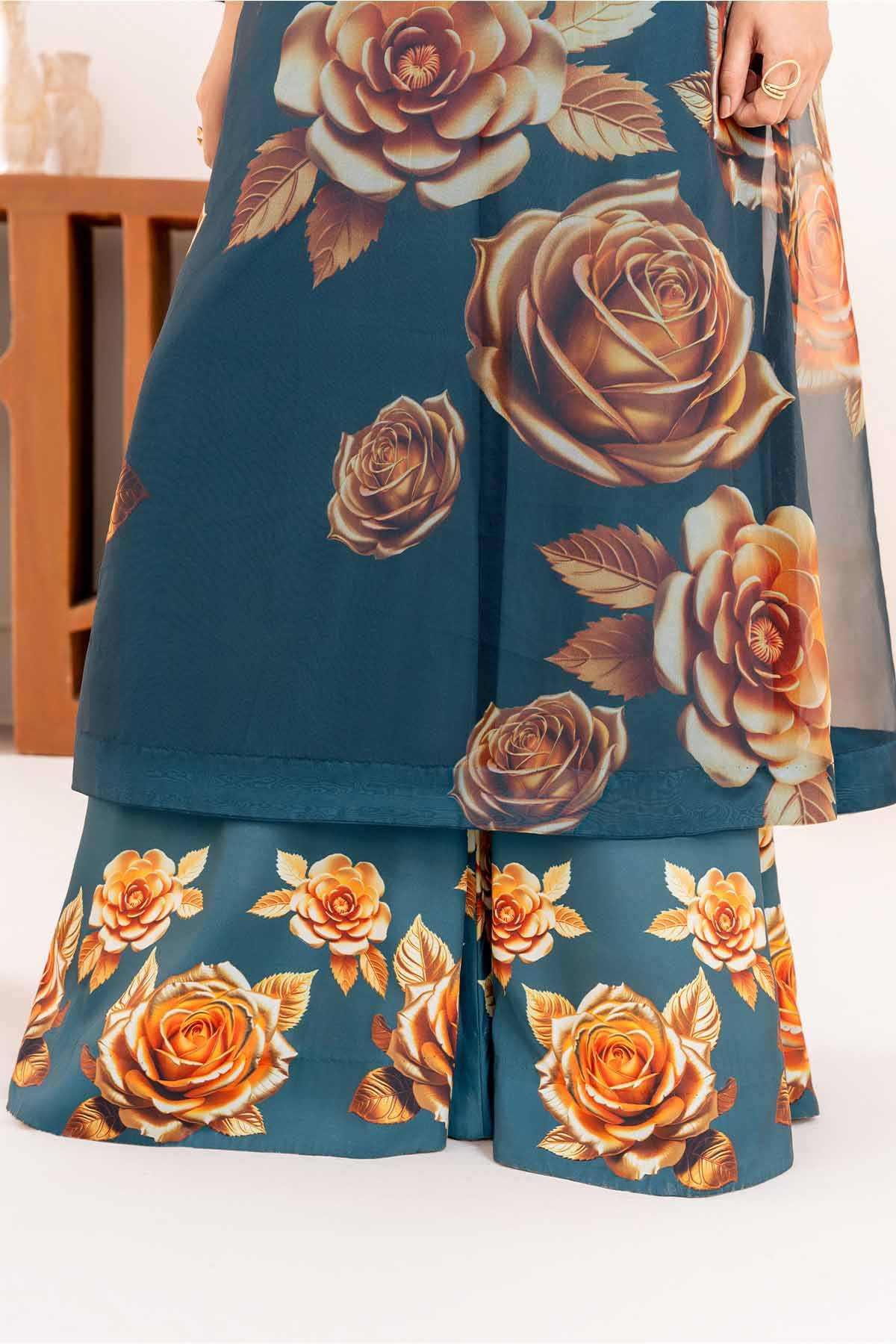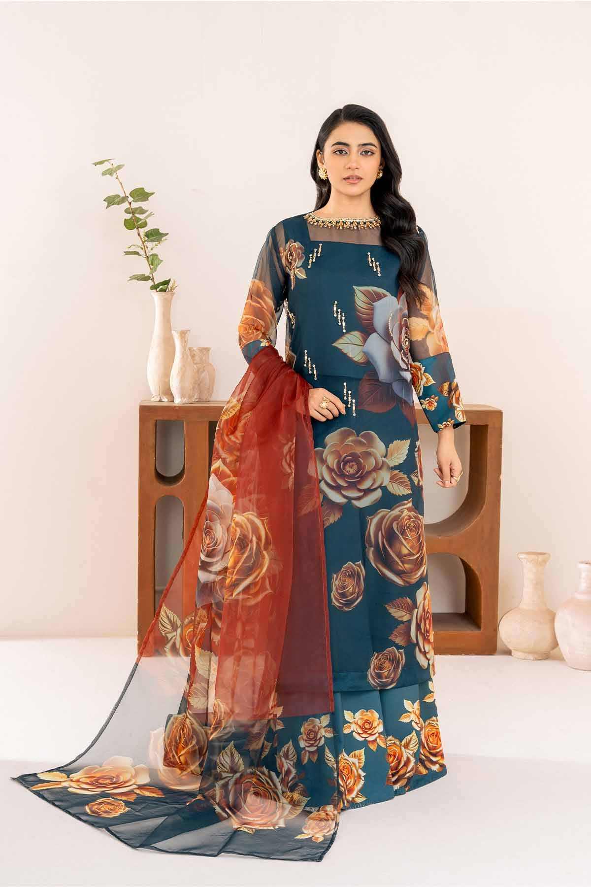 Shirt and Dupatta made in Organza front embellished with Beads and Crystals.Trouser and Tank Top made in Soft Crepe fabric.