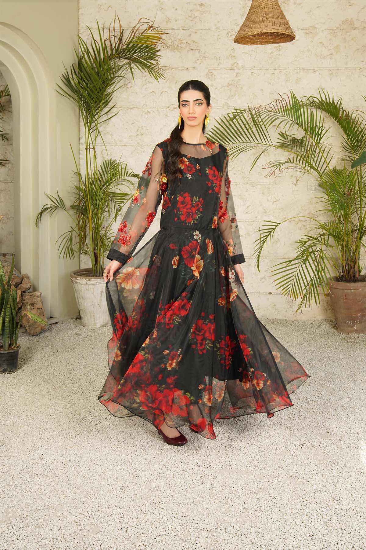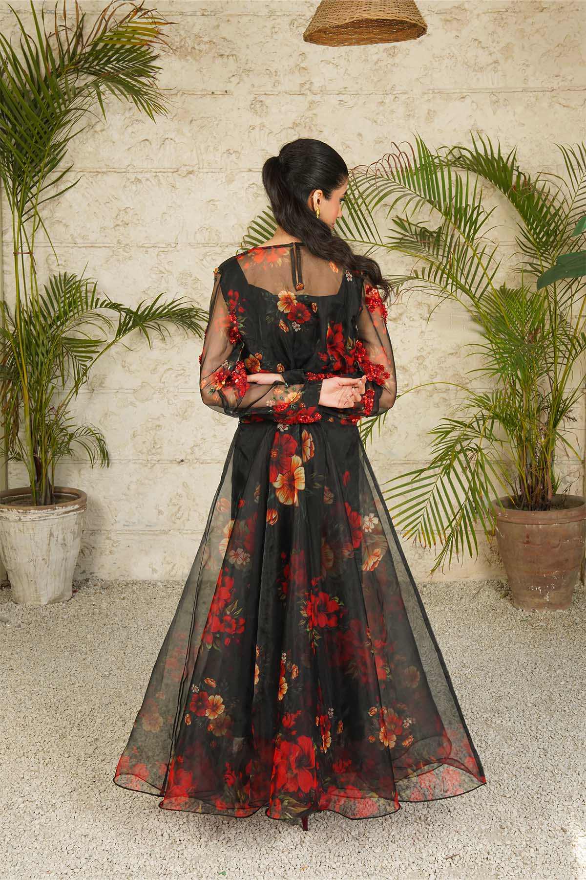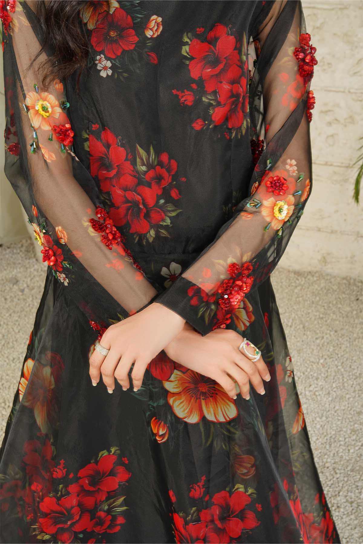 The Organza Printed Red Floral Peshwas is a stunning and regal piece,designed to make a bold statement.The fabric is crafted from delicate organza, which has a light,sheer quality that adds an etherealgraceful touch to the garment.The rich red hue,complemented by a beautiful floral print,creates a striking contrast,adding vibrancy and elegance to the overall look.The Peshwas style,characterized by its long,flowing silhouette 160 flared,gives the dress a traditional and royal feel.The design features embellished sleeves adorned with intricate sequins and crystals.These embellishments catch the light, adding a dazzling sparkle and enhancing the luxurious appeal of the Peshwas.The combination of sequins and crystals creates a perfect balance of glamour without overwhelming the design.