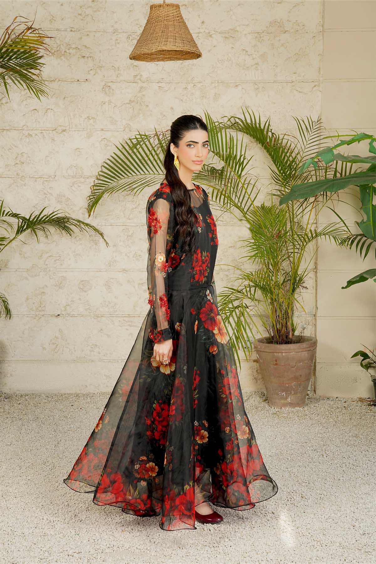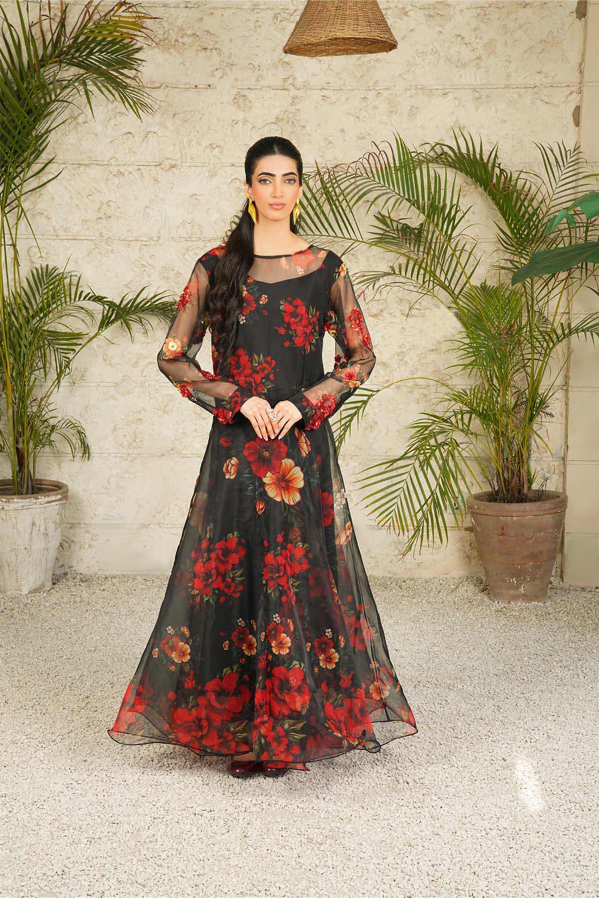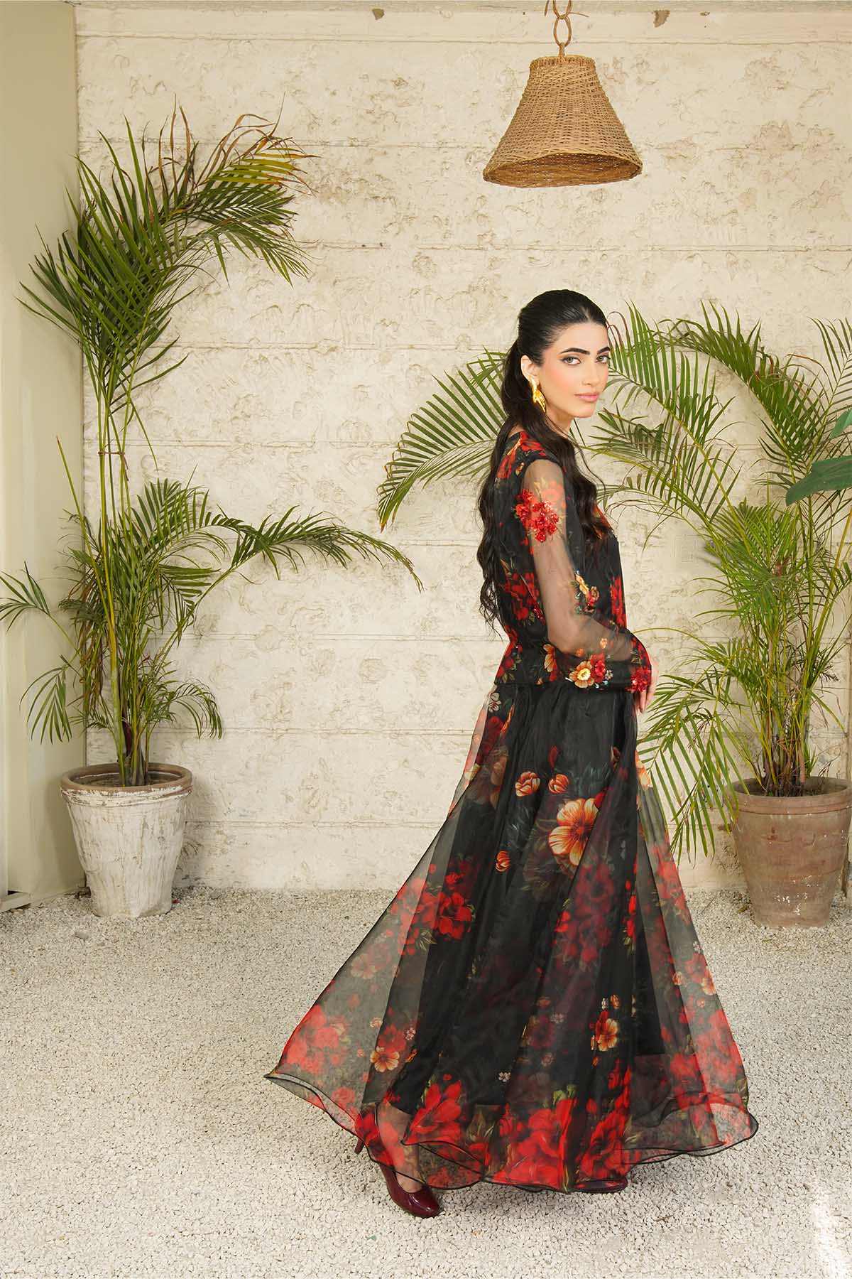 The Organza Printed Red Floral Peshwas is a stunning and regal piece,designed to make a bold statement.The fabric is crafted from delicate organza, which has a light,sheer quality that adds an etherealgraceful touch to the garment.The rich red hue,complemented by a beautiful floral print,creates a striking contrast,adding vibrancy and elegance to the overall look.The Peshwas style,characterized by its long,flowing silhouette 160 flared,gives the dress a traditional and royal feel.The design features embellished sleeves adorned with intricate sequins and crystals.These embellishments catch the light, adding a dazzling sparkle and enhancing the luxurious appeal of the Peshwas.The combination of sequins and crystals creates a perfect balance of glamour without overwhelming the design.