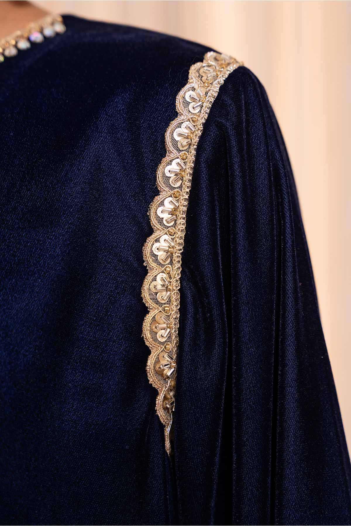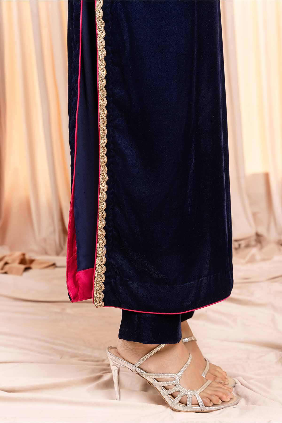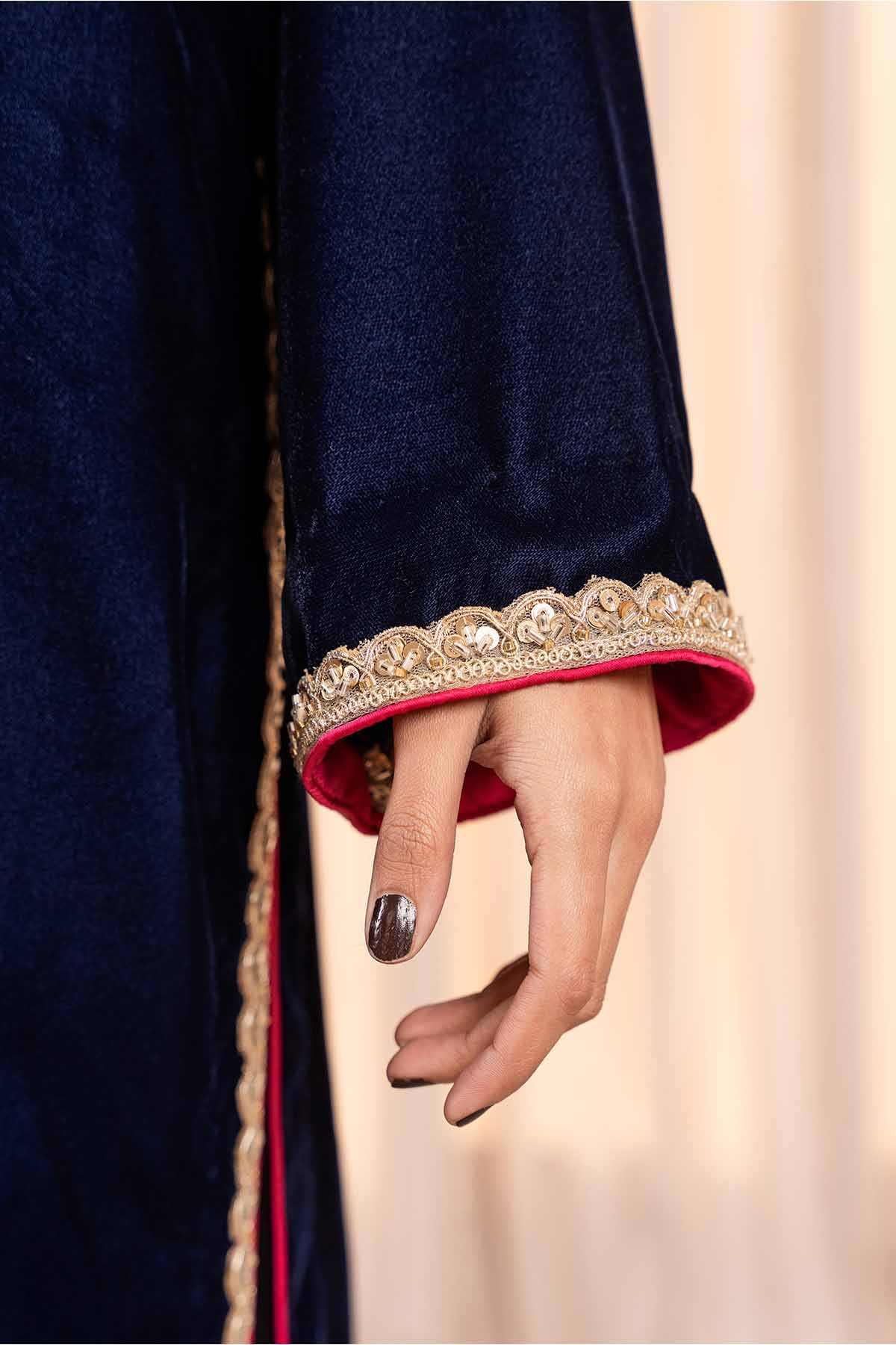 The dress is made from luxurious navy blue micro 9000 velvet,a fabric known for its rich texture and subtle sheen.The neckline of the dress is beautifully embellished with stone work, featuring sparkling crystals that are carefully arranged to form an intricate design.The armholes,cuff and side slit of the dress are adorned with lace detailing,which softens the sharp edges of the garment and adds a delicate touch.This lace attachment adds a layer of femininity and grace,creating a balanced combination of softness and sophistication.The slit is beautifully framed by contrast pink piping, which creates a striking visual contrast against the navy blue velvet.