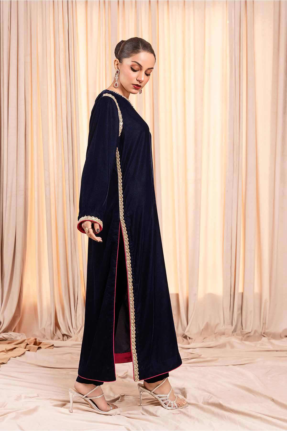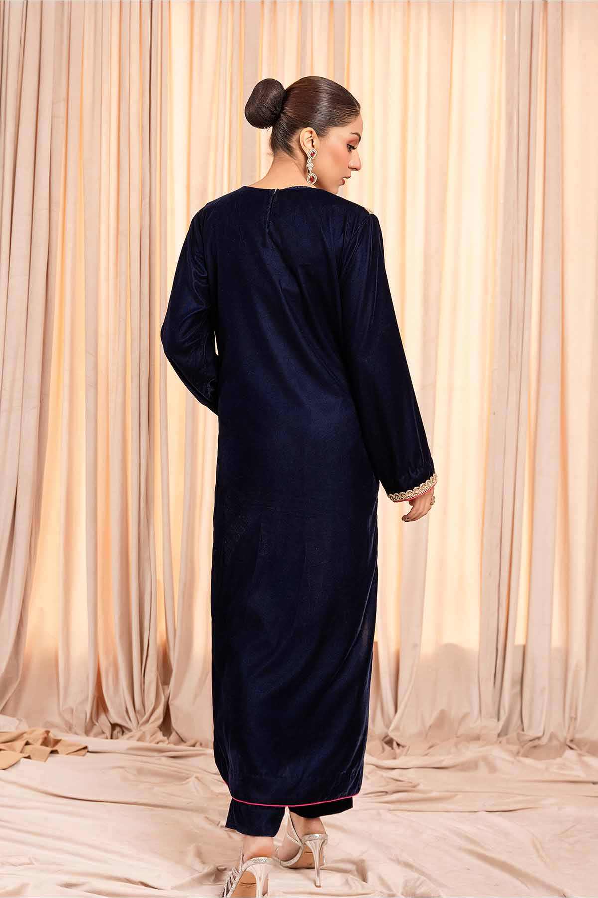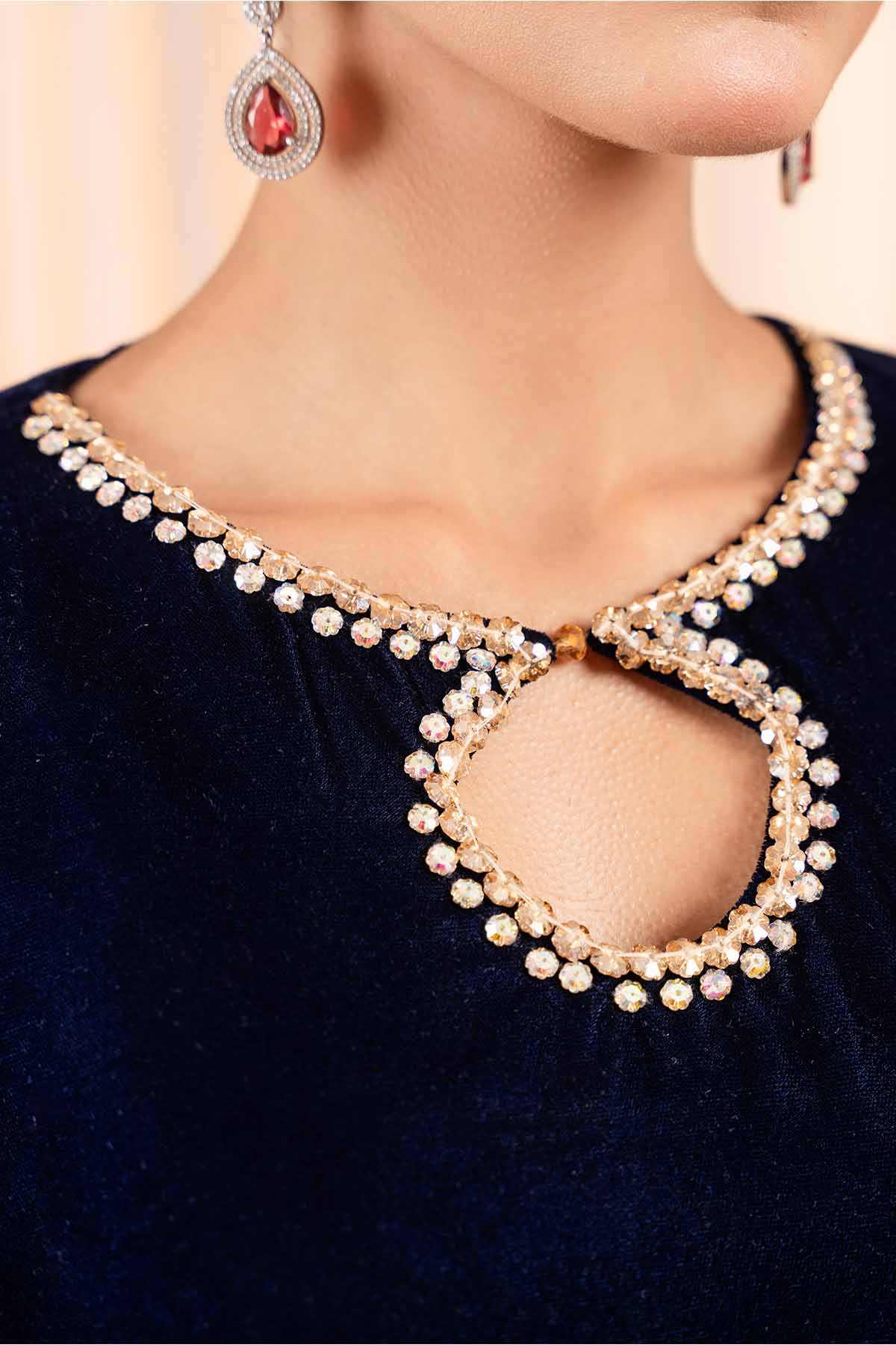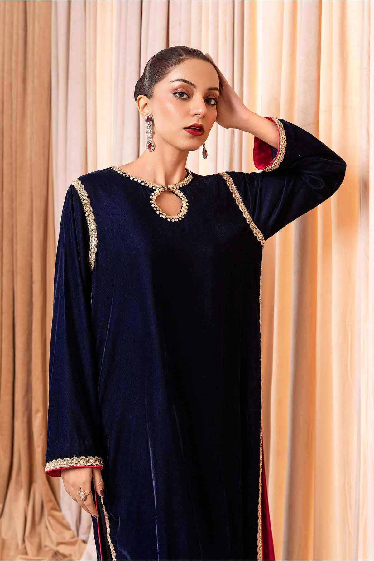 The dress is made from luxurious navy blue micro 9000 velvet,a fabric known for its rich texture and subtle sheen.The neckline of the dress is beautifully embellished with stone work, featuring sparkling crystals that are carefully arranged to form an intricate design.The armholes,cuff and side slit of the dress are adorned with lace detailing,which softens the sharp edges of the garment and adds a delicate touch.This lace attachment adds a layer of femininity and grace,creating a balanced combination of softness and sophistication.The slit is beautifully framed by contrast pink piping, which creates a striking visual contrast against the navy blue velvet.