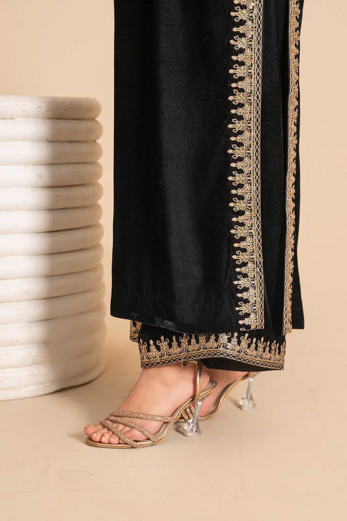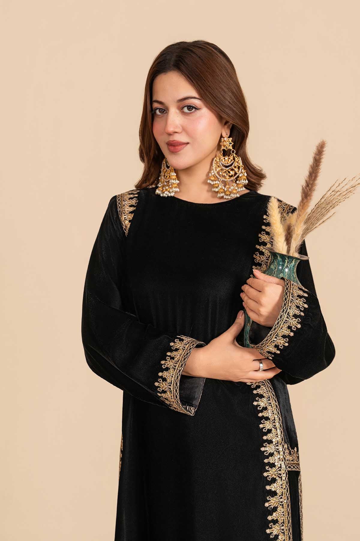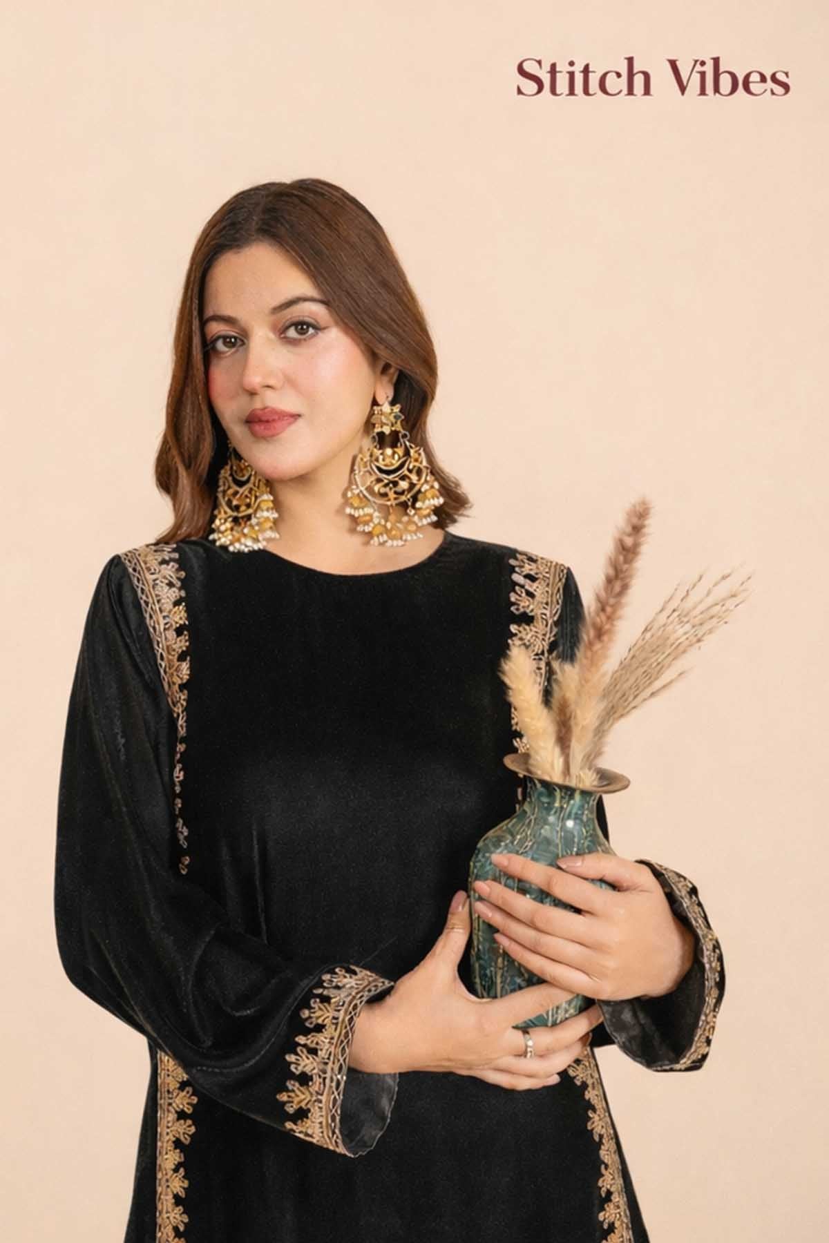 P data end 594 data start 198 Shirt Length 48a Embrace timeless elegance witha  strong data end 242 data start 229 Stillness strong , a luxurious strong data end 290 data start 256 black velvet embroidered dress strong designed for refined festive moments. Crafted fromPremium velvet fabric, this statementPiece features intricate embroidery that adds depth, texture, and sophistication. The rich black hue enhances its regal appeal, making it aPerfect choice for evening wear, winter festivities, and formal occasions.P