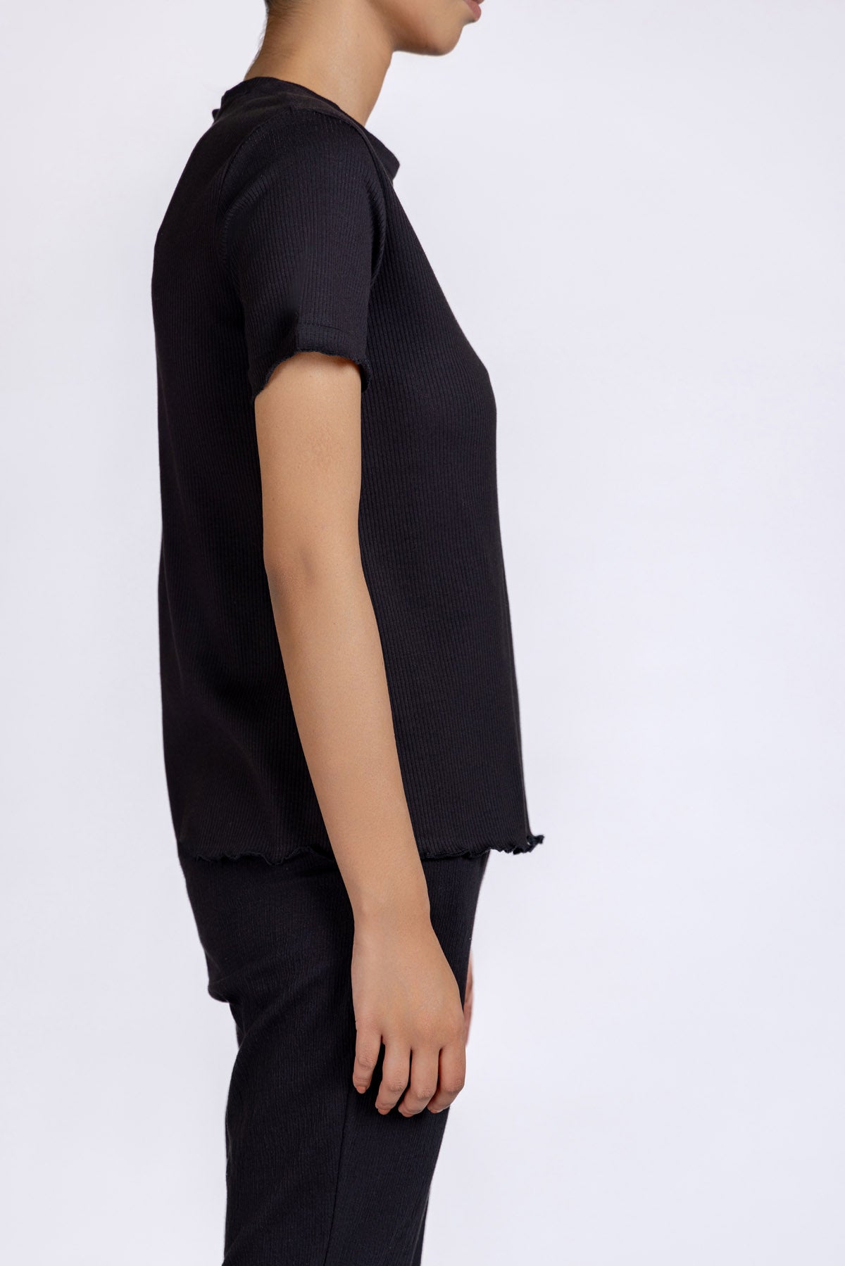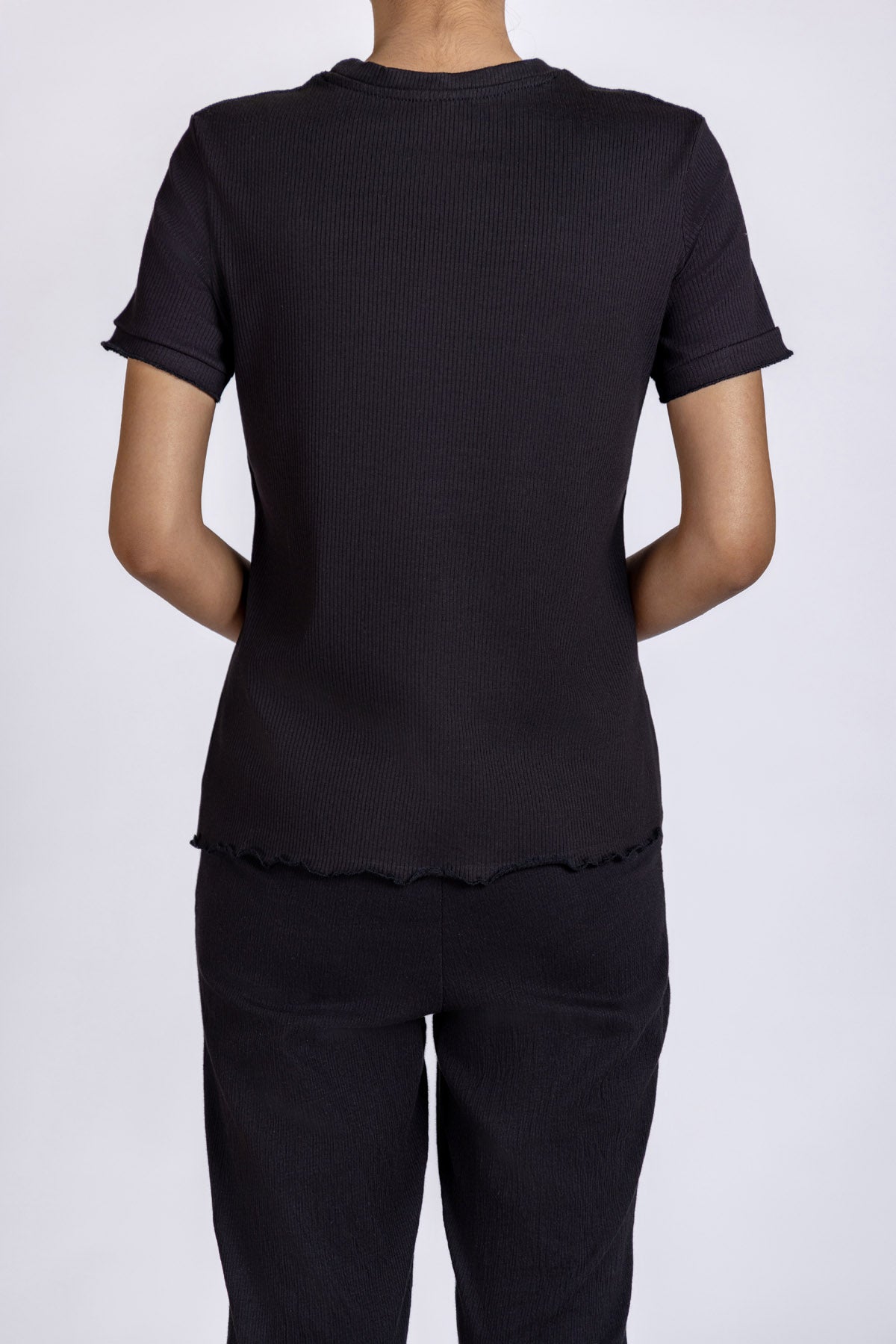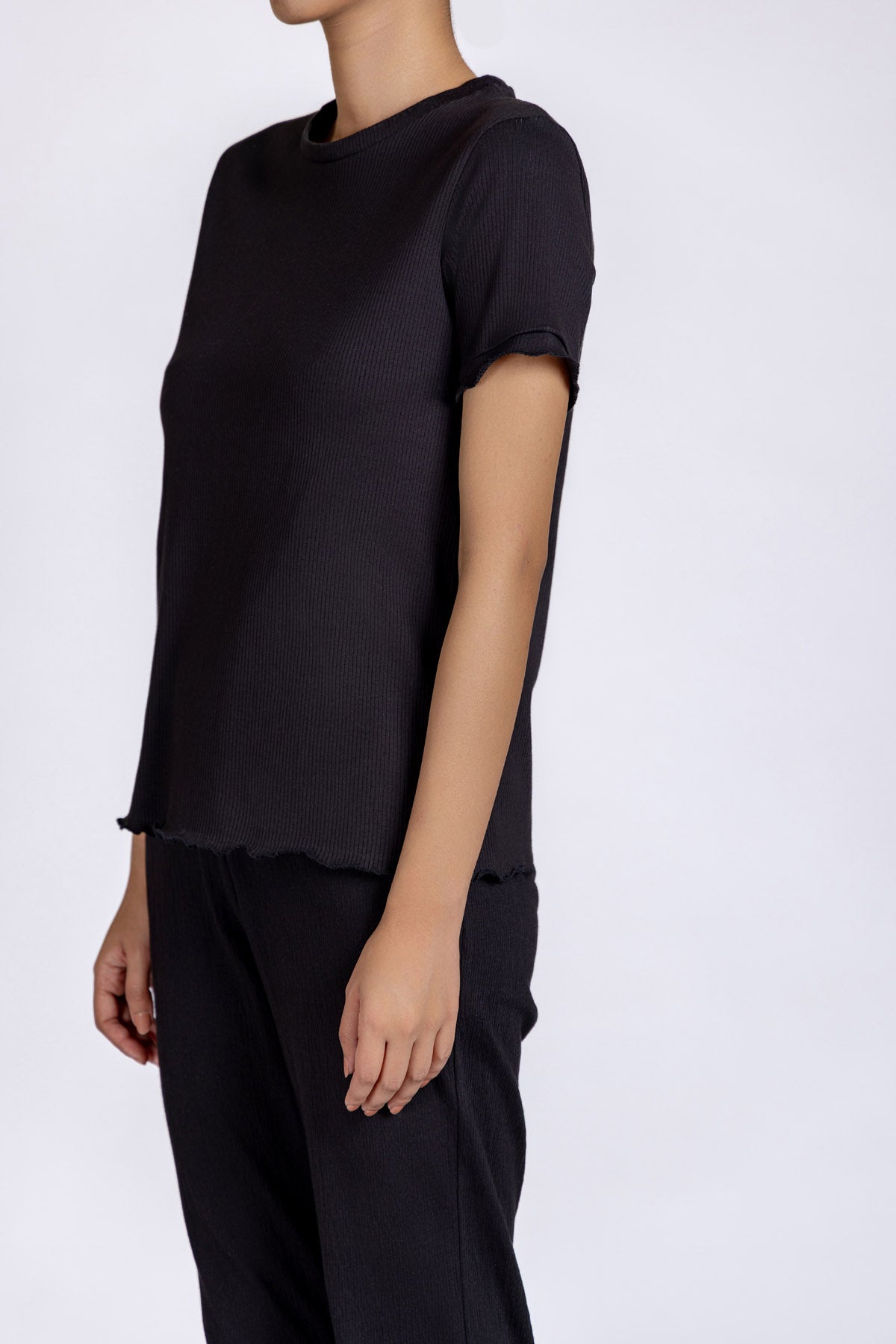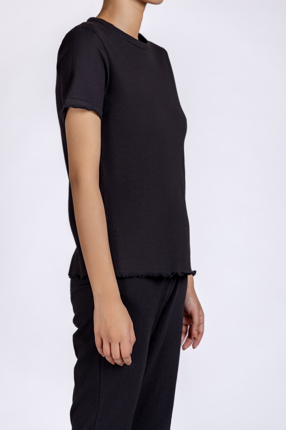 95% Cotton 5% Elastane. Solid T shirt with crew neckline, short sleeves and lettuce hem. Modelâ ‚¬ „¢s height: 5'7ft, Modelâ ‚¬ „¢s size: Small.