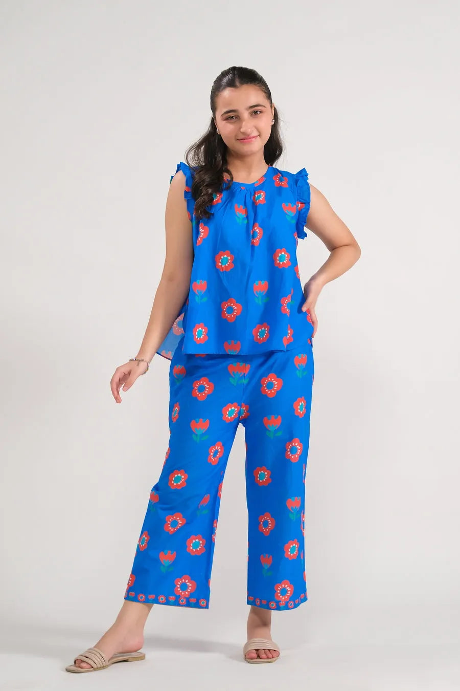 Elevate your style with this striking blue ensemble adorned with bold floral prints. The sleeveless ruffle detail enhances its elegance, making it perfect for brunch or an afternoon garden party, ensuring you stand out in effortless fashion.