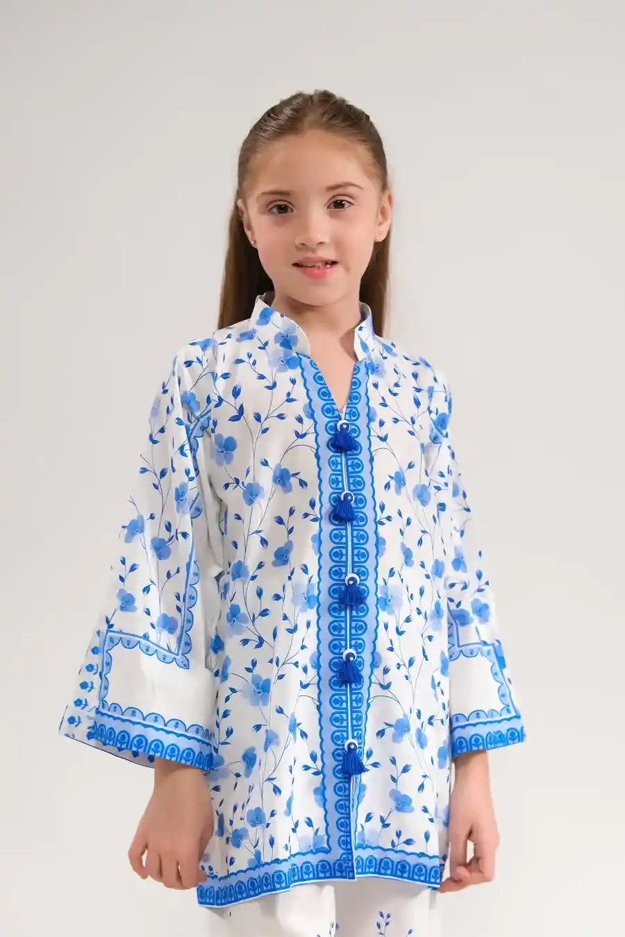 Embrace elegance with this charming blue and white two-piece set. The beautiful floral design on the top is complemented by matching pants, making it perfect for casual outings or family events. A perfect blend of style and comfort!