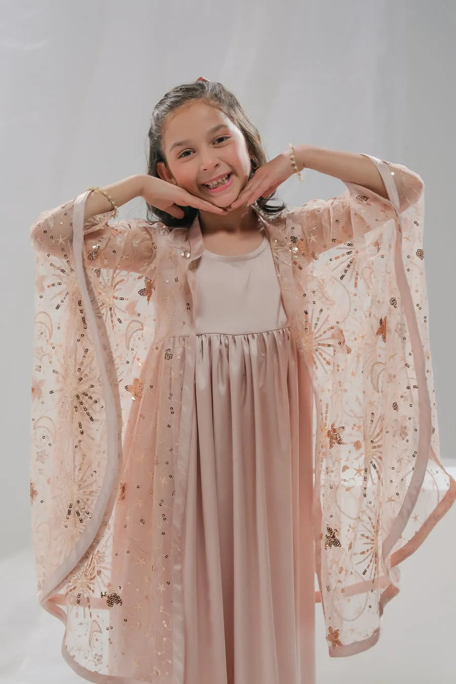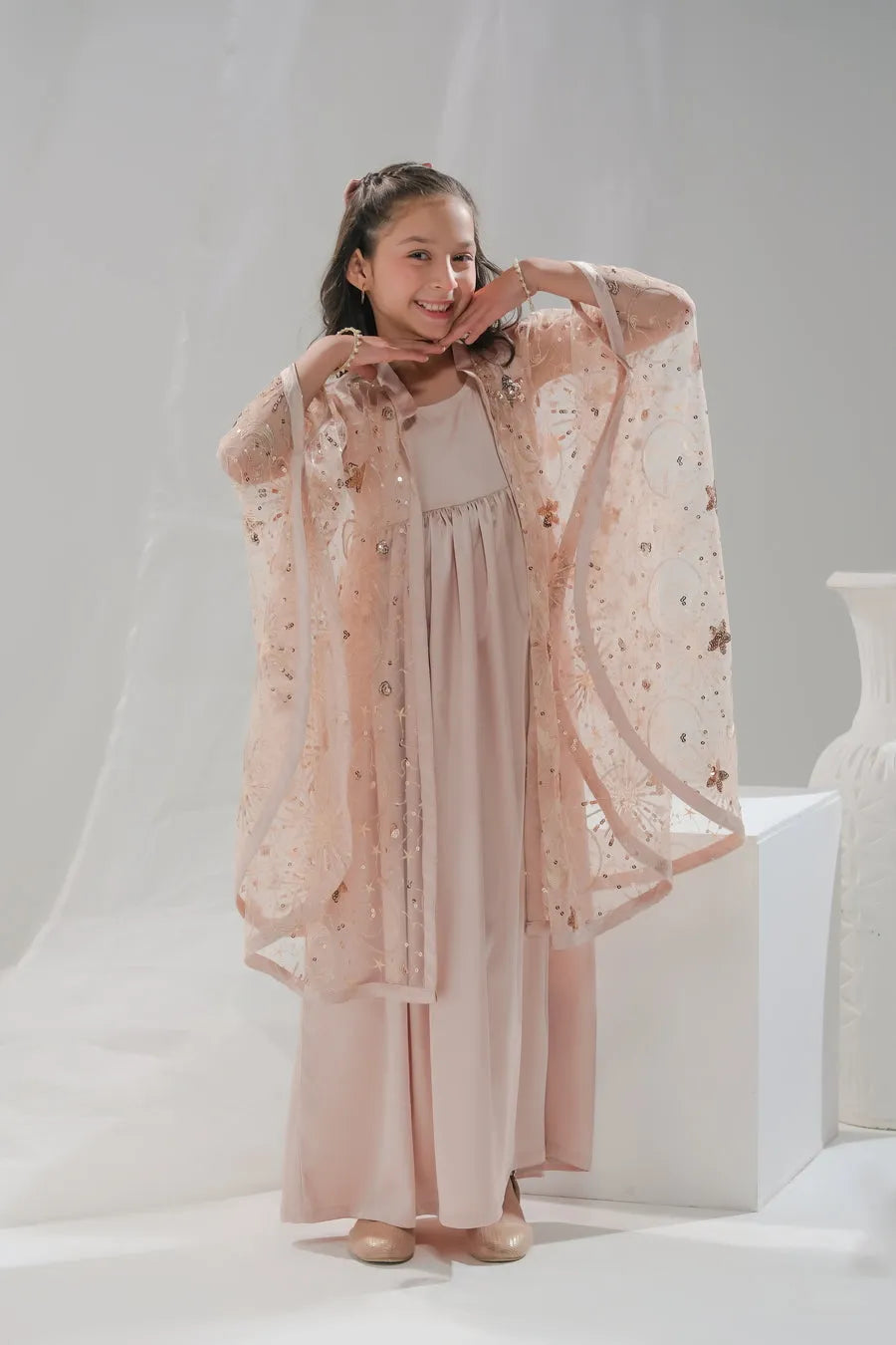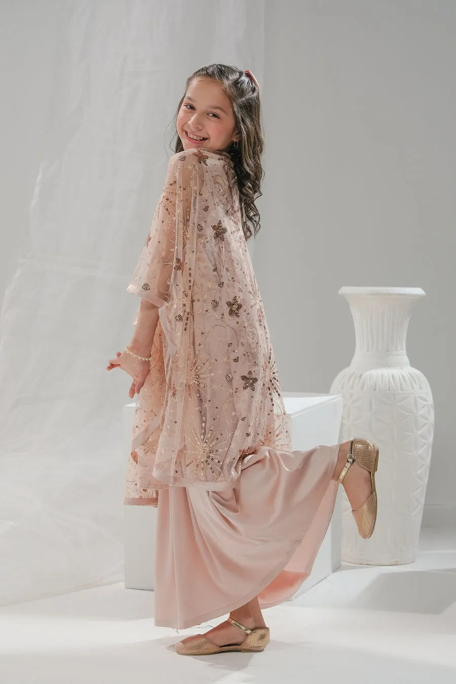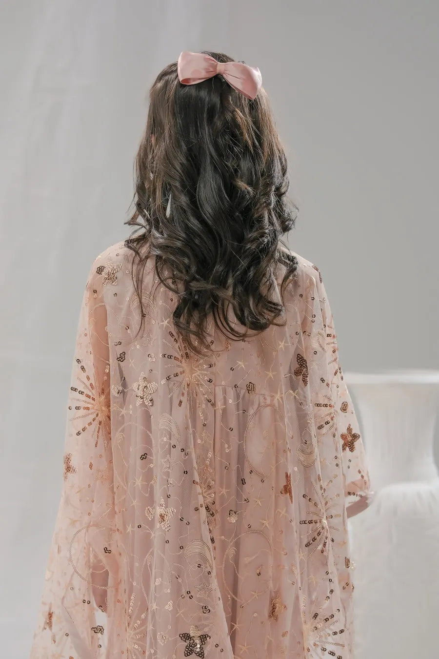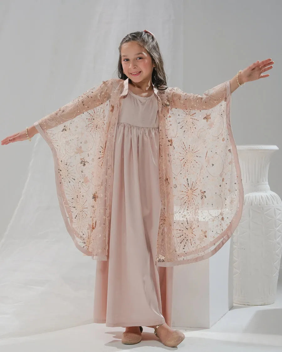 This stunning outfit features a delicate dull silk inner dress paired with a sequined net jacket, perfect for any festive occasion. The soft peach color adds charm, while intricate detailing shimmers in the light, ensuring your little one stands out beautifully.