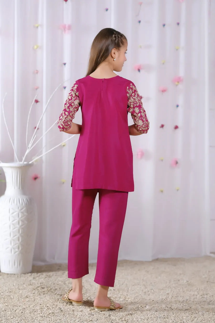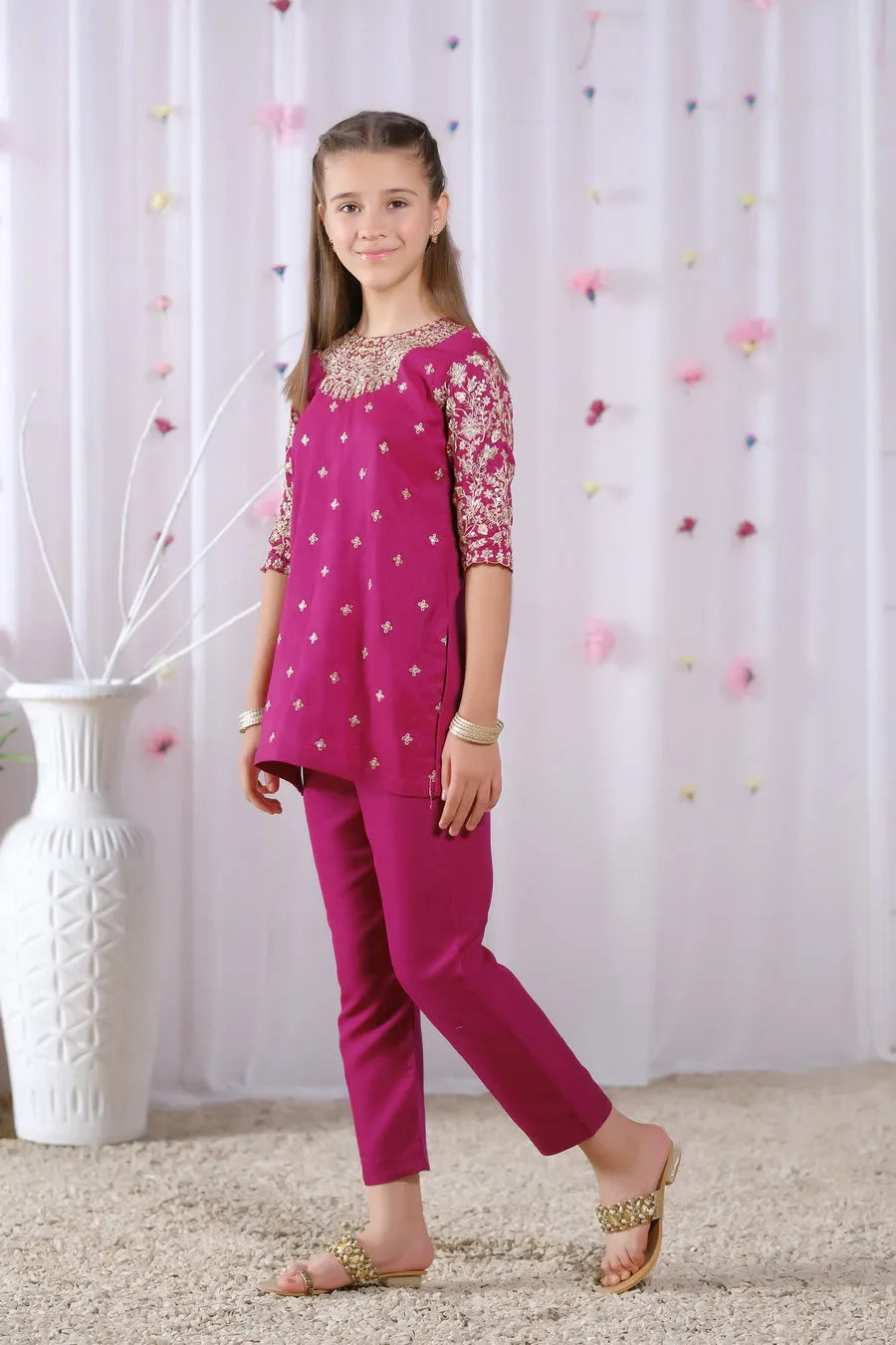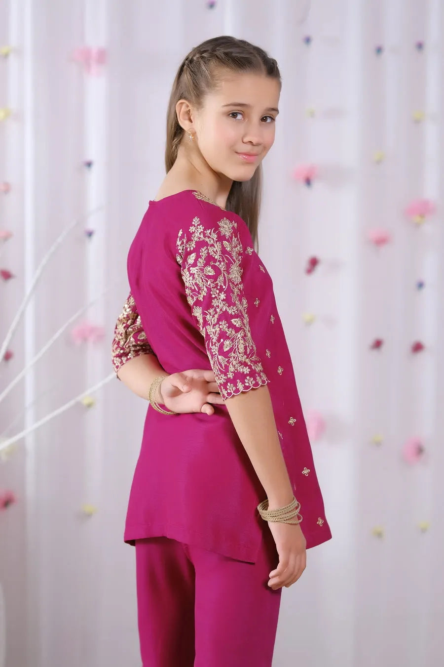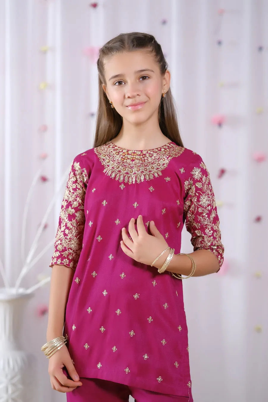 Introducing "Gulaab," a stunning light pink two-piece ensemble for girls that embodies sophistication and grace. The short-length top, embellished with intricate golden embroidery, pairs elegantly with straight pants, offering a chic and timeless look. Perfect for special occasions, "Gulaab" exudes radiance and charm, making your little one shine like a delicate rose.