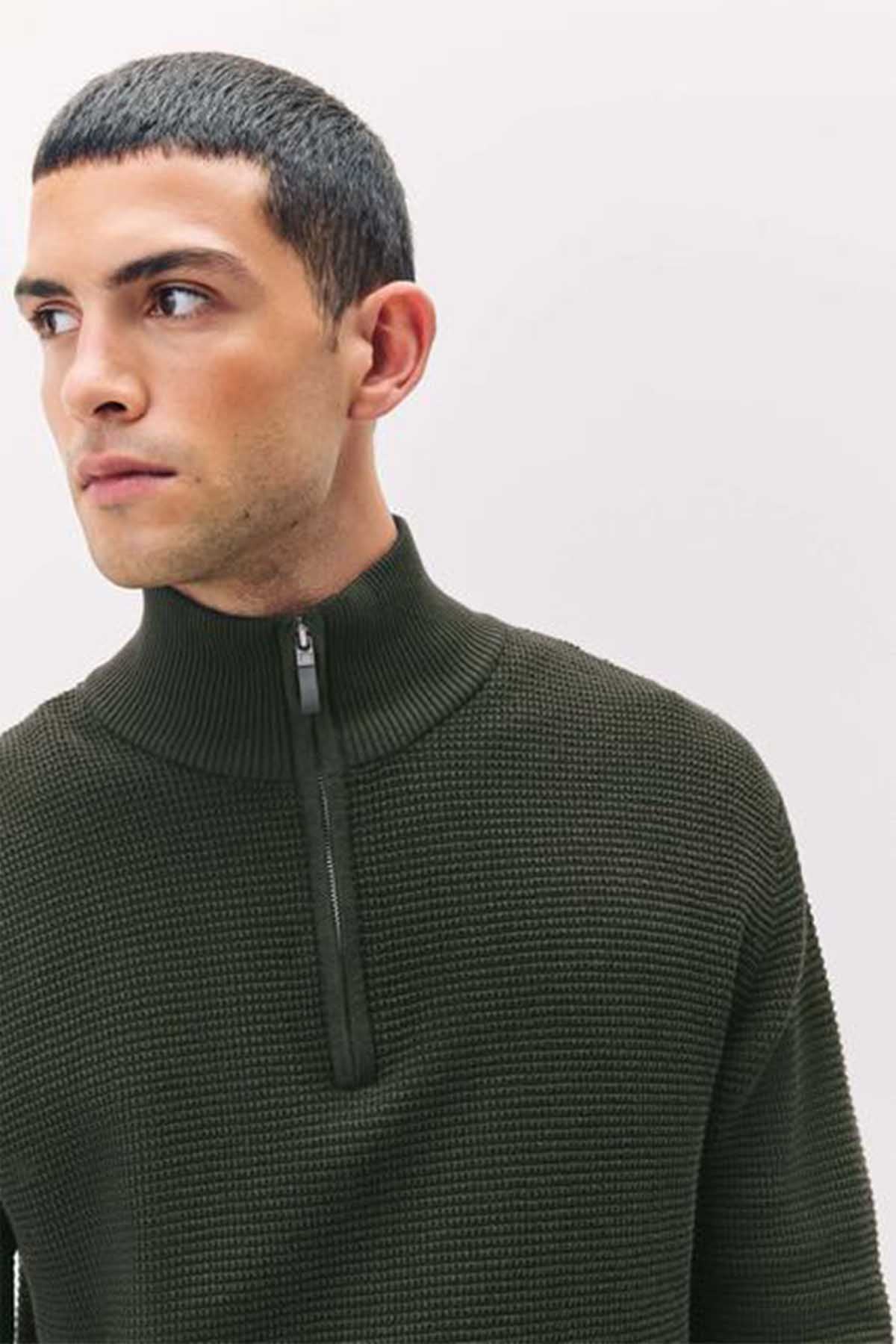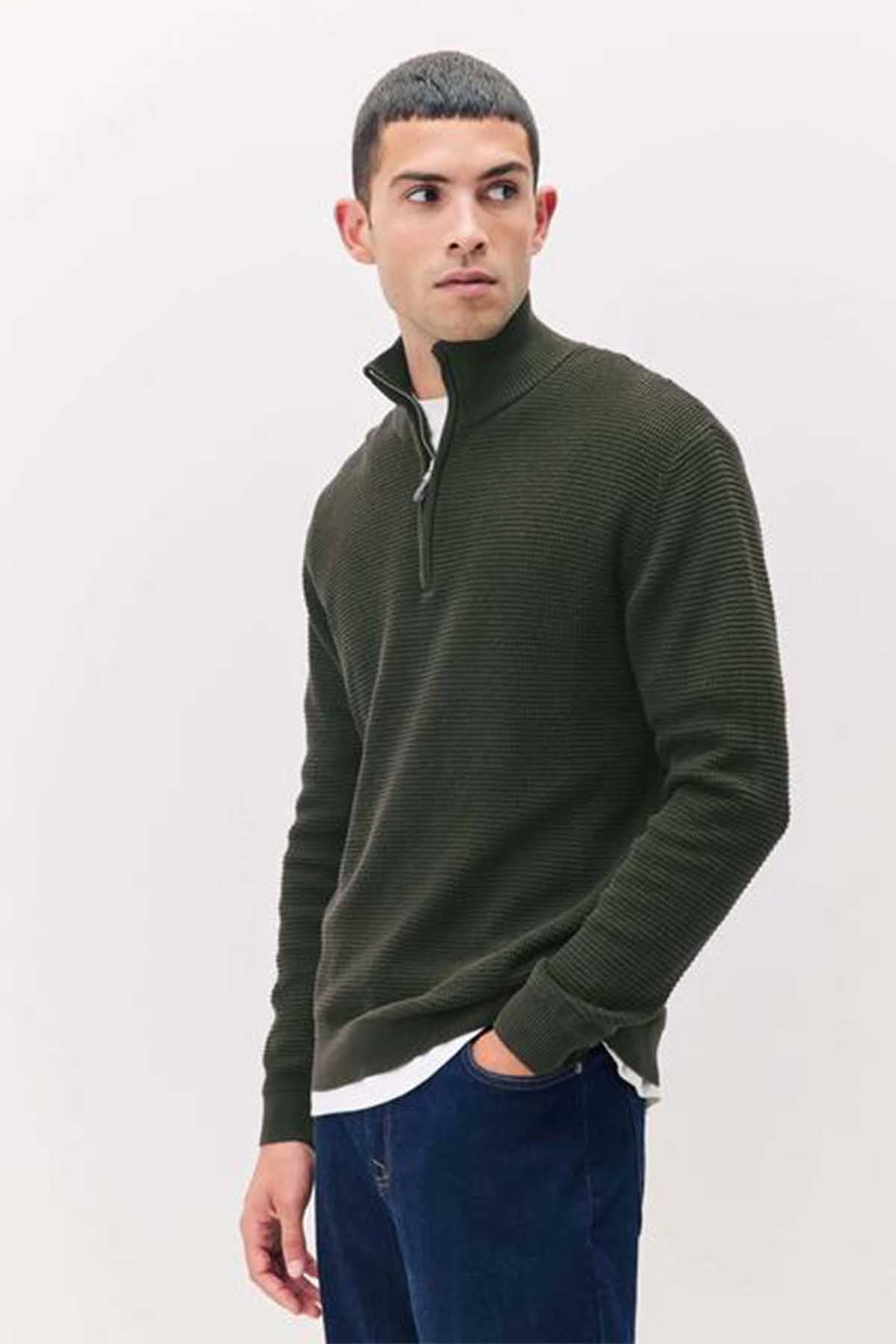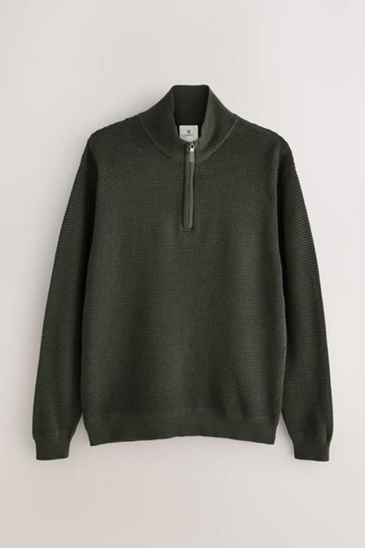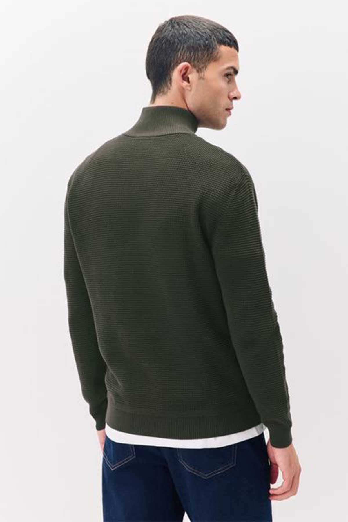 Khaki Green Plain Regular Fit Textured Premium Quarter Zip Jumper
