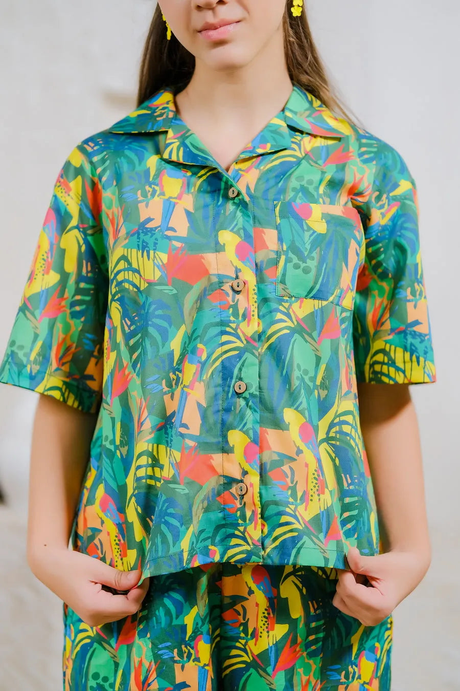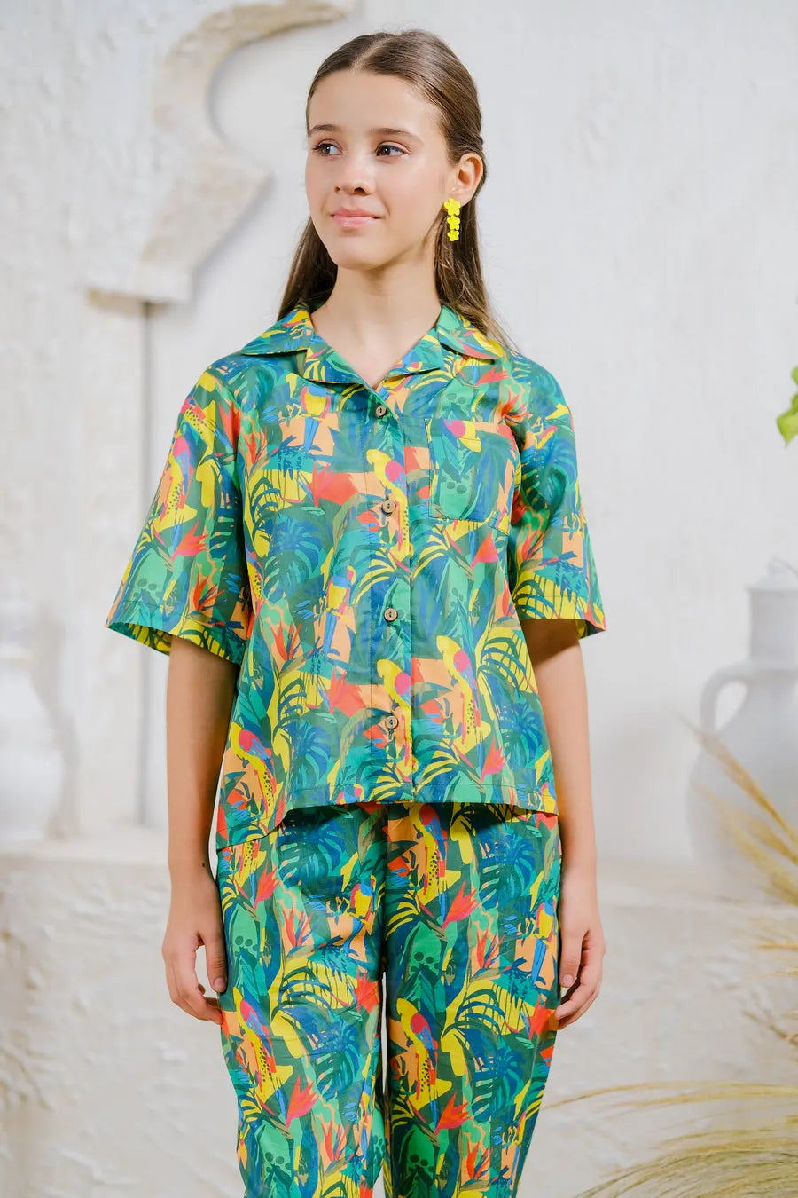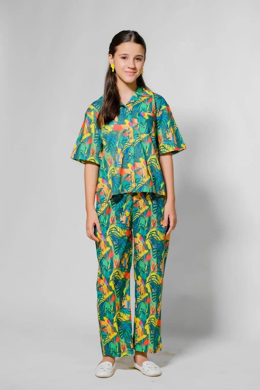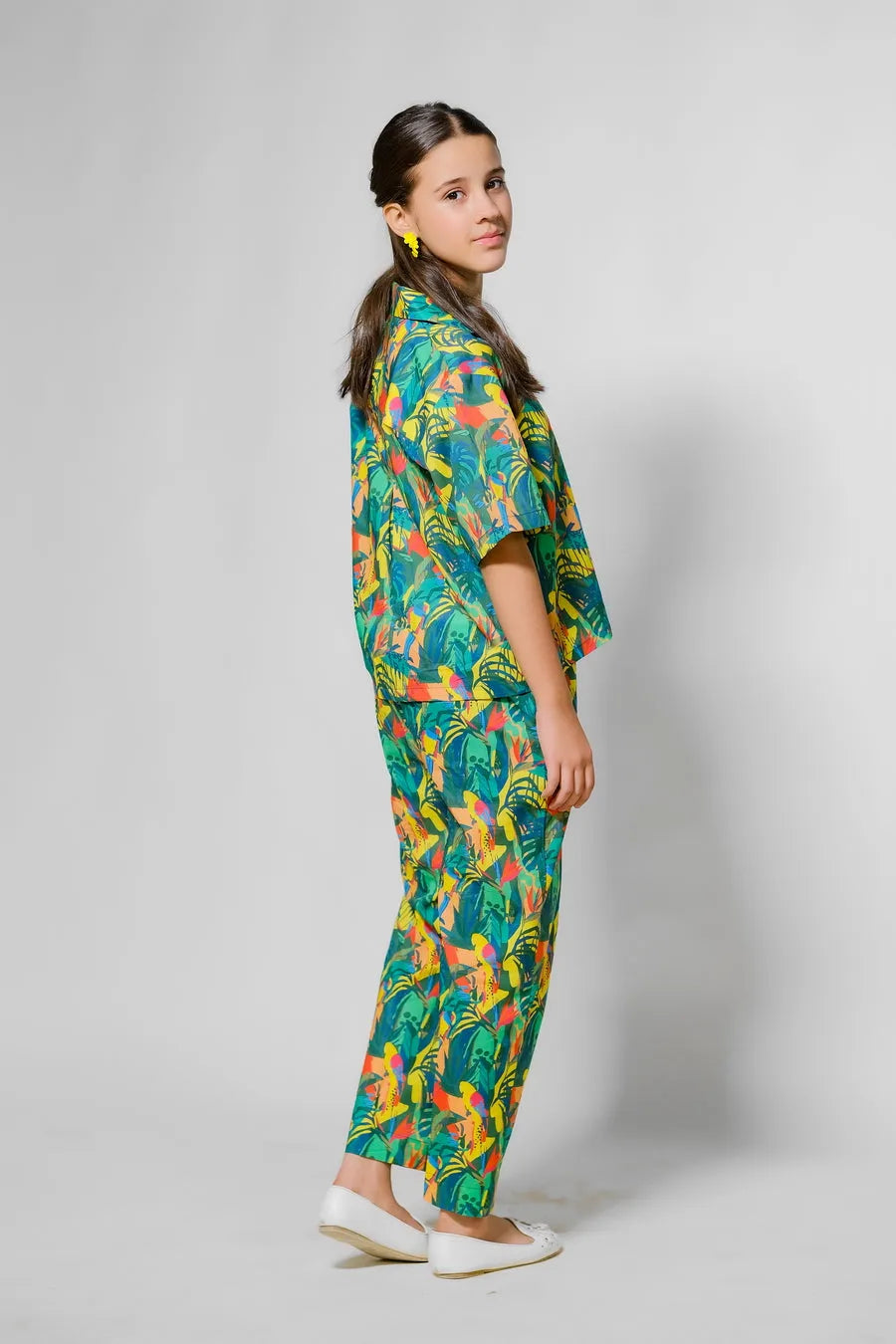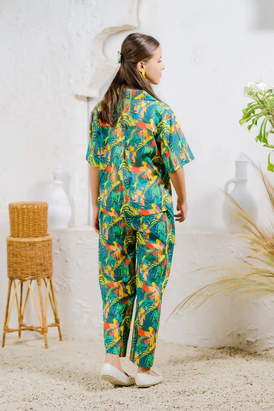 The "Rainforest Vibes" design is a vibrant explosion of deep greens, blues, and splashes of red and yellow, featuring tropical birds and foliage. This bold and dynamic pattern is ideal for girls who are full of life and love the mysteries of the jungle.