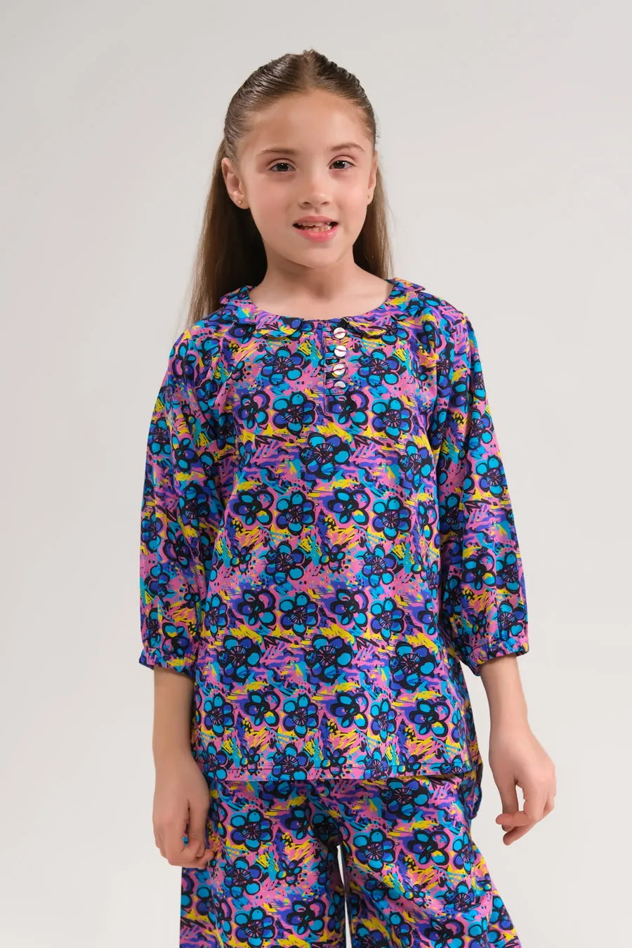 Make a bold fashion statement with this trendy navy-blue co-ord set adorned with intricate floral patterns in electric blue and purple hues. Ideal for stylish evenings or casual outings, it combines chic vibes with comfortable wear.