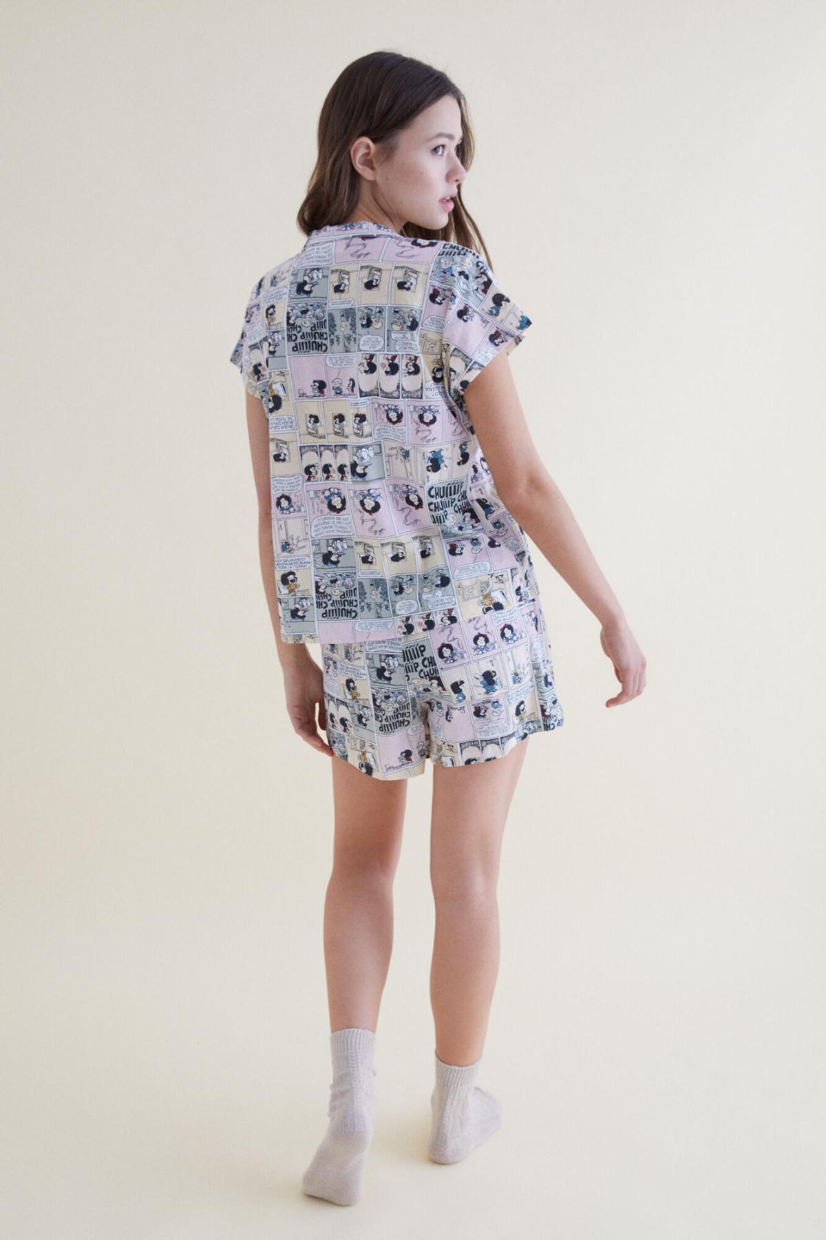 Short-sleeved shirt pajamas with dropped armholes. Made of 100% cotton. With an original print of our most famous Argentina, Mafalda appears in the form comic with his friends. With pearlescent buttons. Shorts with adjustable lacing to your liking. Combine it with sneakers from the collection!