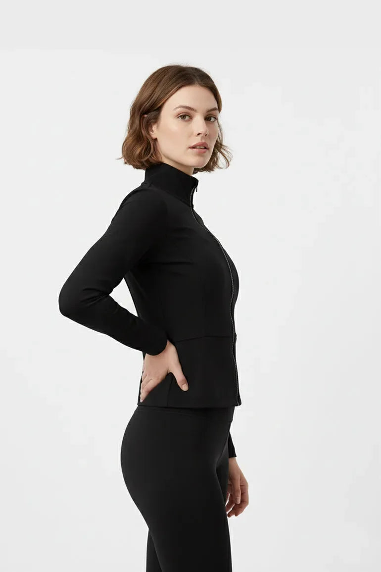 Stay sleek and comfortable with this zip-up activewear jacket, designed for a flattering fit and everyday movement. Made from smooth, stretch-knit fabric, it offers flexibility and a soft touch against the skin. The high neck and contoured seams create a streamlined look perfect for workouts, layering, or casual wear.
