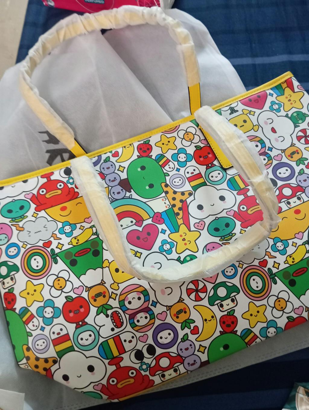 - Multicolor cartoon printed leather tote bag in 4 different strap color variations. Golden metallic zipped closure. Stable base of black leather. Single huge compartment with two slip in small pockets and one zipped pocket. Durable lined interior.