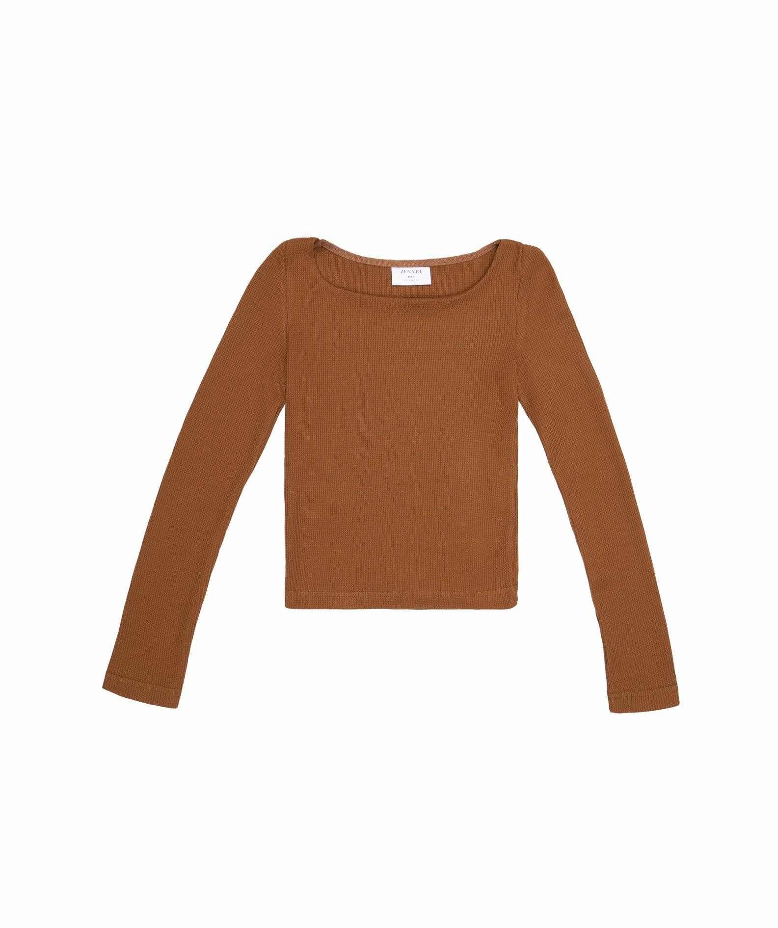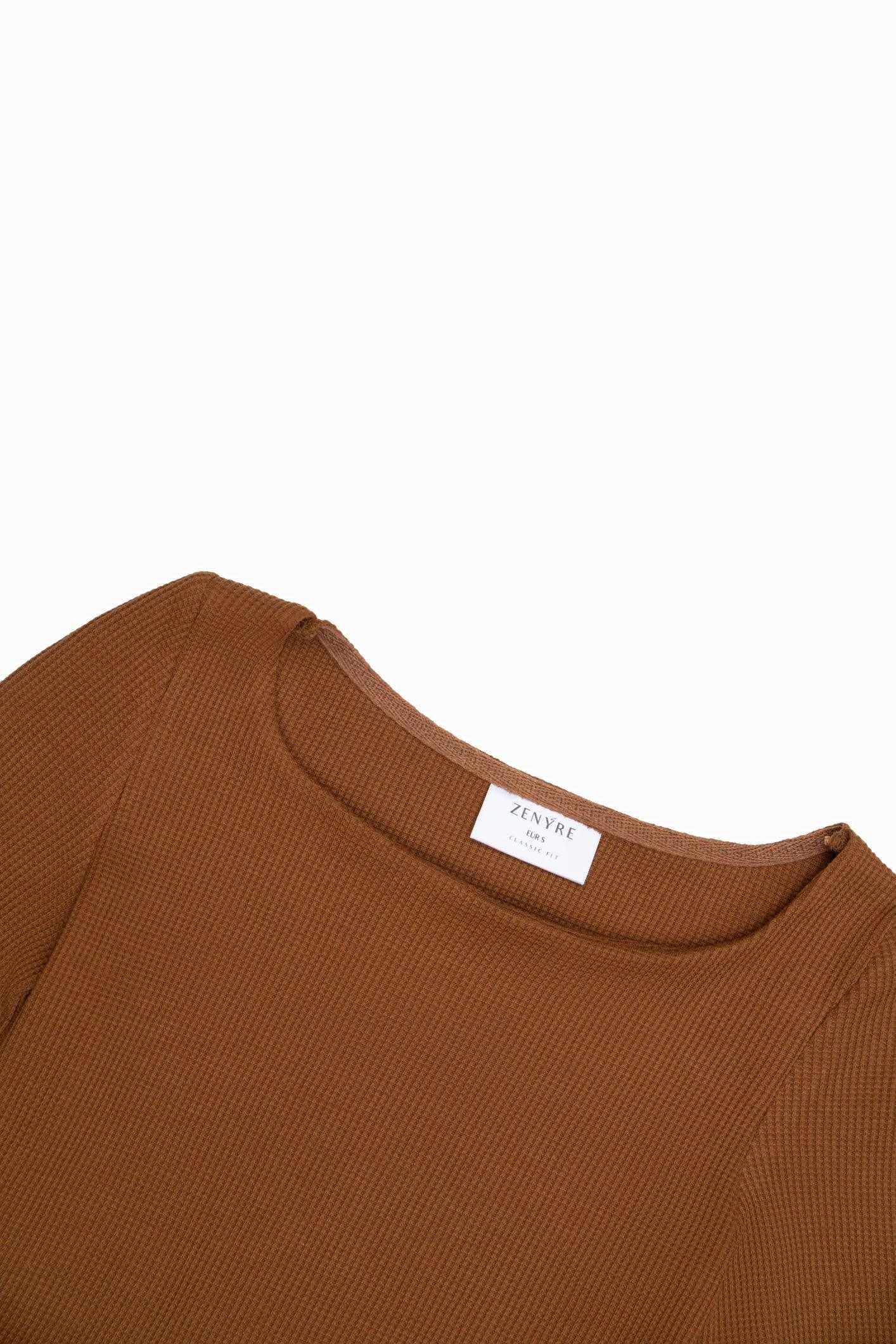 Waffle boat neck shirt with full sleeves. Textured fabric and elegant neckline. Perfect for a chic, casual look.