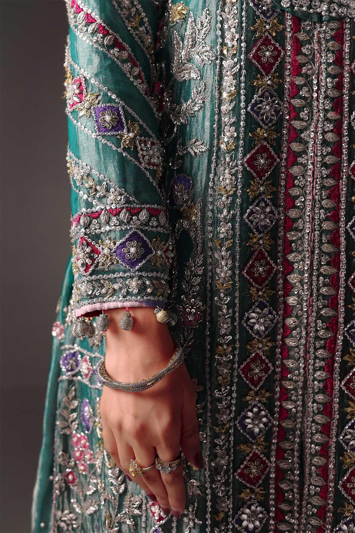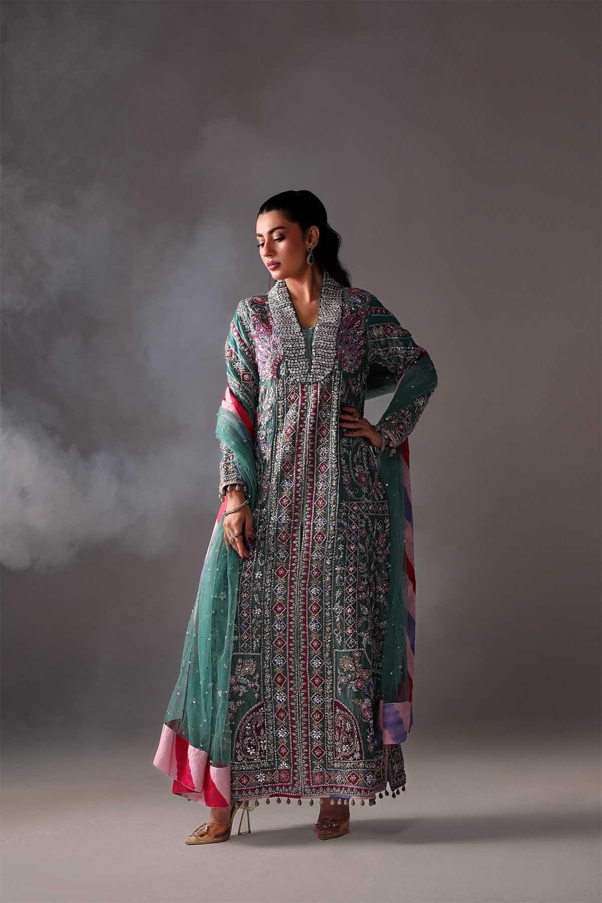 Elia Is A Luxurious Emerald Green Tissue Ensemble, Crafted With Refined Elegance And Superior Craftsmanship. The Stunning Shirt Features Rich Embroidery, Applique Work, Crystals, Naqshi, And Cutdana, Establishing A Luminous, High-End Formal Appearance. Paired With Raw Silk Pants And A Matching Net Dupatta, This Meticulously Detailed Outfit Offers A Graceful, Structured Silhouette, Making It Perfect For Premium Festive And Evening Occasions.