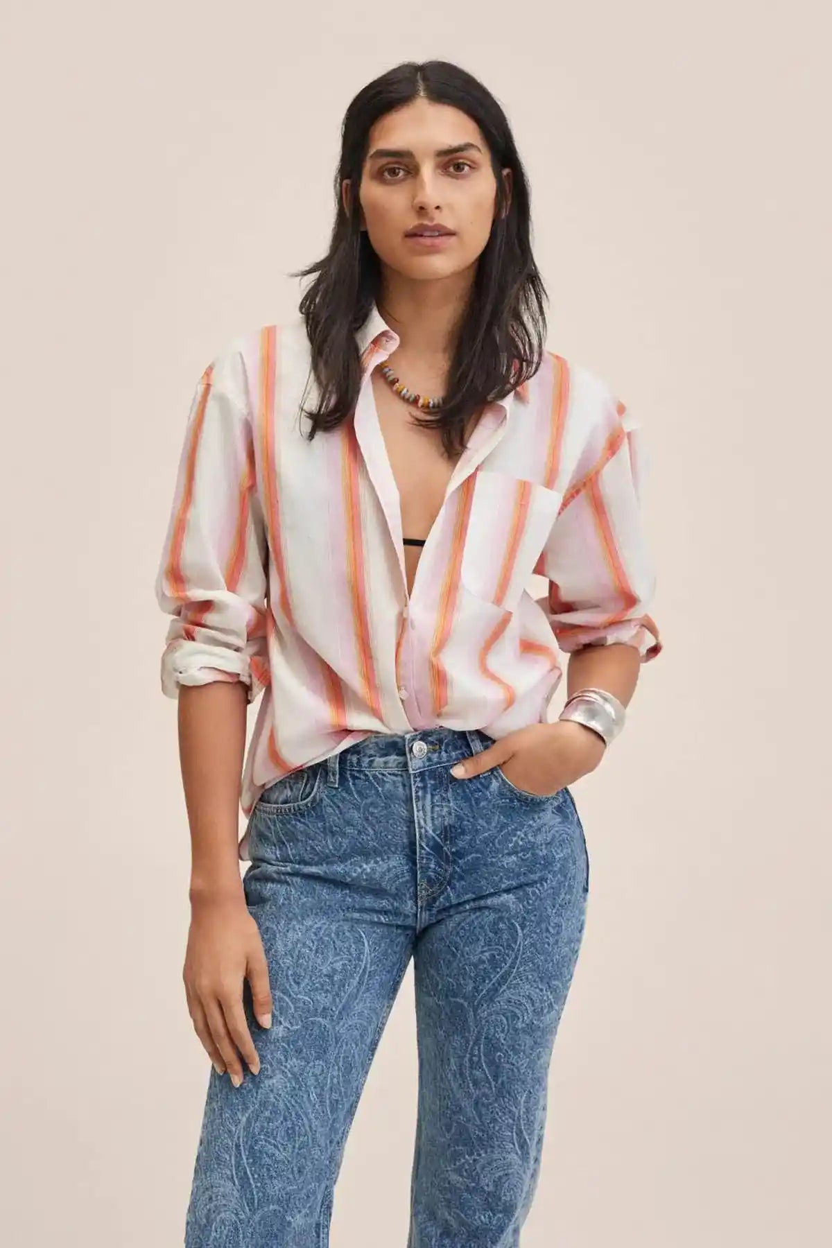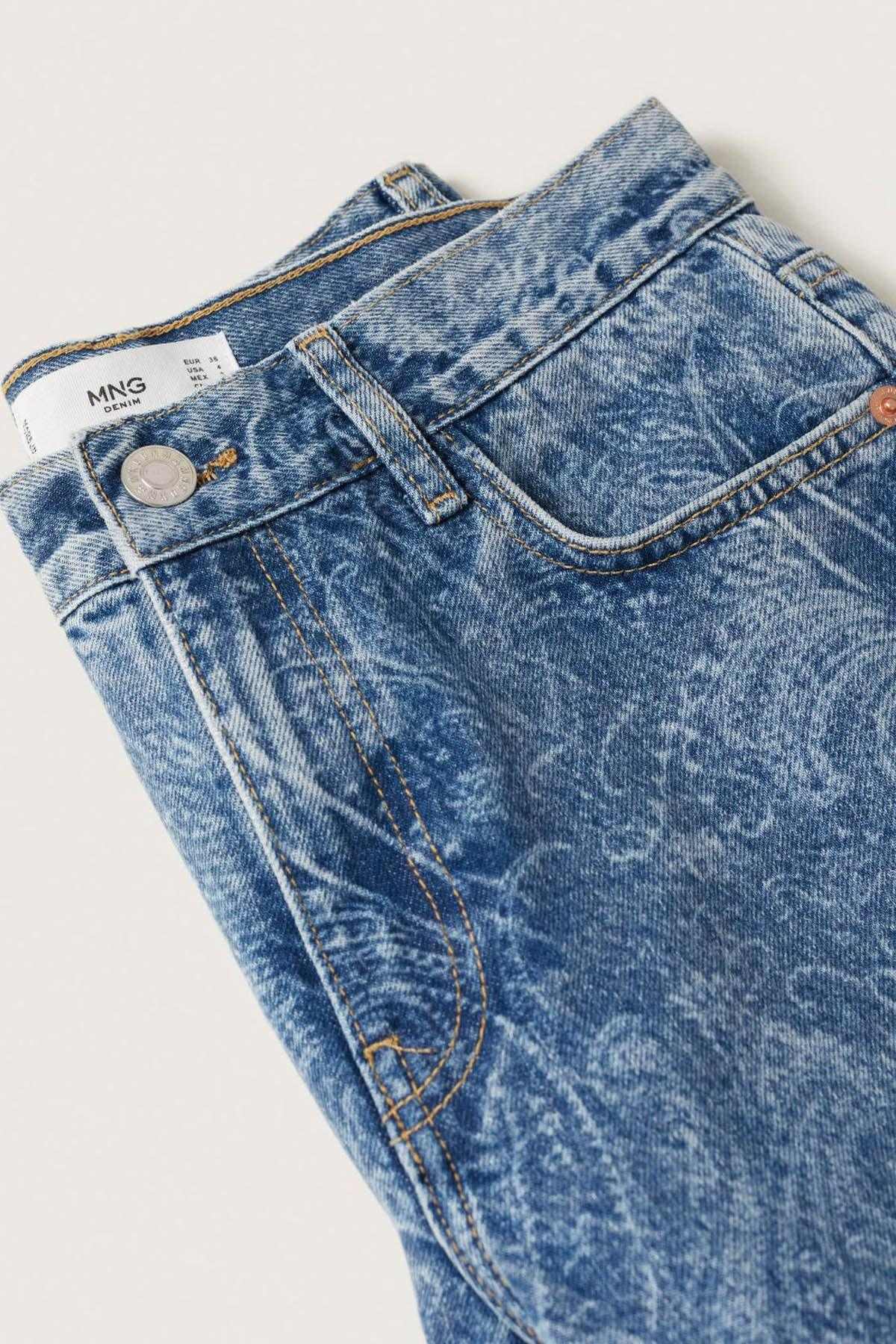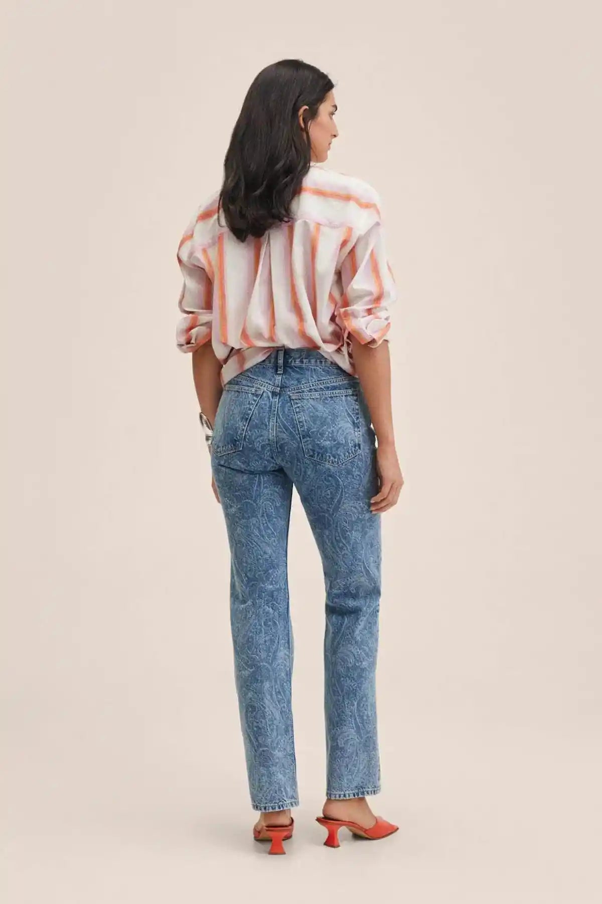 Denim style cotton fabric. Recycled cotton-blend fabric. Paisley print. Straight design. Long design. Medium waist. Loops. Five pockets. Zip and one button fastening.