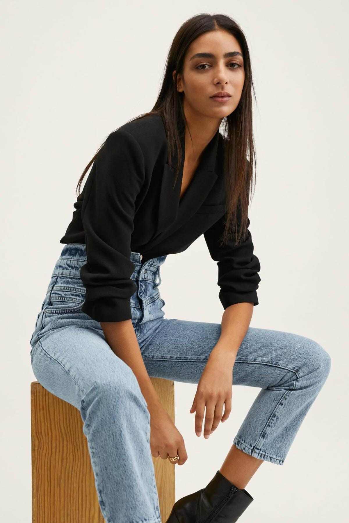 Committed Collection. Ankle brace. Medium. Recycled cotton-blend fabric. Mom-fit. Double-waist design. Cropped design. High waist. Two front pockets. Back pockets. Zip and one button fastening.