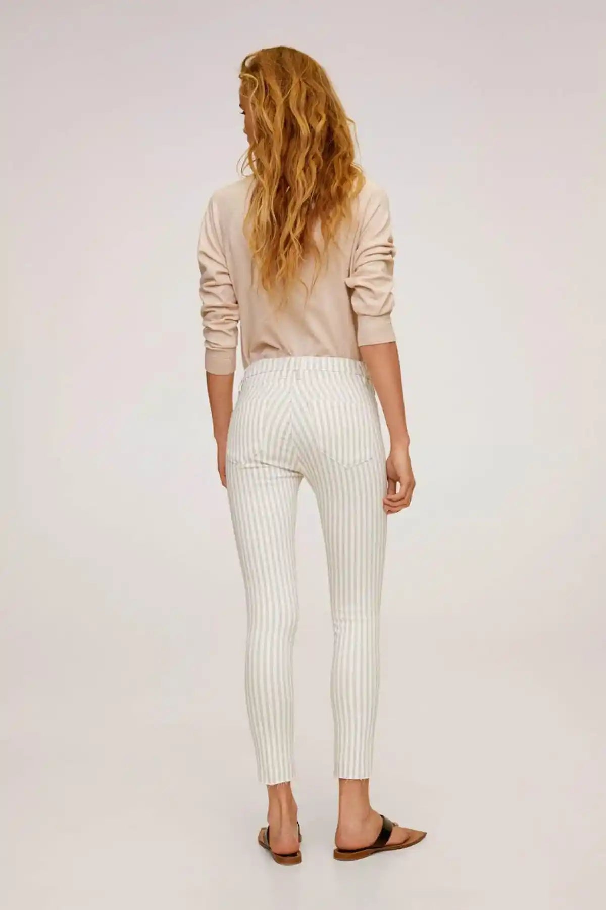 Cropped design, skinny fit, medium waist, sustainable cotton, denim style cotton fabric, stretch cotton fabric, stripped fabric, two side pockets, coin pocket, two patch pockets on the back, loops, zip and one button fastening.