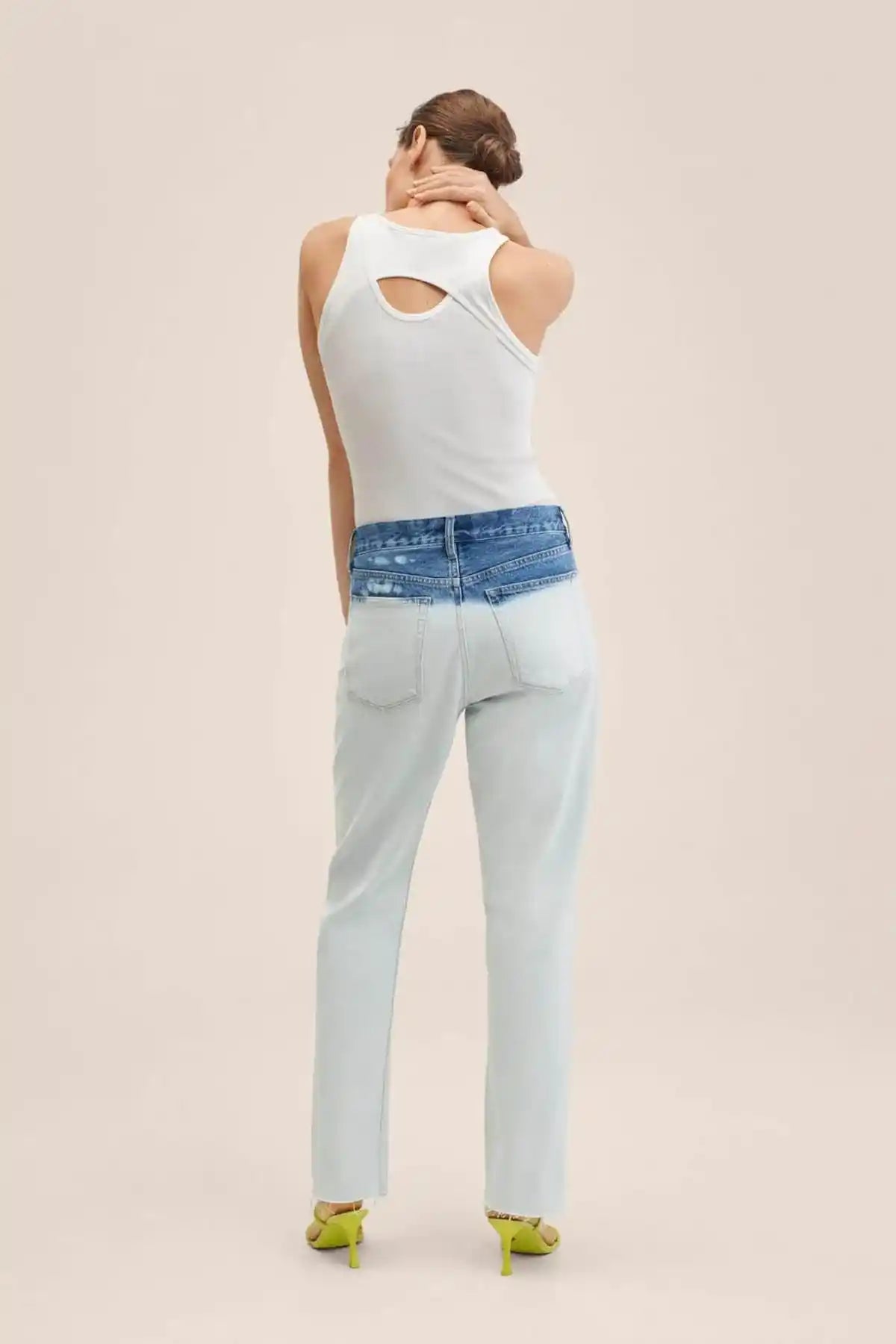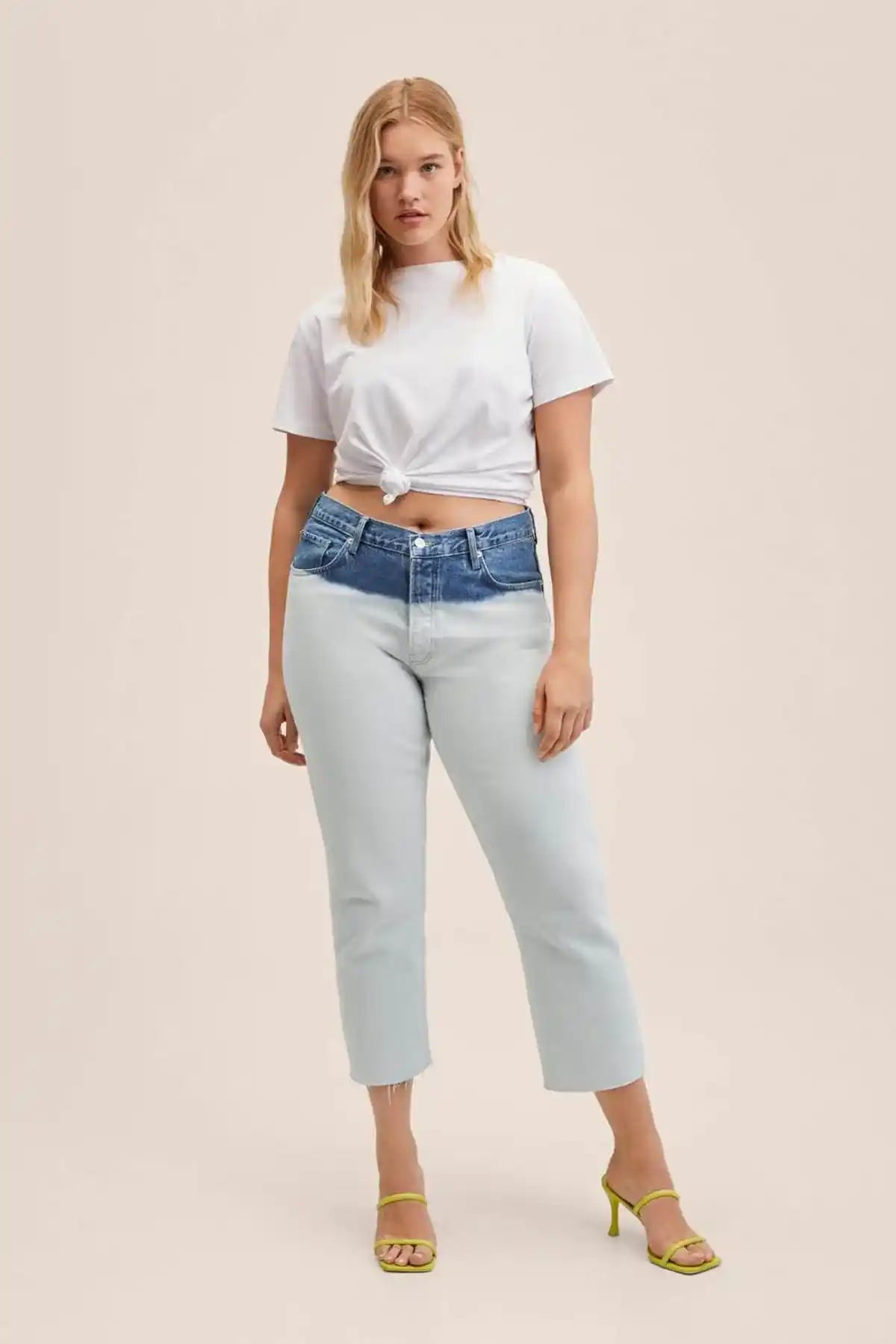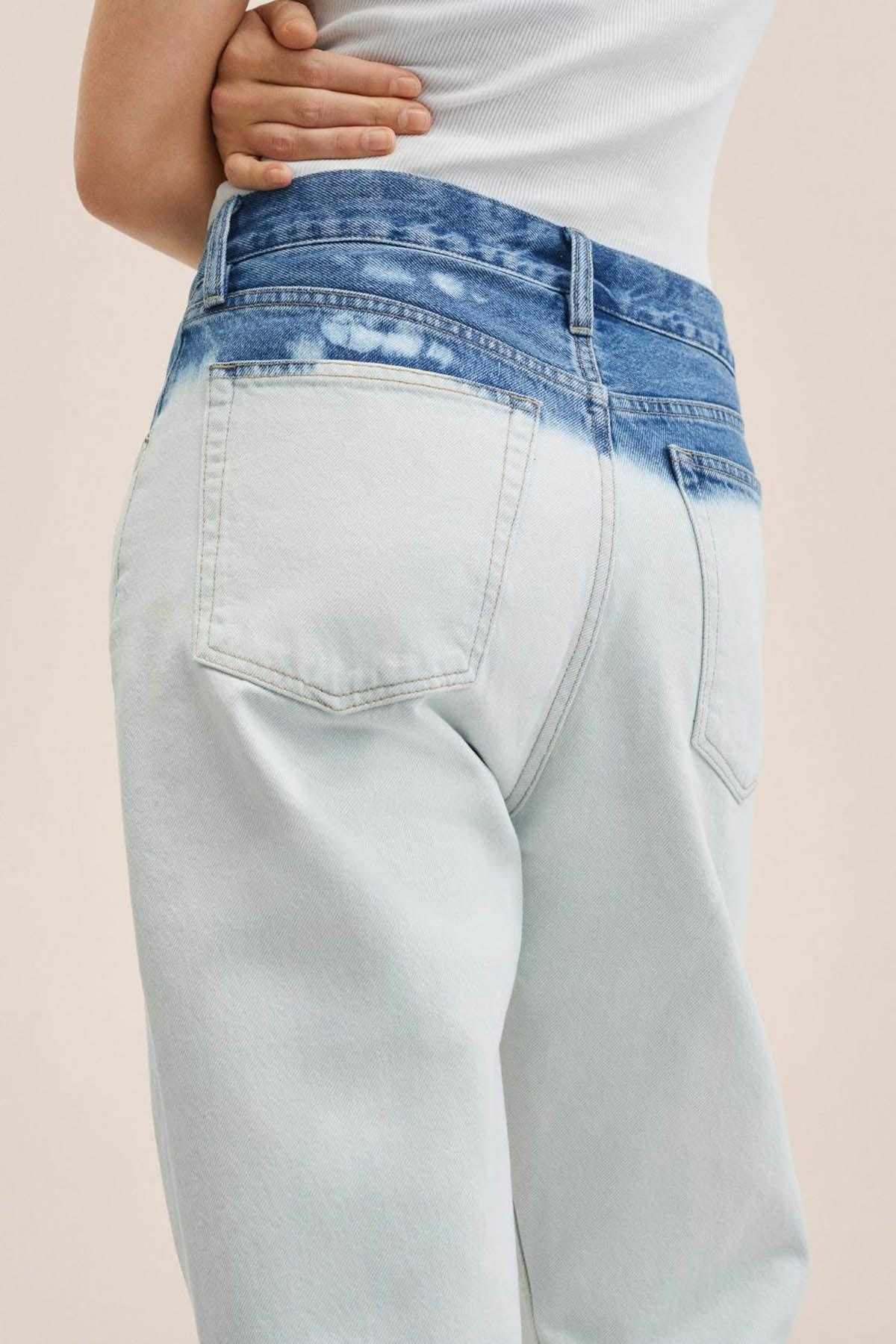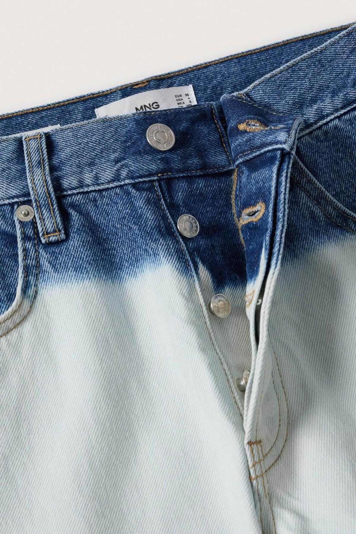 Denim style cotton fabric. Tie-dye print. Straight design. Cropped design. High waist. Five pockets. Loops. Concealed button fastening.