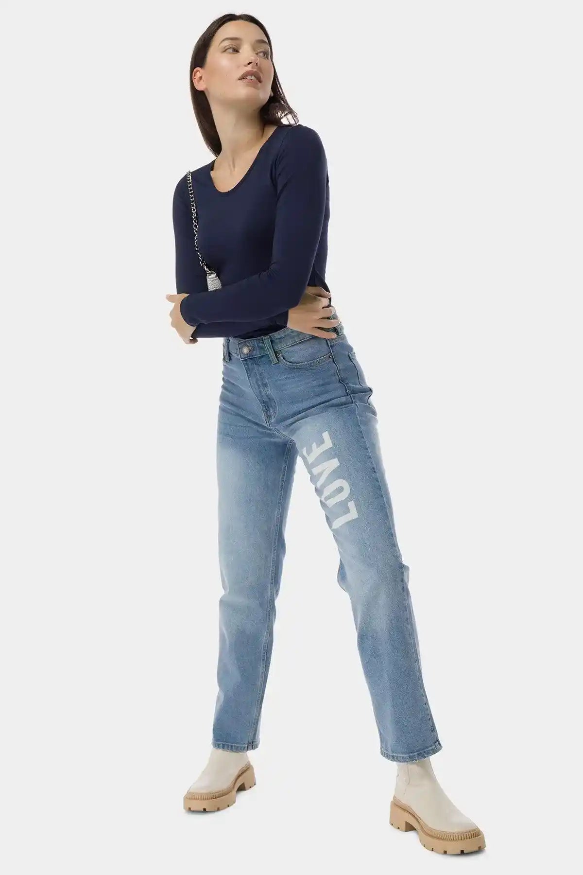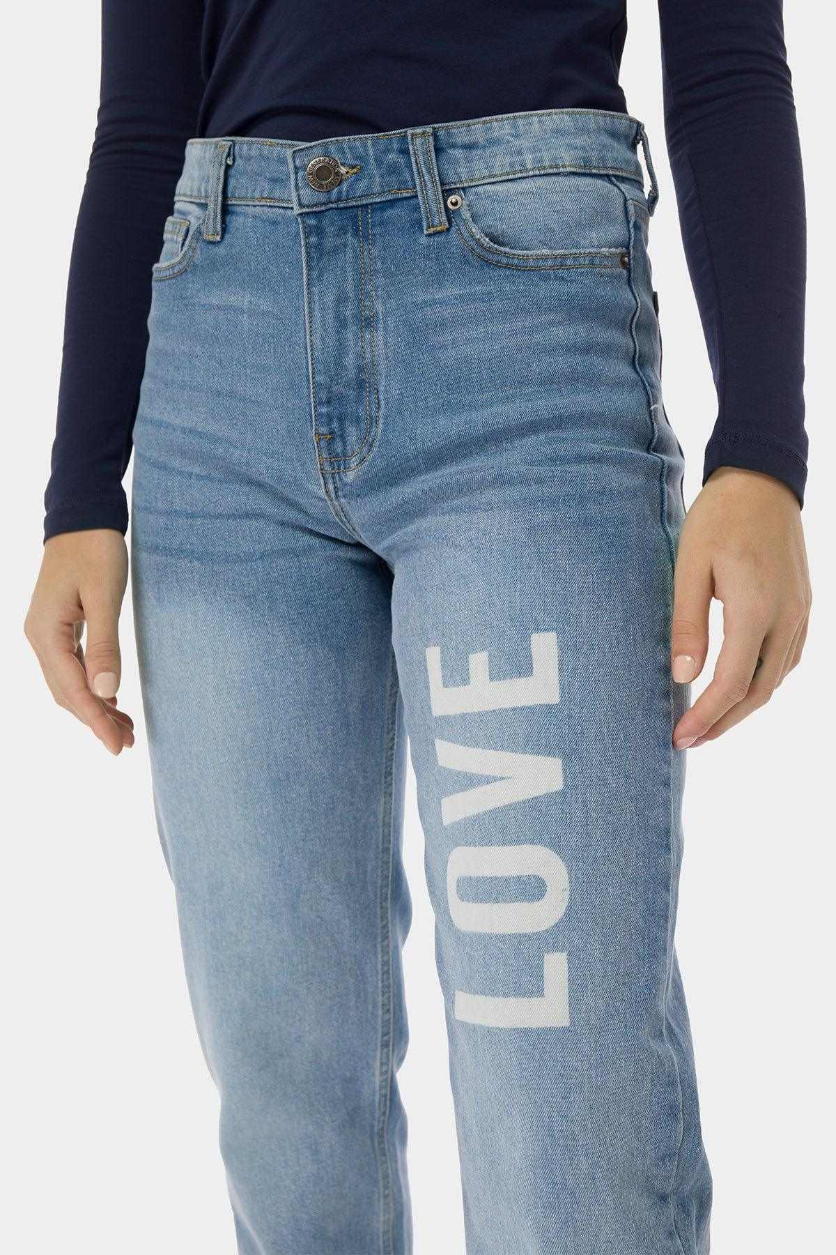 Berlin Collection- High Waisted Love Slogan Denim Jeans With Regular Waist Band. Metal Bronze Rivets. Centre Front Button And Loops. Front Slash Pockets. Single Coin Pocket. Contrast Seam Details. Back Yoke And Patch Pockets. Straight Hem.