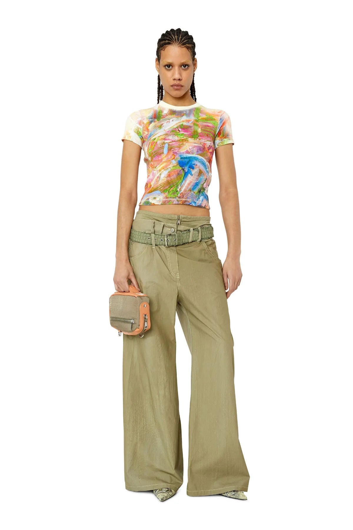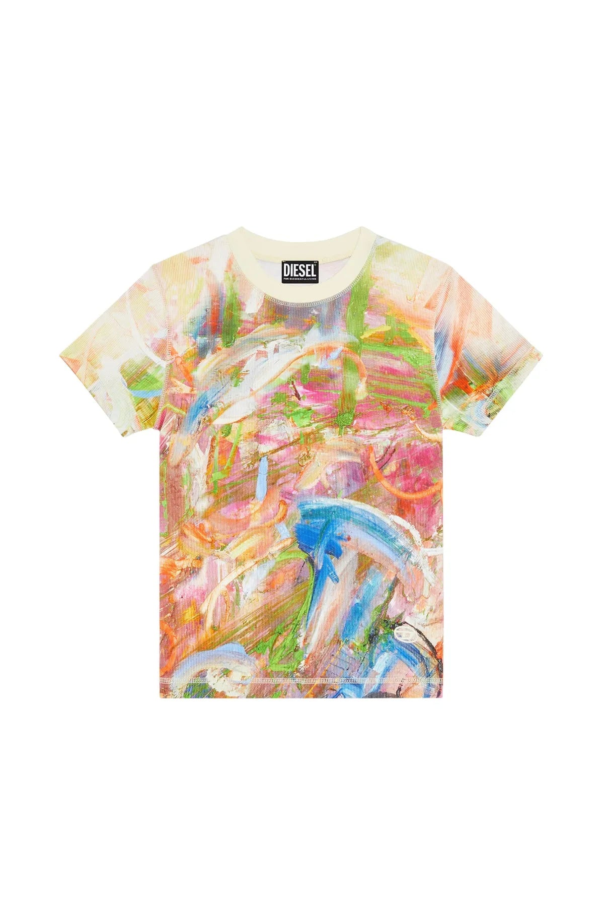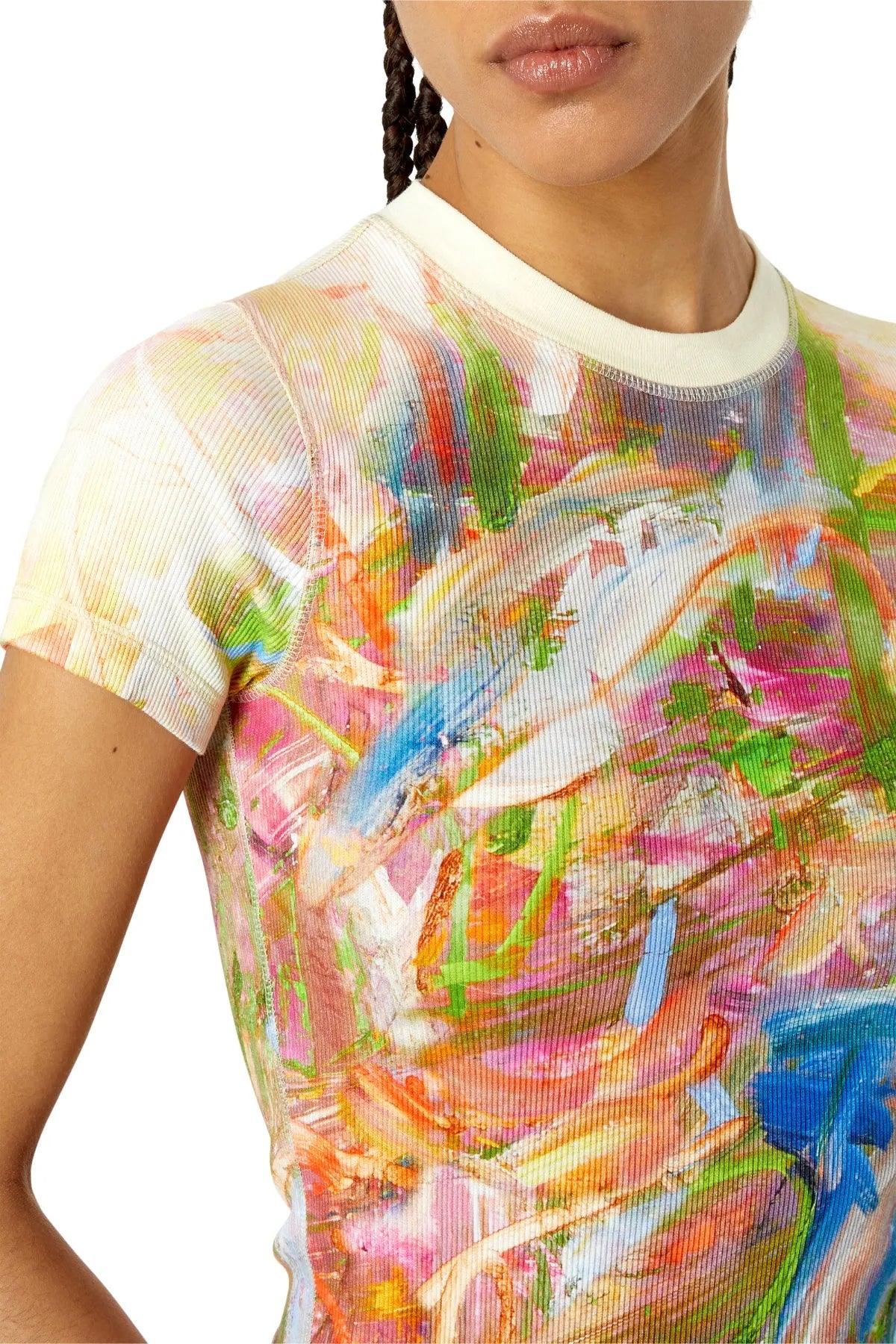 Made from ribbed stretch cotton jersey, this women's T-shirt is a fitted style printed all-over with a multicolor abstract pattern. Fading across the shoulders creates a sun-bleached effect.