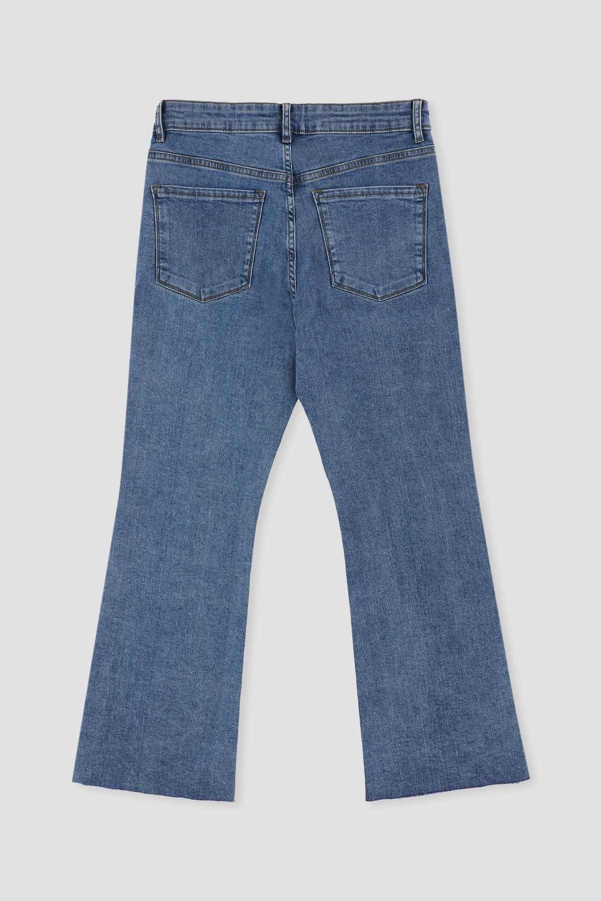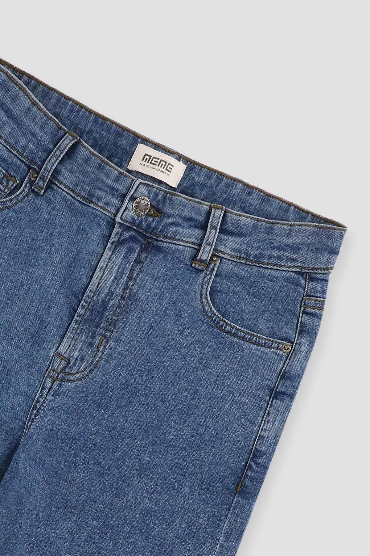 98% Cotton 2% Elastane. Classic Medium Wash Denim Jeans Featuring Waistband With Button And Loops. Rear Yoke And Patch Pockets. Contrast Seam Details. Wide Hem