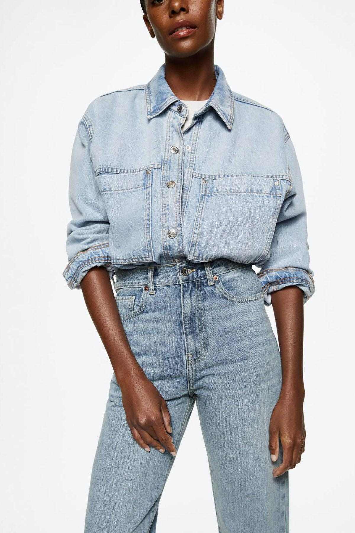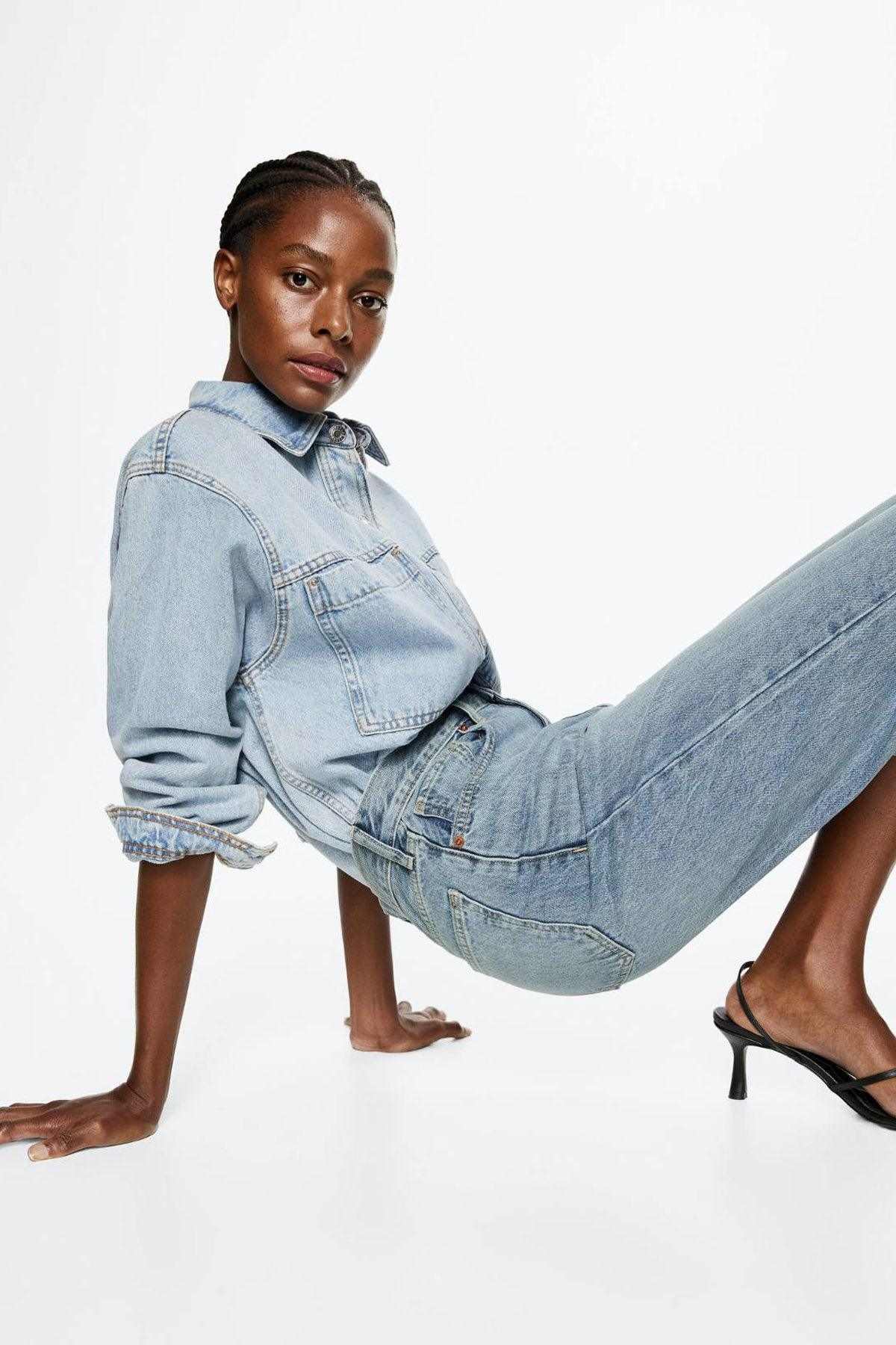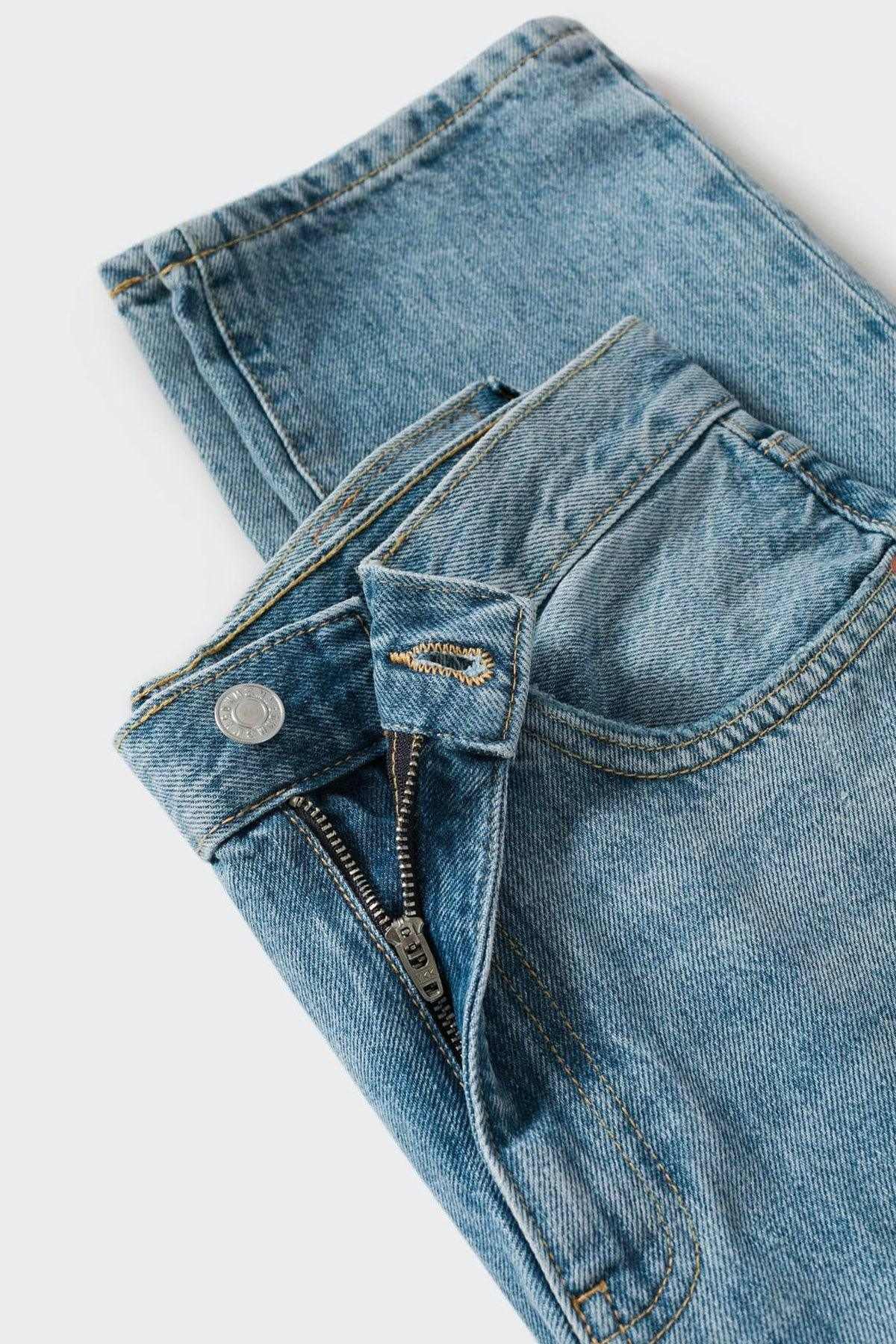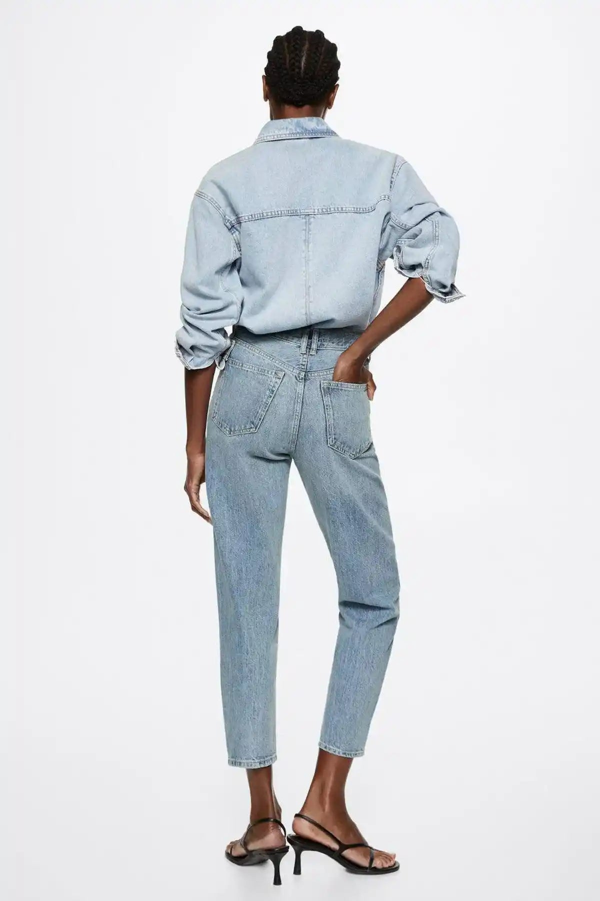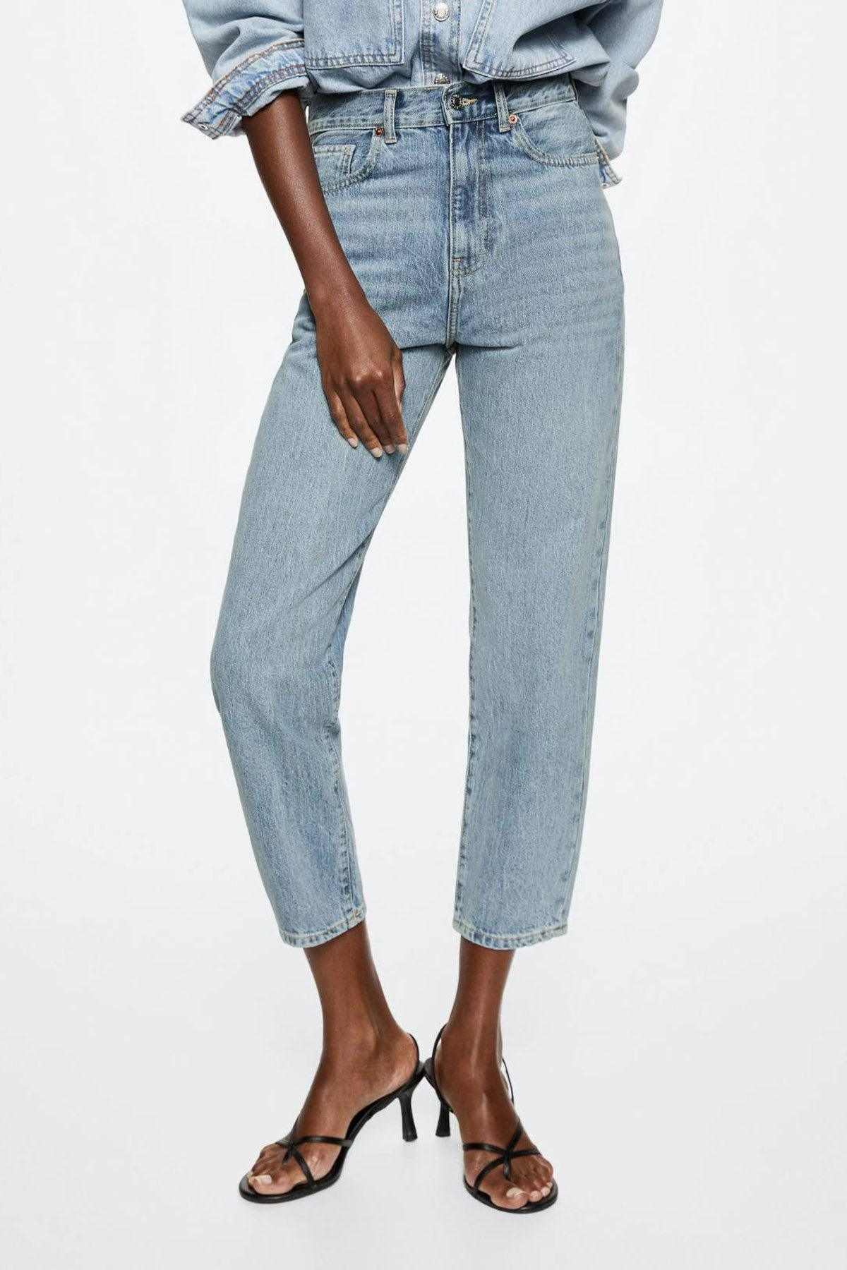 Denim style cotton fabric. High waist. Mom-fit. Five pockets. Zip and one button fastening. Loops. Inseam 66 cm.