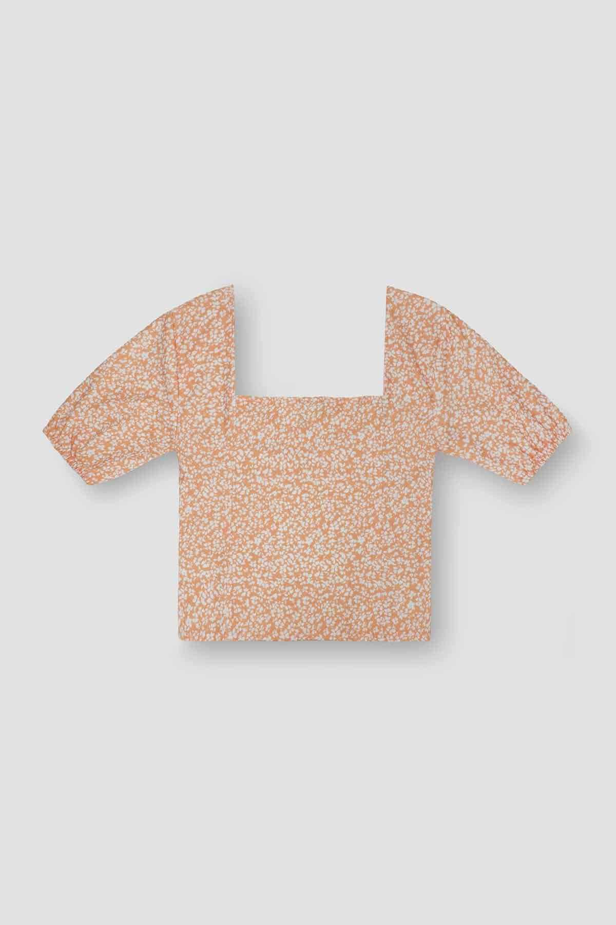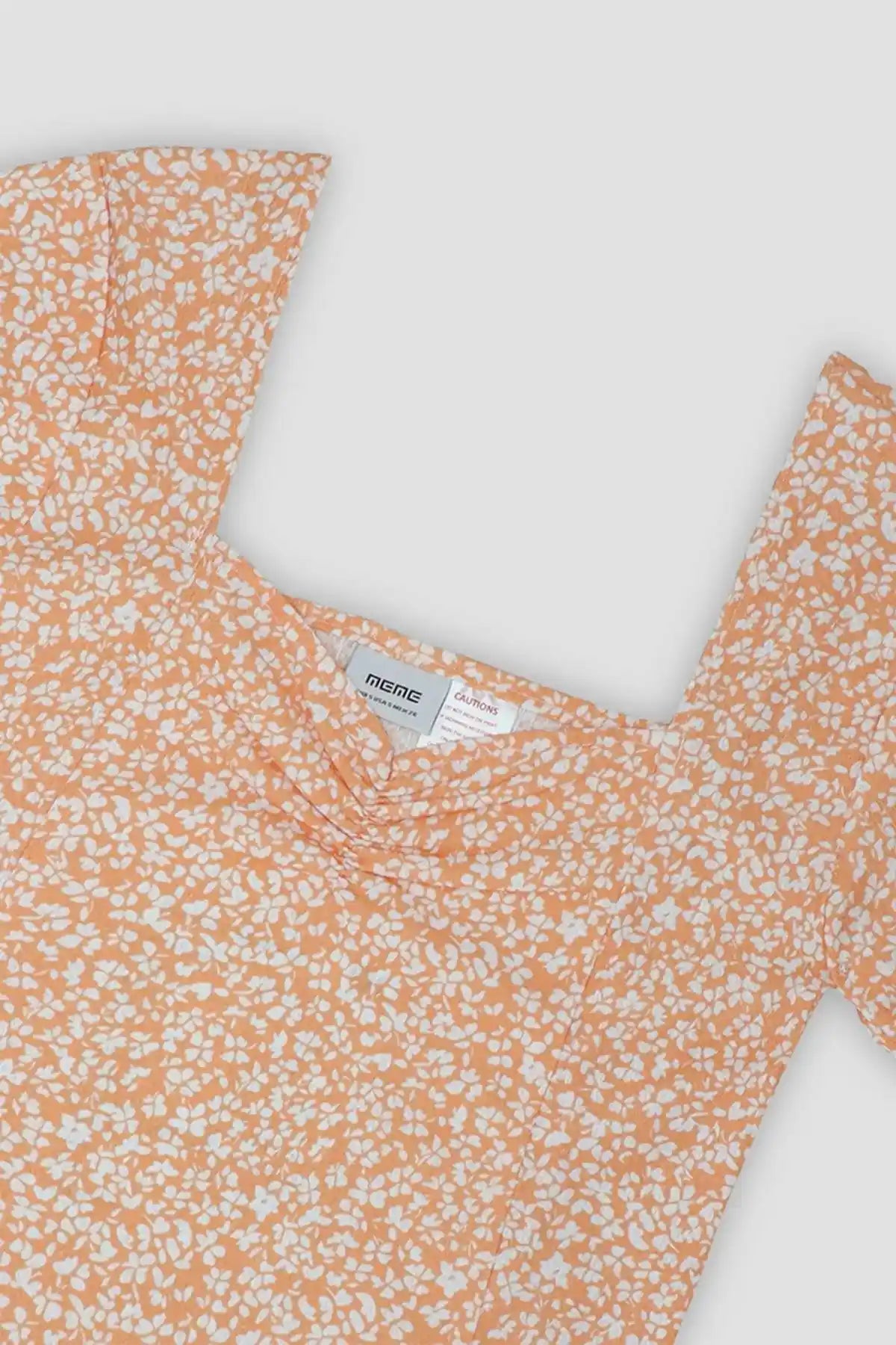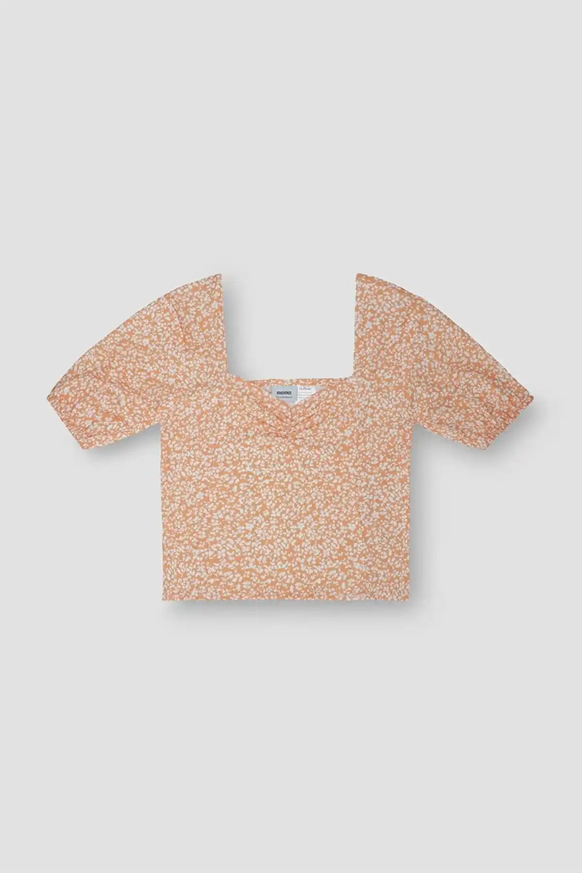 90% Polyester 10% Elastane. Printed top. sweetheart neckline with short sleeves with elastic at hem. Featuring chest gatherings. Model’s height: 5'7ft, Model’s size: Small.