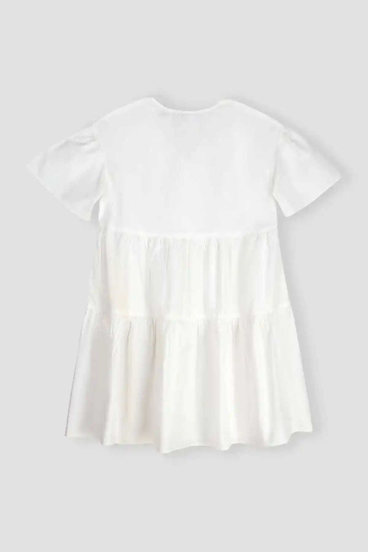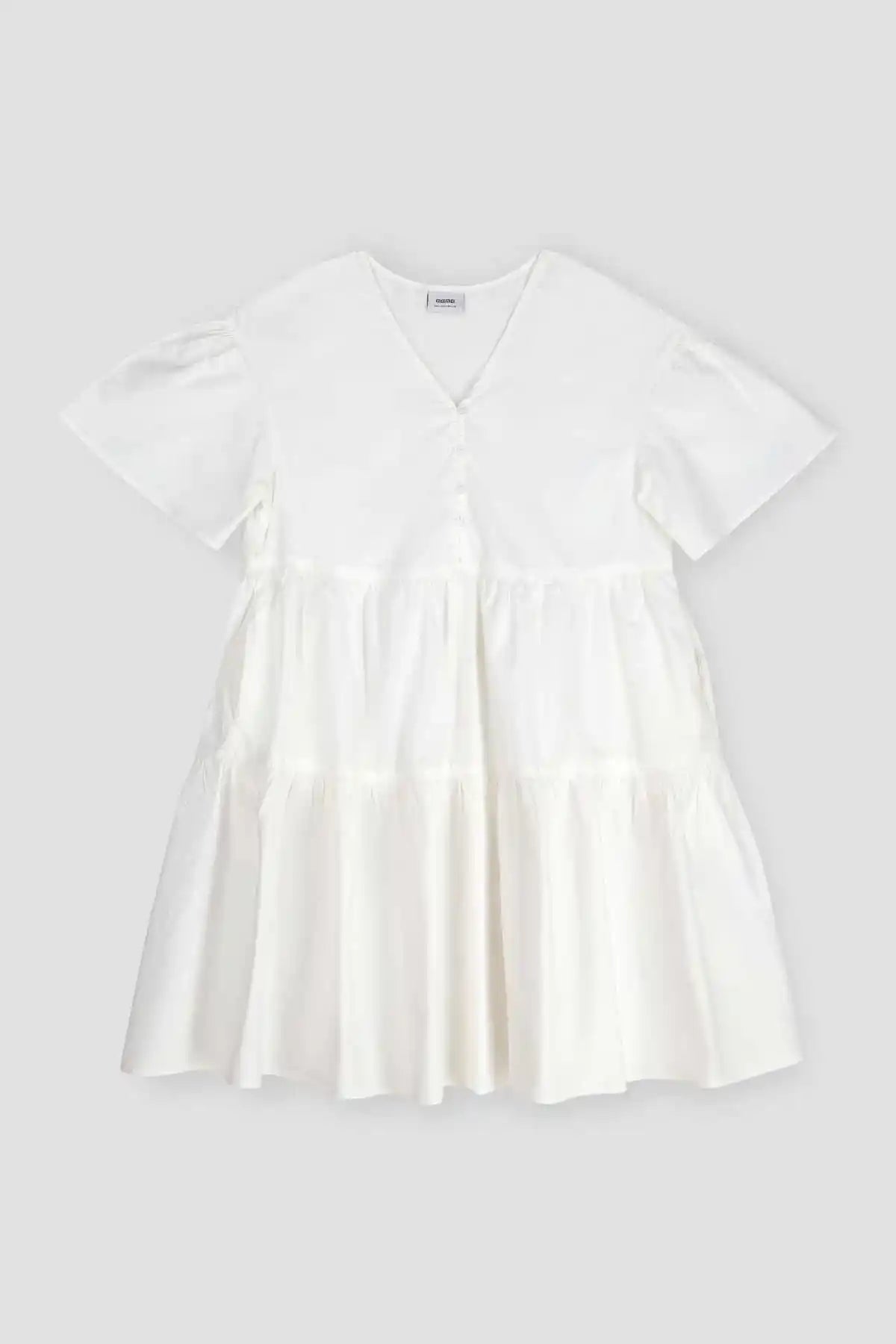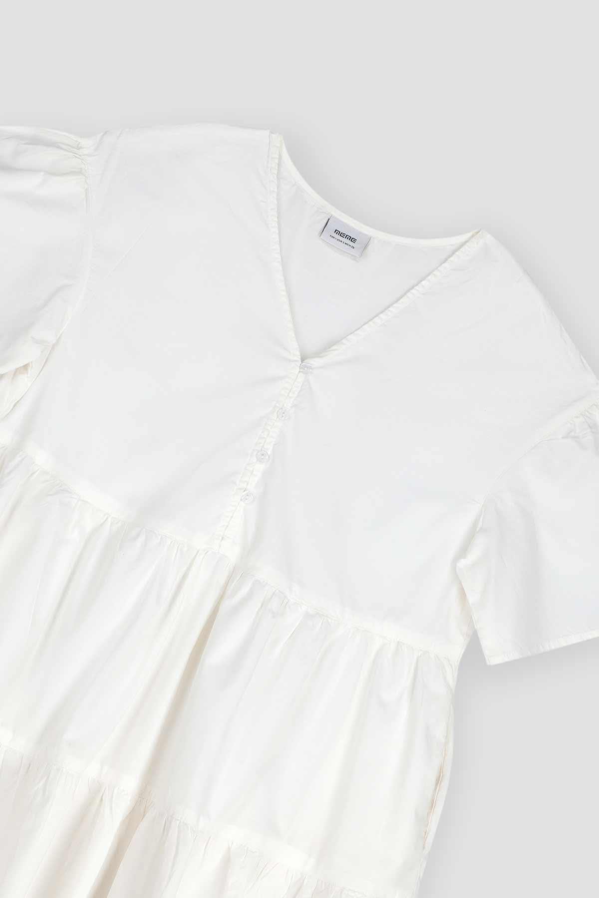 100% Cotton. Casual And Comfortable Solid V Neck Frill Dress Featuring Short Sleeves A Gathered Flared Dress