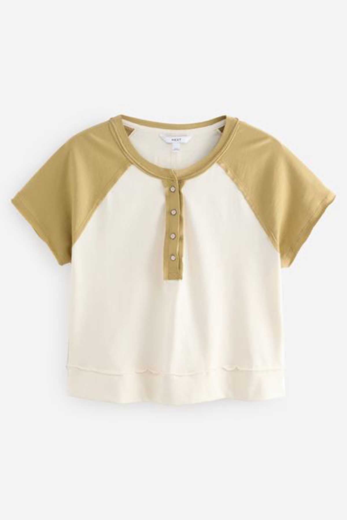 Ecru White And Green Shorter Length Raglan Colourblock Short Sleeve Button Henley T-Shirt
