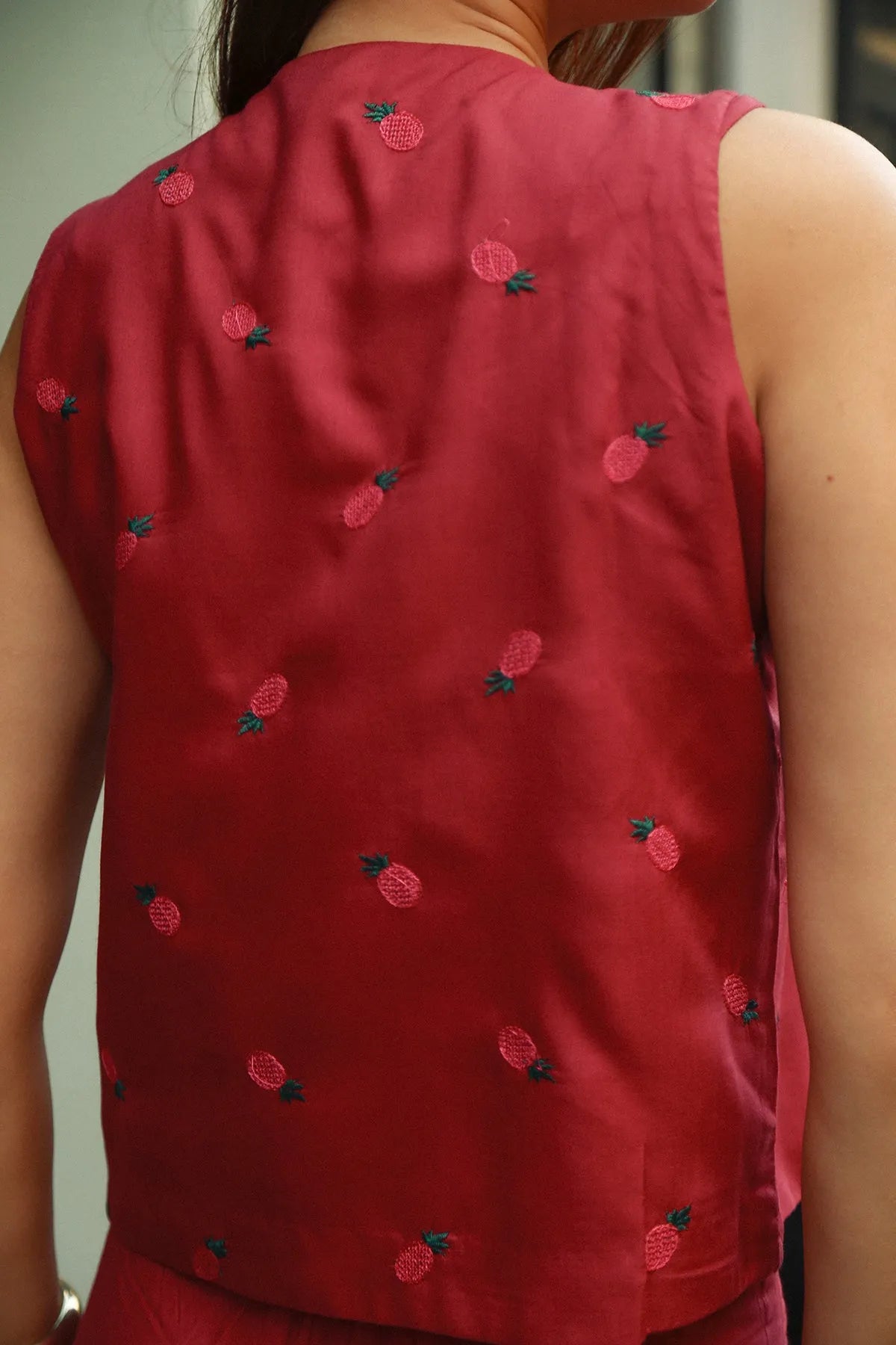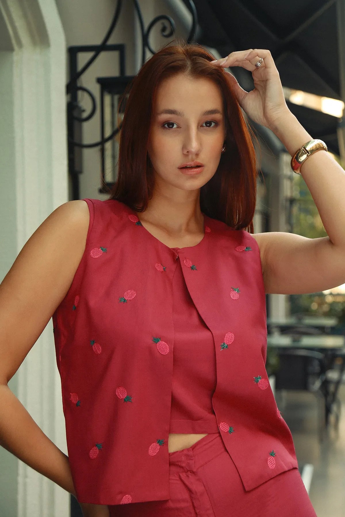 Sleeveless cropped jacket with delicate embroidered details for a refined finish.