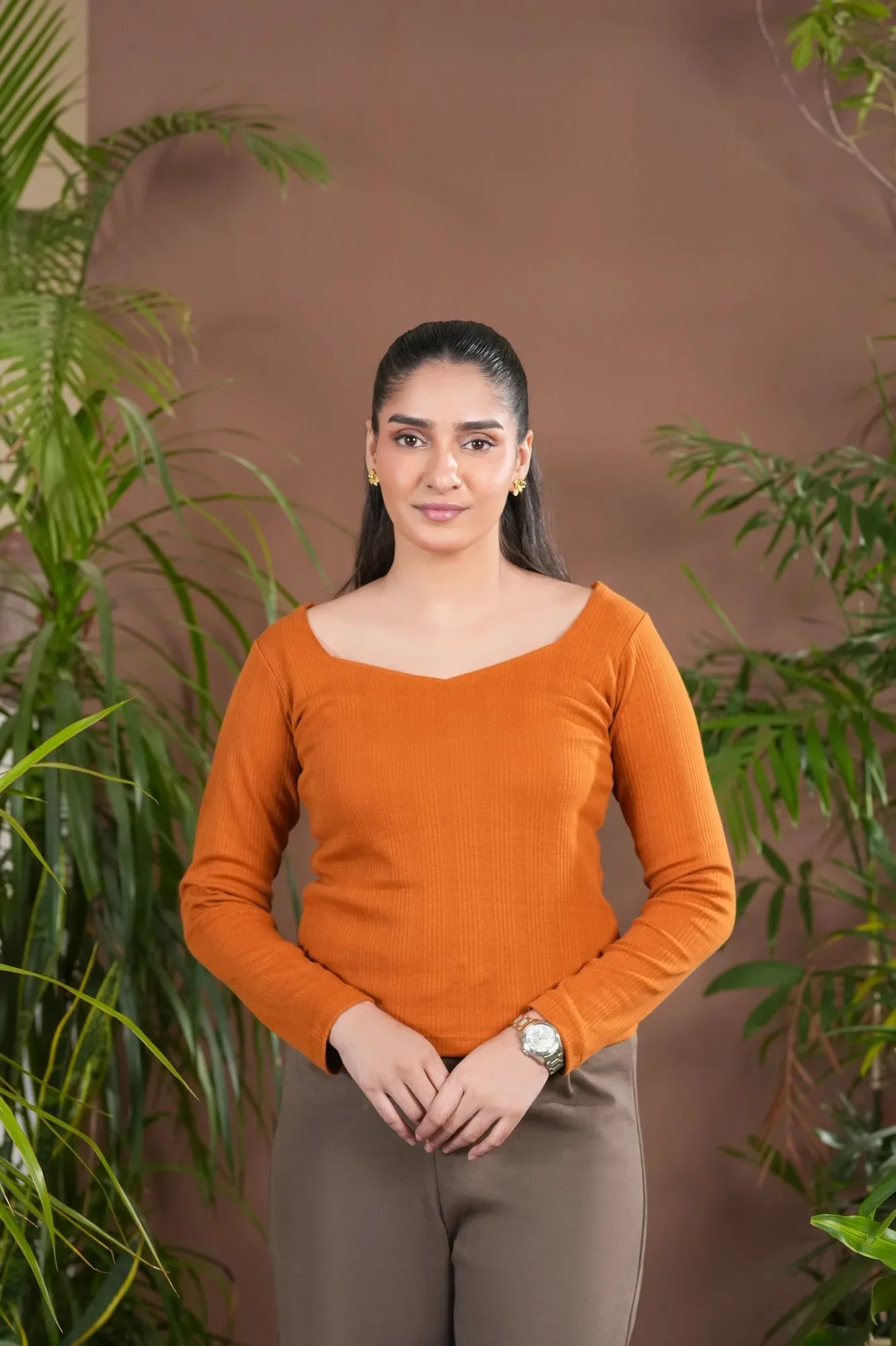 Orange Rust Drop Needle Diamond Neck Top