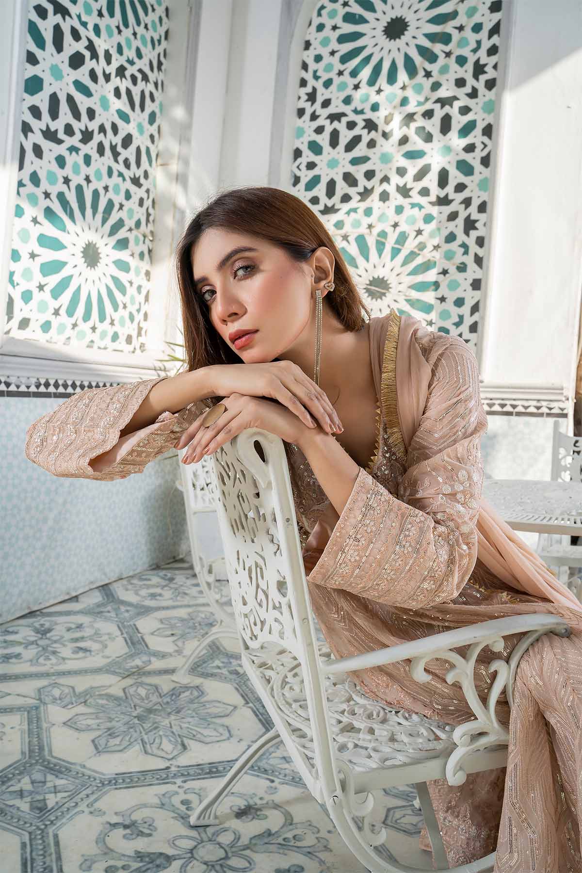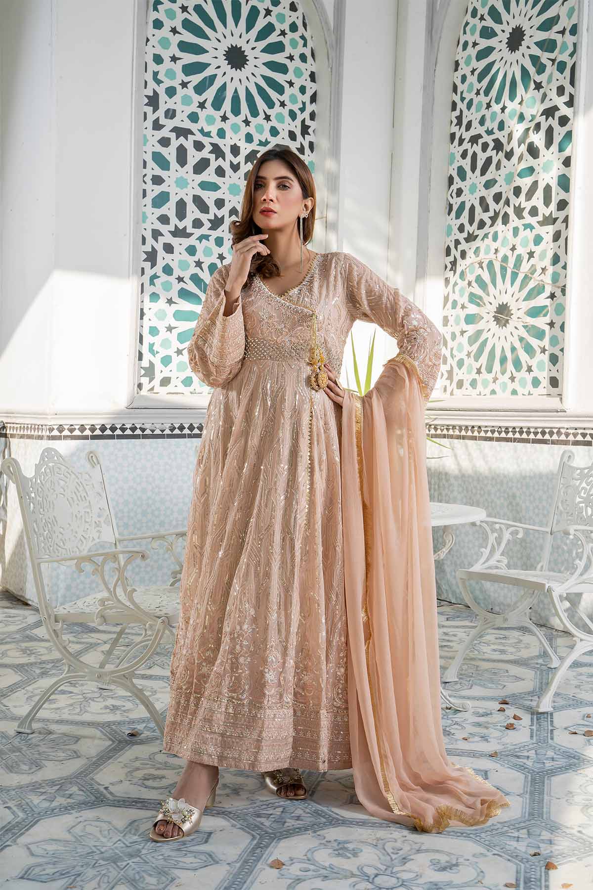 Description: This lovely angrakha style outfit sounds very beautiful and traditional, it is created using handcrafted resham & tilla work \nand the finest embroidered border on the sleeves and daman. A handmade dori tassel on the front of the shirt \nadds a unique and charming touch. Intimate events this season call for the pairing of this timeless shirt with a \nmalai crap bottom and chiffon dupatta with kiran lace border. This epitome of real pulchritude would provide \nyou with rich appeal in the event. Note: Measurements very according to designs.