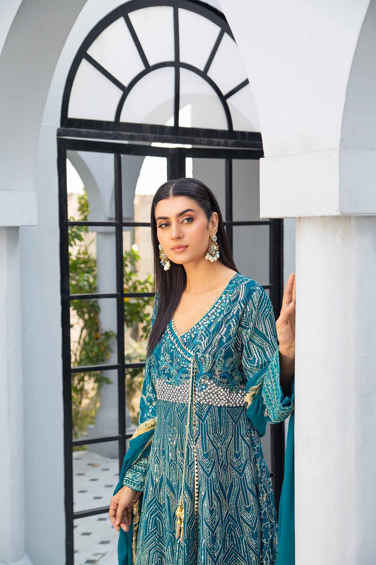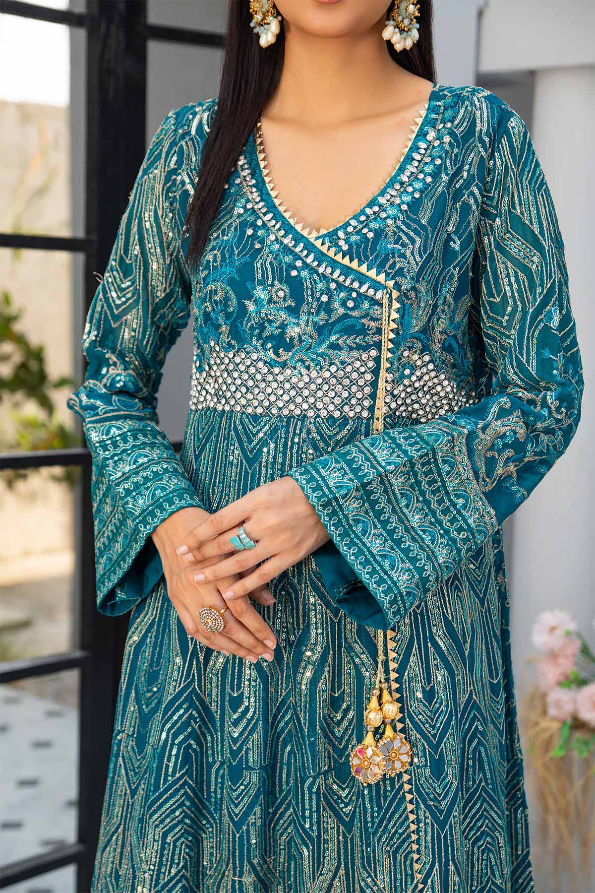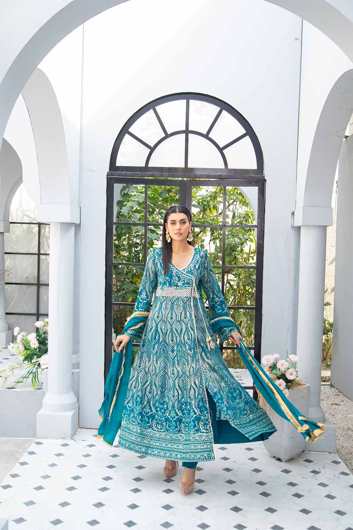 Description: This lovely angrakha style outfit sounds very beautiful and traditional, it is created using handcrafted resham & tilla work \nand the finest embroidered border on the sleeves and daman. A handmade dori tassel on the front of the shirt \nadds a unique and charming touch. Intimate events this season call for the pairing of this timeless shirt with a \nmalai crap bottom and chiffon dupatta with kiran lace border. This epitome of real pulchritude would provide \nyou with rich appeal in the event. Note: Measurements very according to designs.