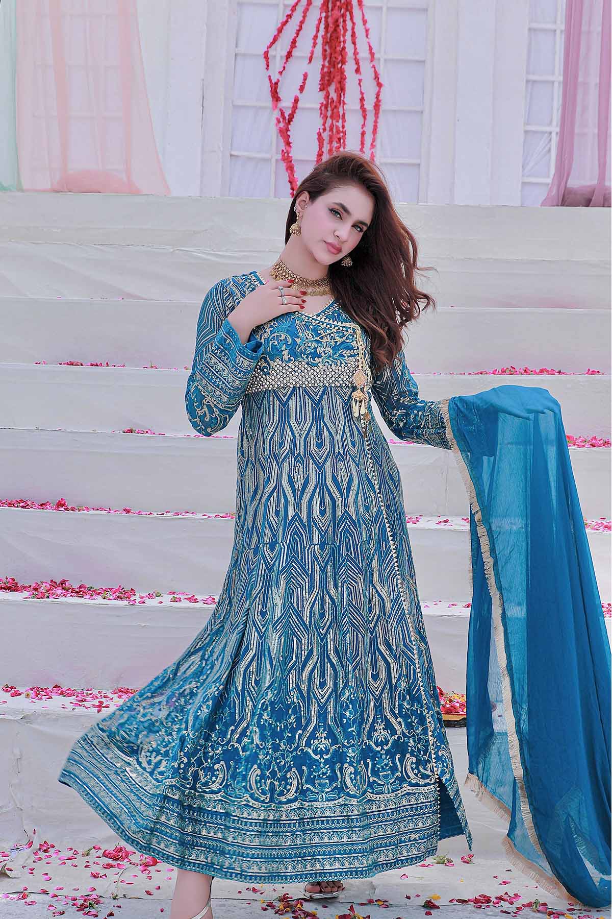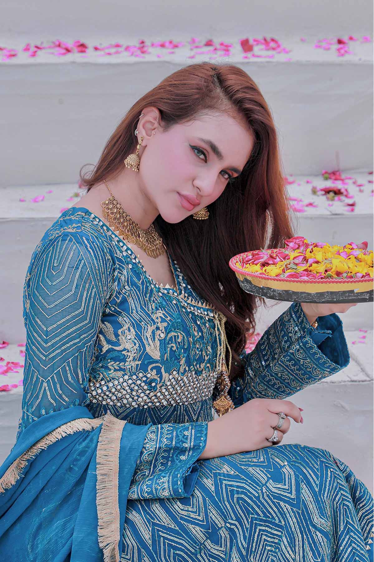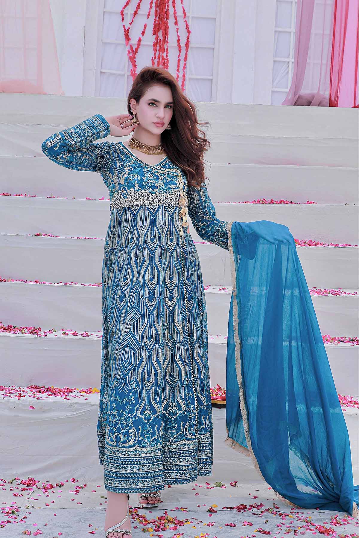 Description: This lovely angrakha style outfit sounds very beautiful and traditional, it is created using handcrafted resham & tilla work \nand the finest embroidered border on the sleeves and daman. A handmade dori tassel on the front of the shirt \nadds a unique and charming touch. Intimate events this season call for the pairing of this timeless shirt with a \nmalai crap bottom and chiffon dupatta with kiran lace border. This epitome of real pulchritude would provide \nyou with rich appeal in the event. Note: Measurements very according to designs.