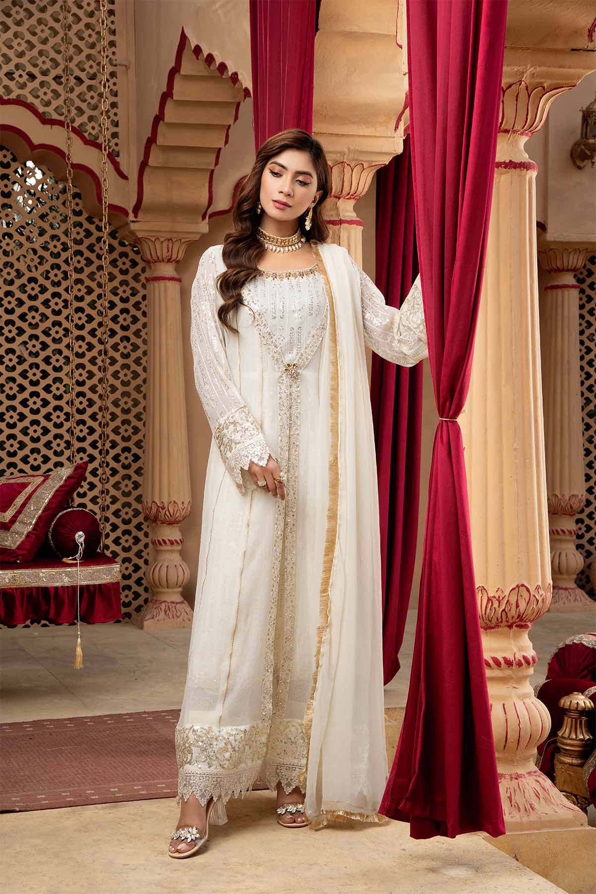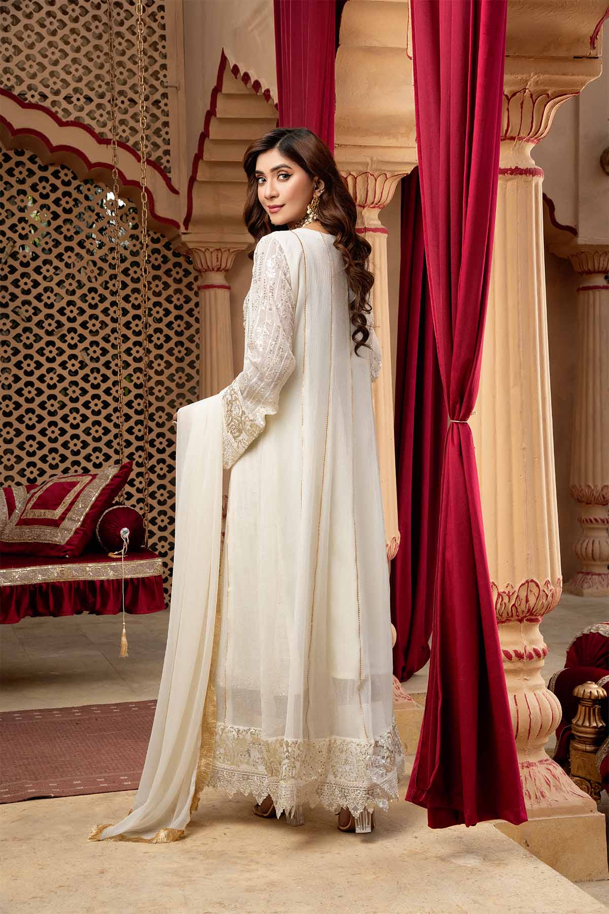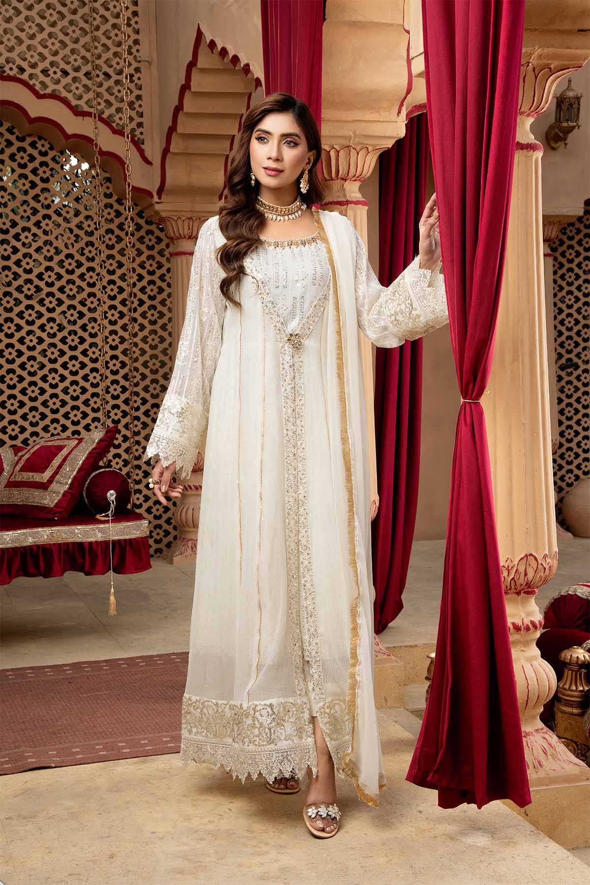There is exquisite embroidery work in vertical patterns, which exudes grace and elegance, is a marvel of craftsmanship and design. The designer's exquisite use of the sitara, stone work and sequin embroidery technique enhances this lovely dress. A gorgeous chiffon dupatta with a kiran lace border completes the ensemble. Make use of Mona Embroidery to showcase your individual style and embrace it.