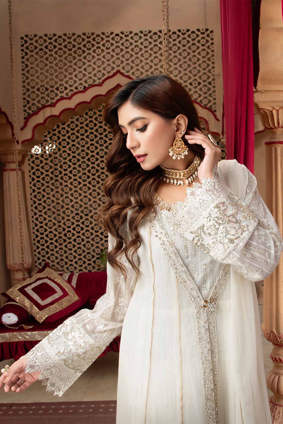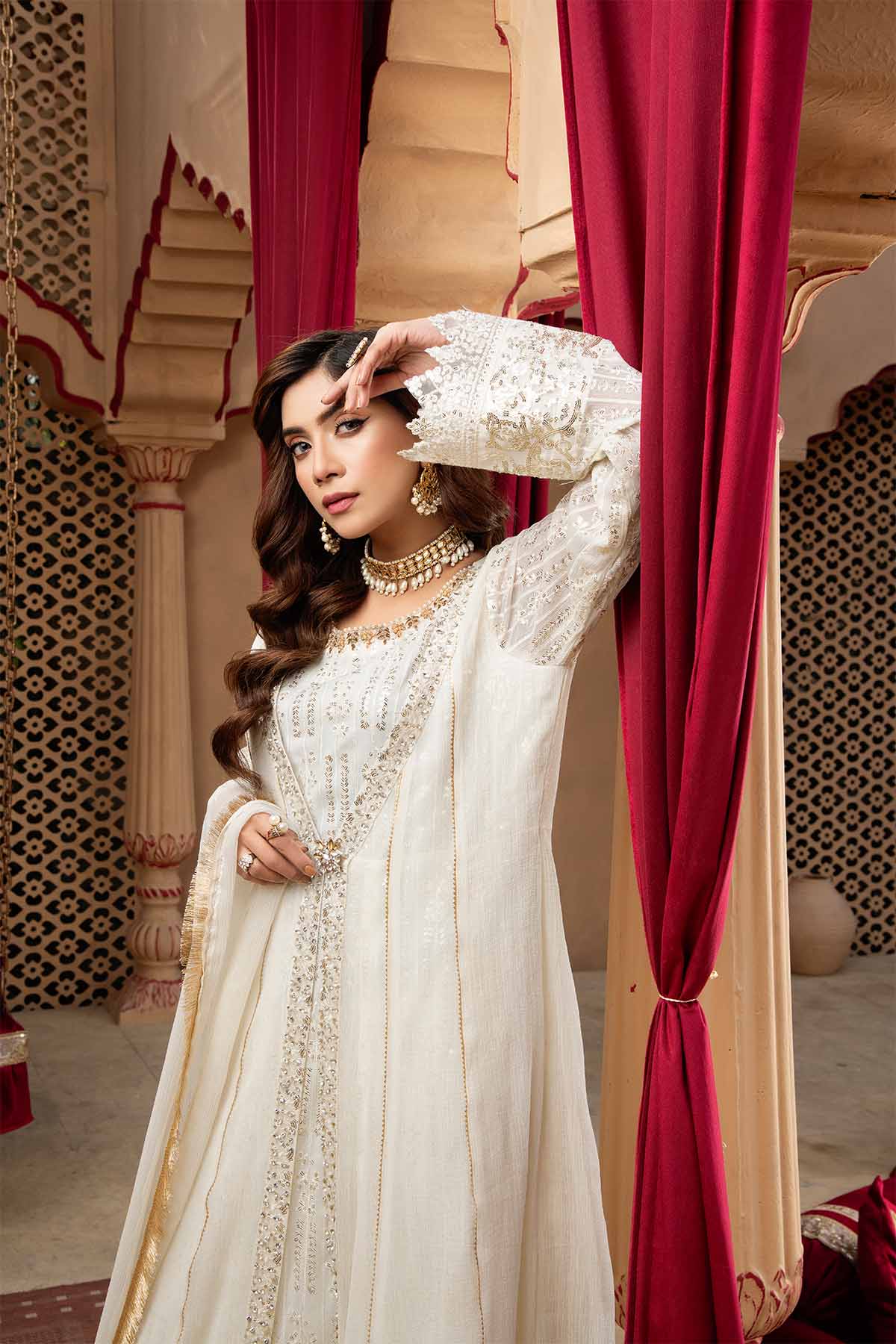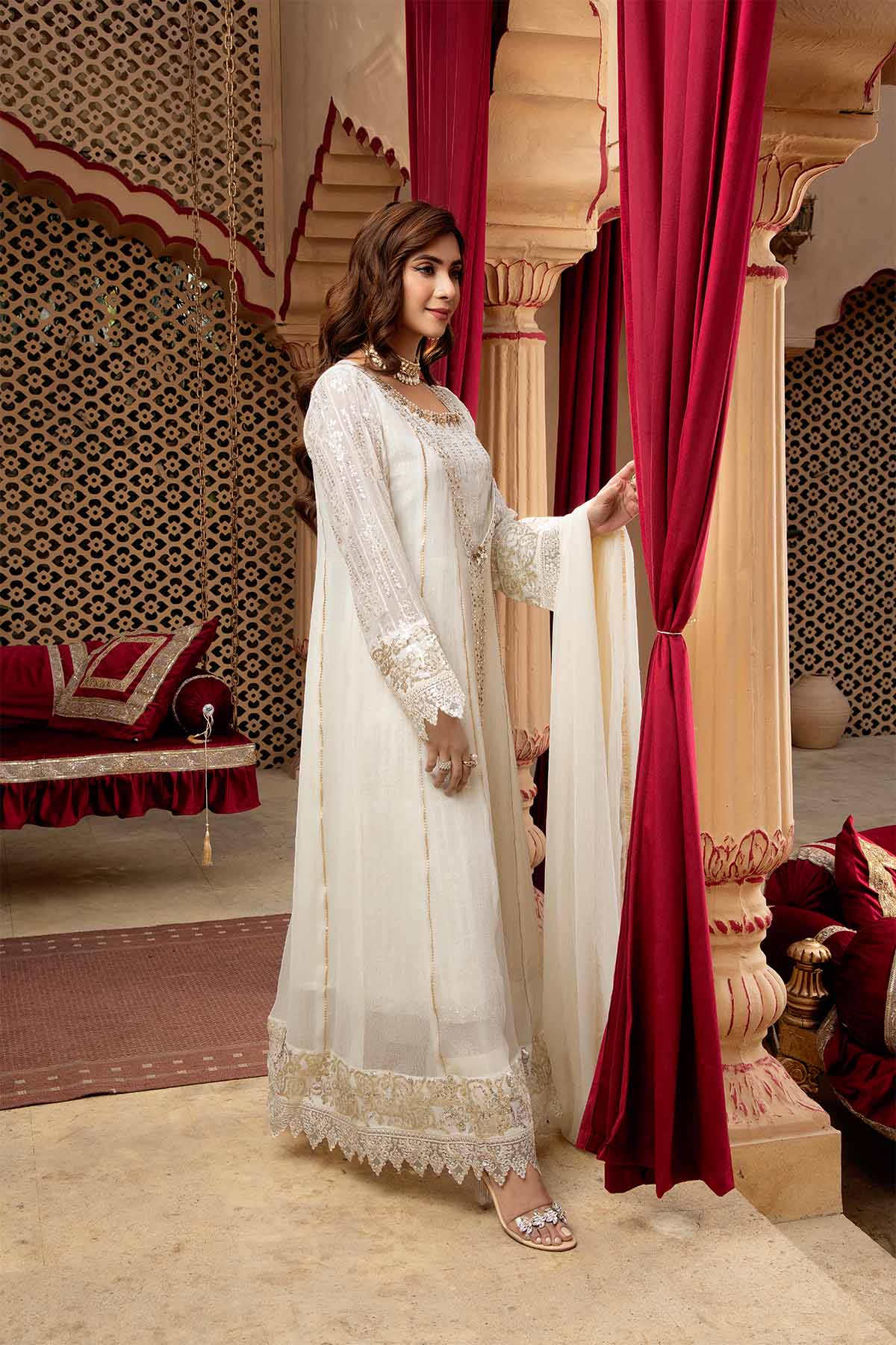 There is exquisite embroidery work in vertical patterns, which exudes grace and elegance, is a marvel of craftsmanship and design. The designer's exquisite use of the sitara, stone work and sequin embroidery technique enhances this lovely dress. A gorgeous chiffon dupatta with a kiran lace border completes the ensemble. Make use of Mona Embroidery to showcase your individual style and embrace it.