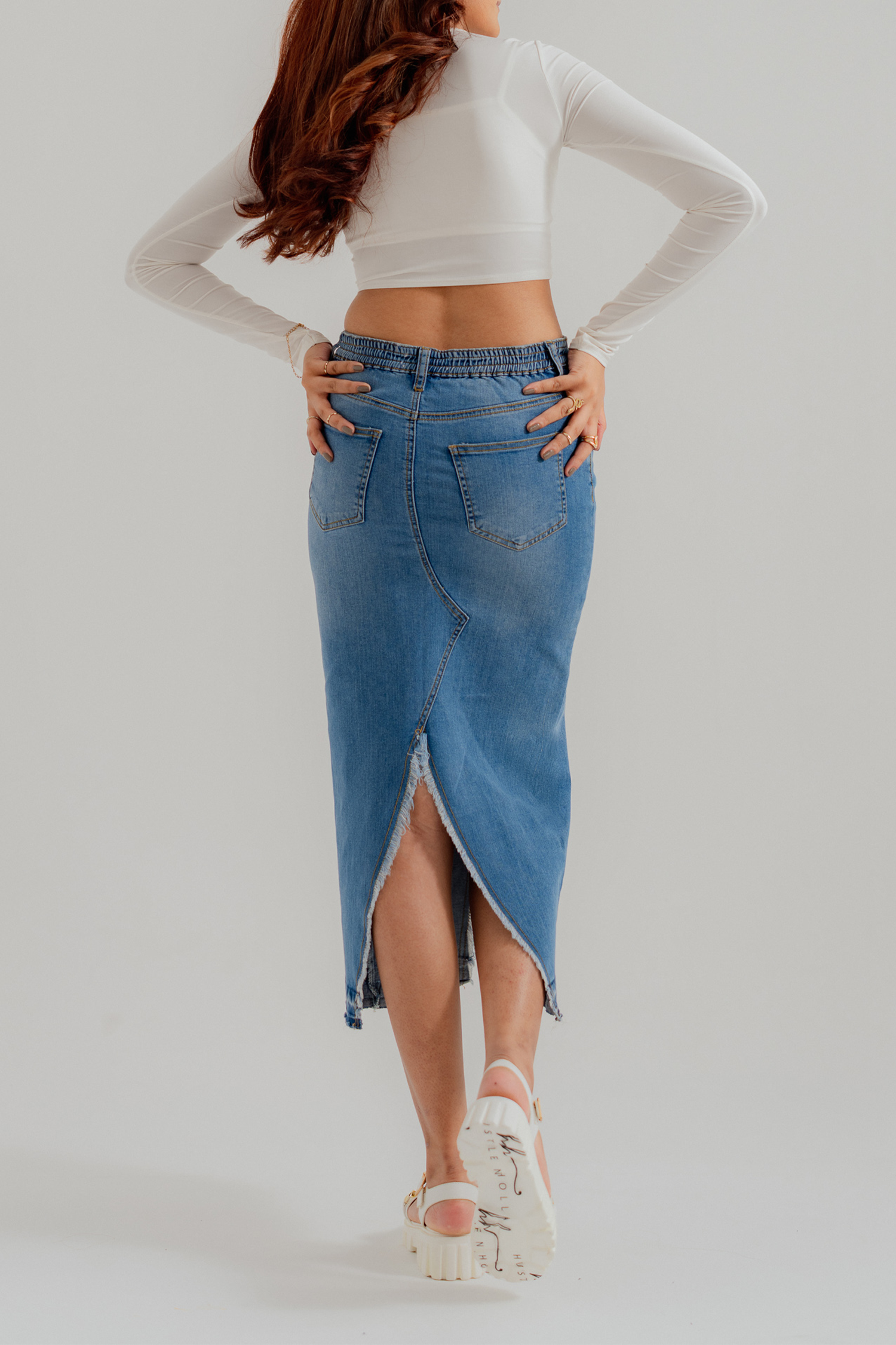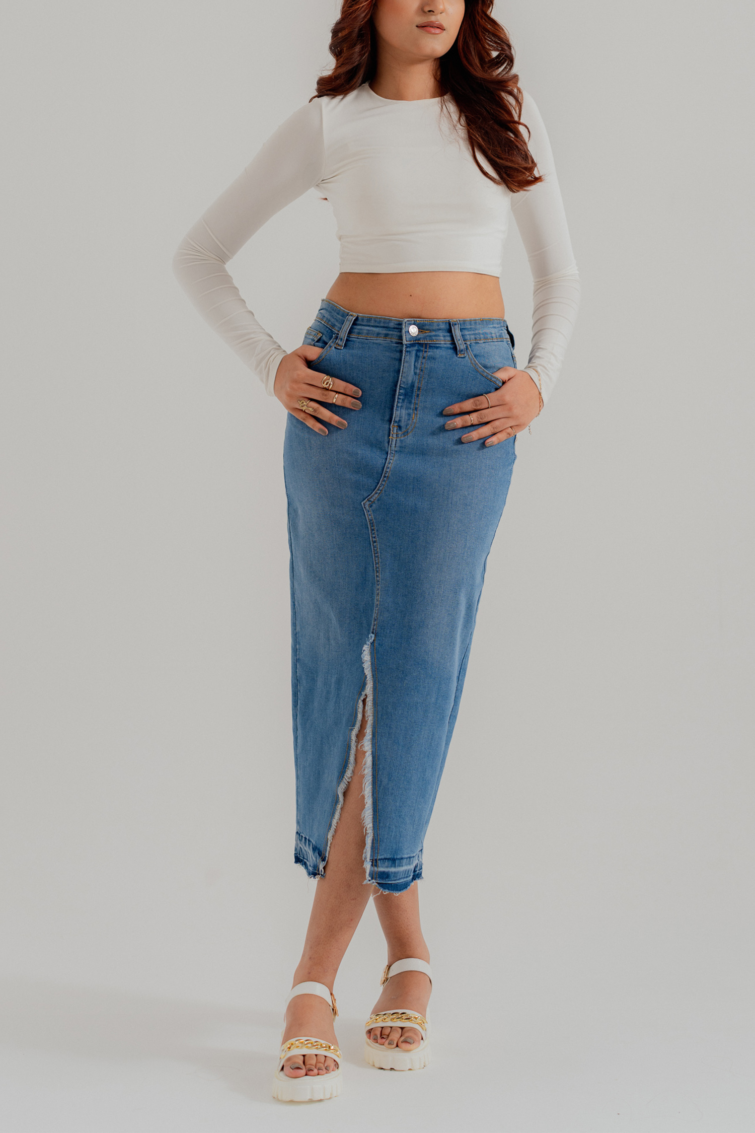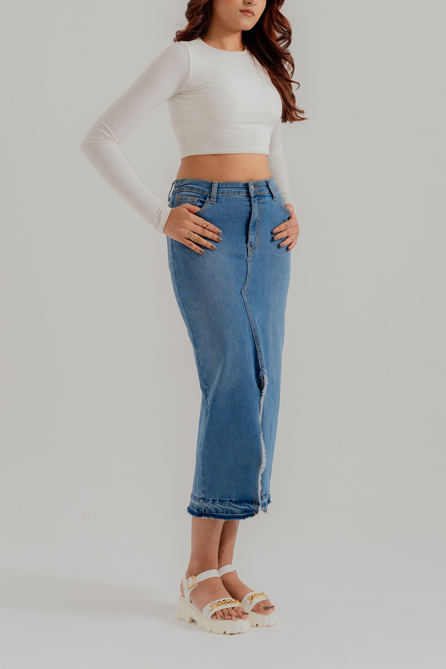 Mid Blue Denim Midi Skirt with Slit