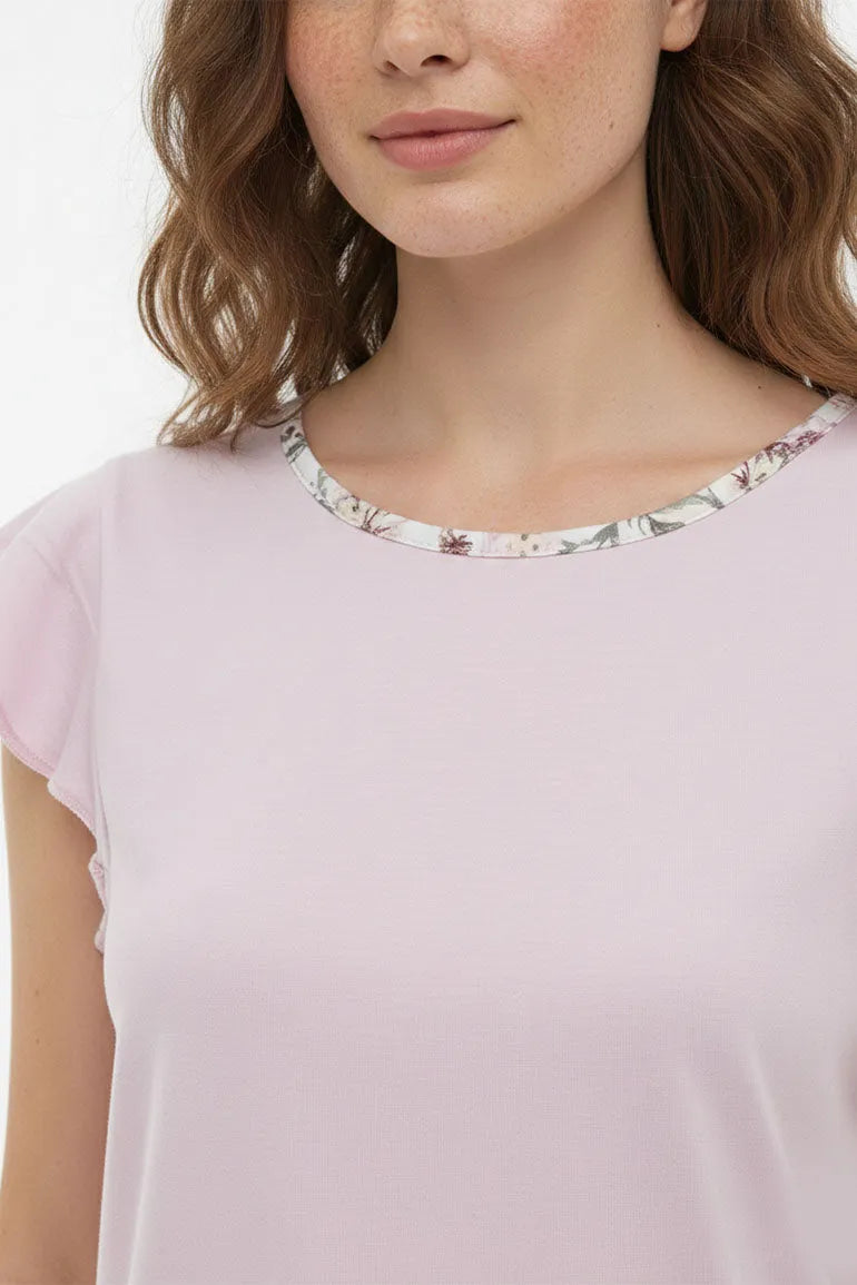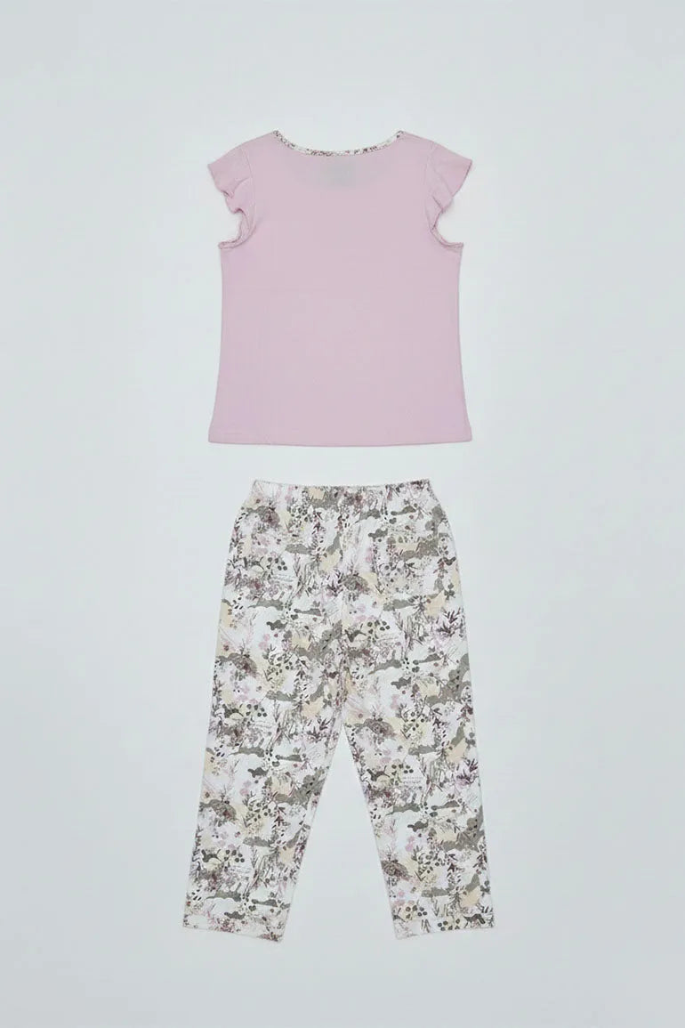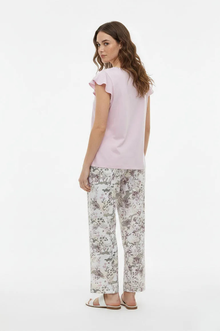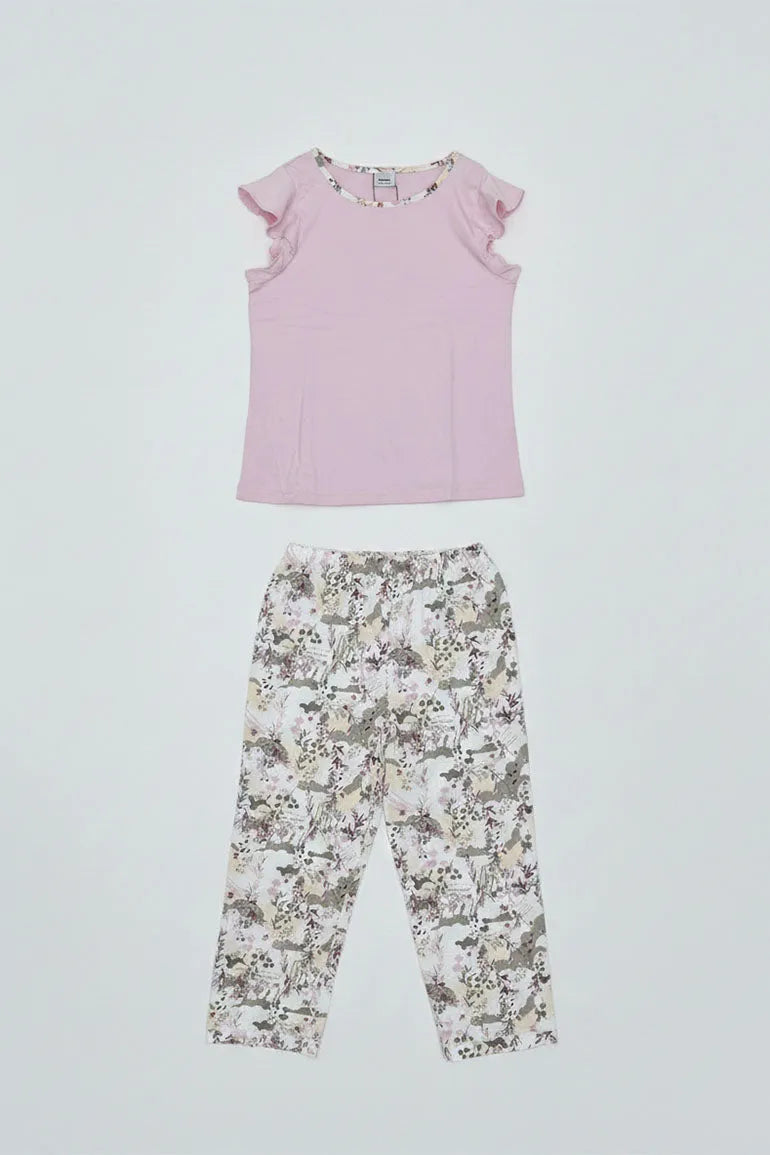 A soft and stylish two-piece lounge set featuring a light pink top with delicate sleeve detailing and matching floral print bottoms. Designed for all-day comfort and an easy, relaxed fit. Perfect for lounging at home or casual everyday wear.