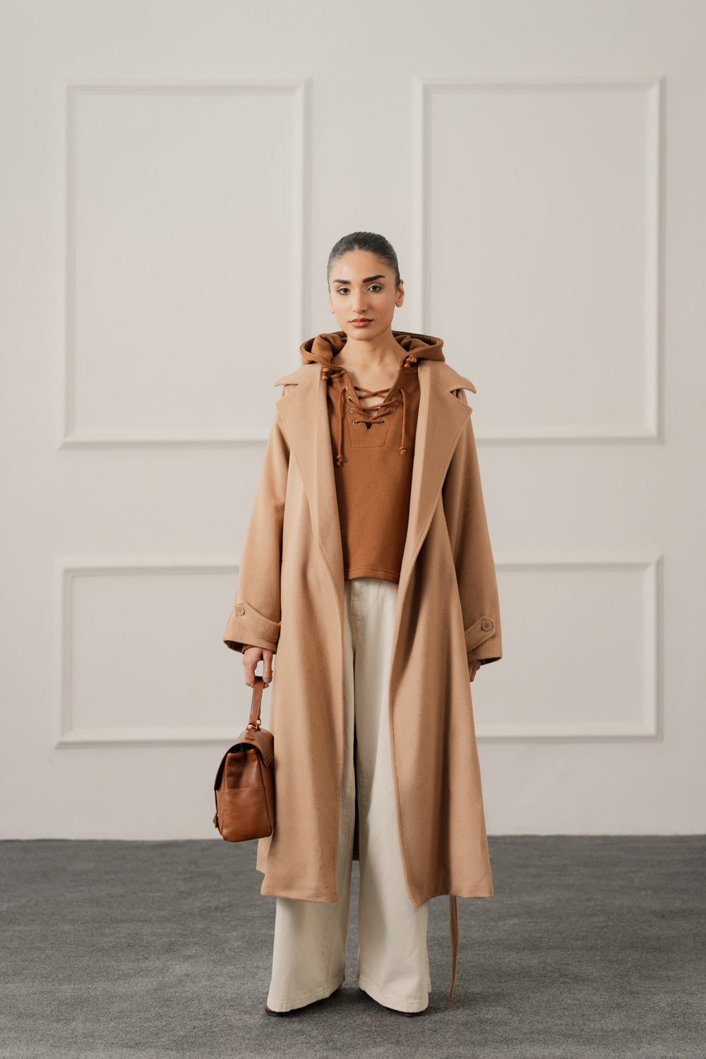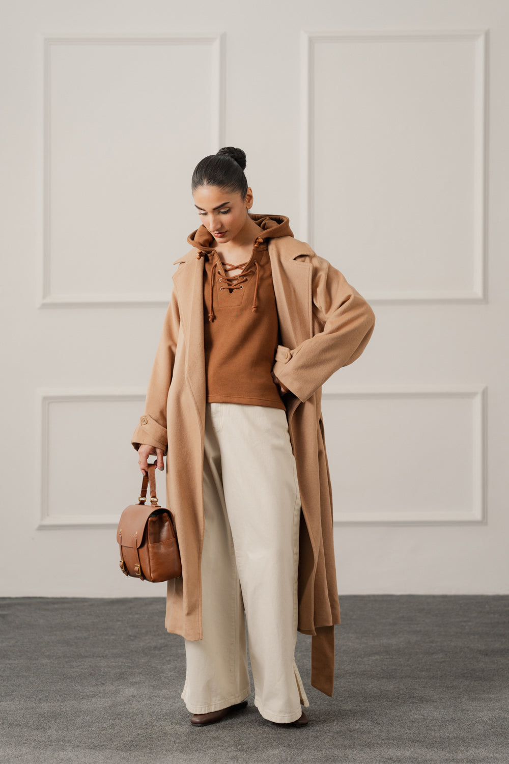 A brown terry relaxed-fit lace-up hoodie featuring a statement front tie detail, soft cozy texture, and a laid-back silhouette. Modern, comfortable, and street-ready for everyday wear.