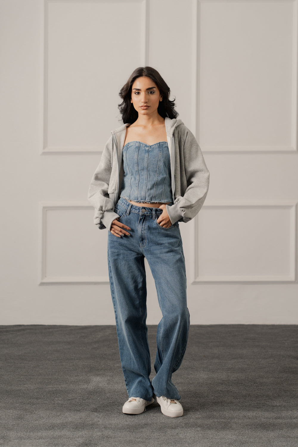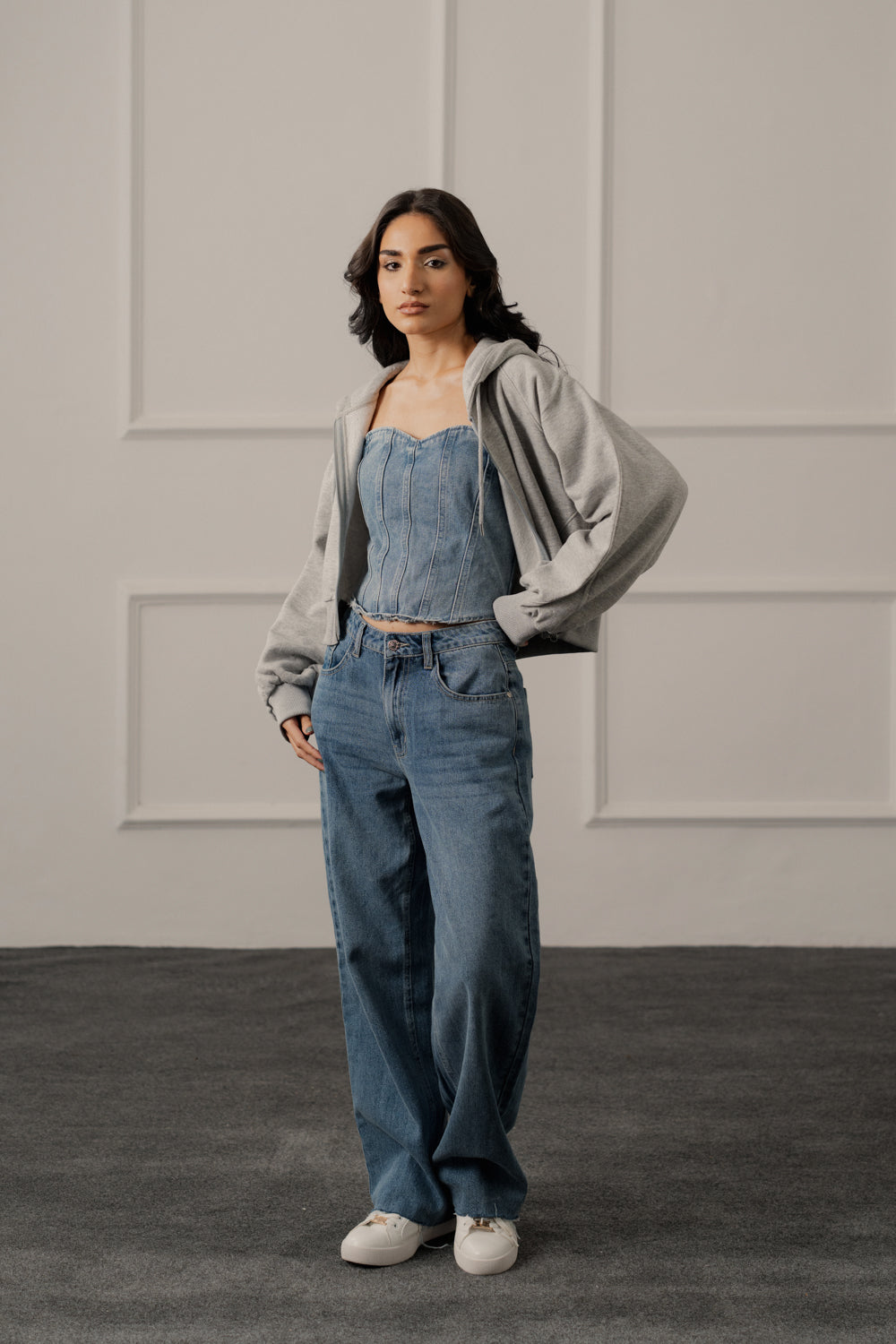 A grey oversized crop zipper hoodie featuring a relaxed drape, raw-cut hem, and bold artwork on both the front and back. Cozy, modern, and statement-readyâ€â€perfect for elevated everyday streetwear.