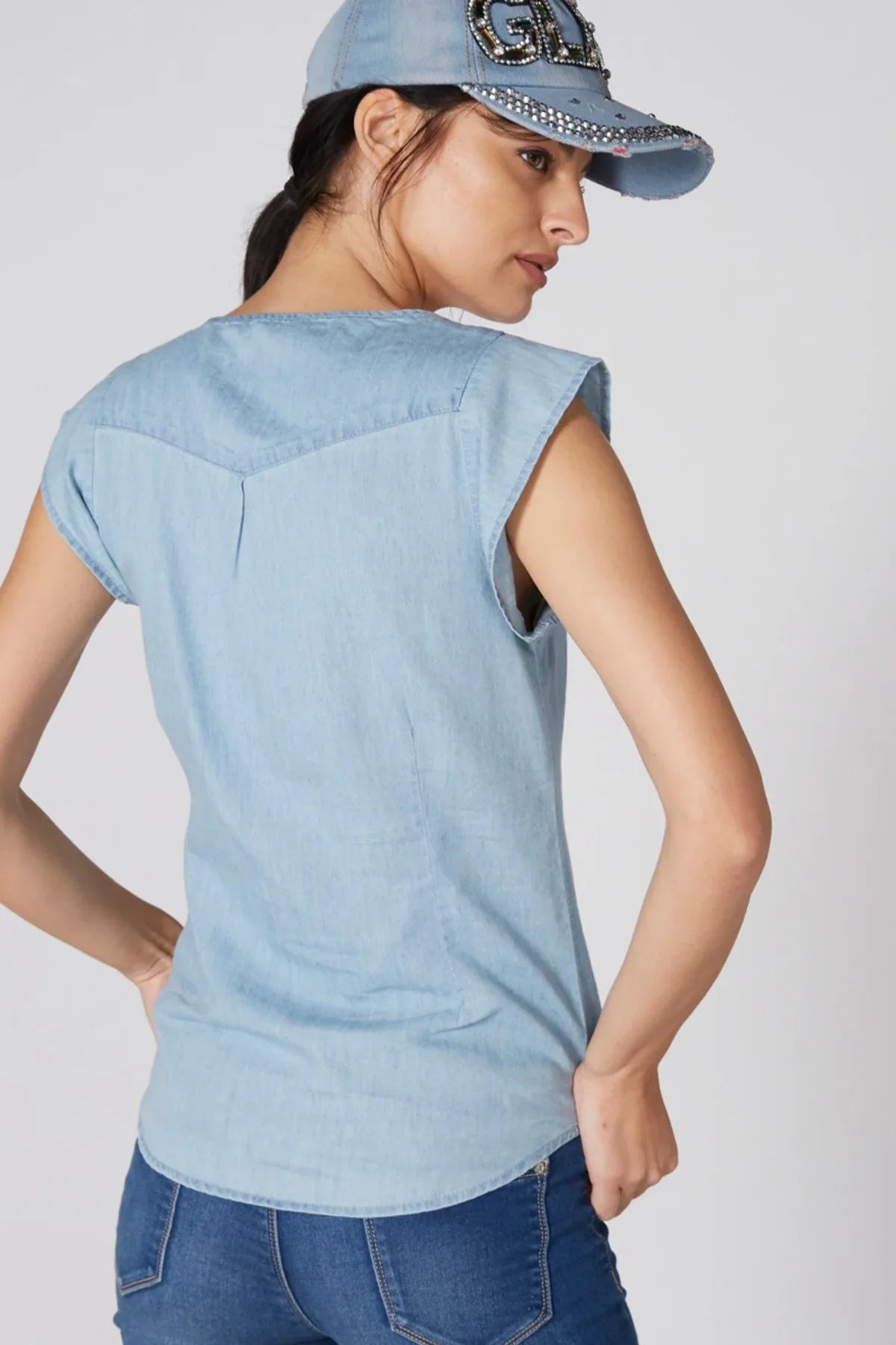 Denim Top with Henley Neck and Cap Sleeves
