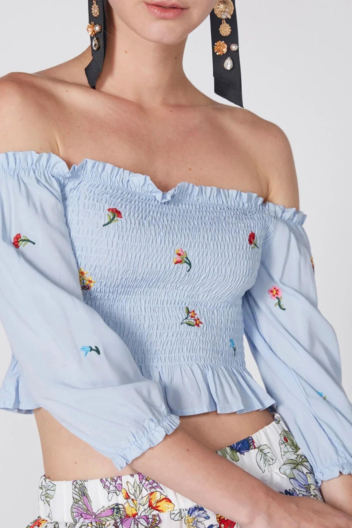 Embroidered Off Shoulder Crop Top with Smocking Detail