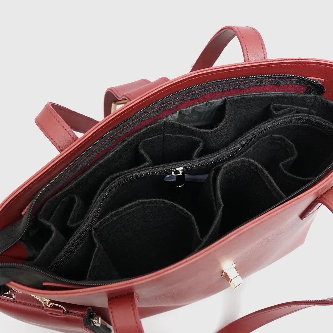 The Modern luxe Tote blends a bold deep red upper panel with a soft textured neutral base, creating a refined two-tone look that stands out without trying too hard. Structured yet lightweight, this tote is made for daily use — from office hours to casual outings.
