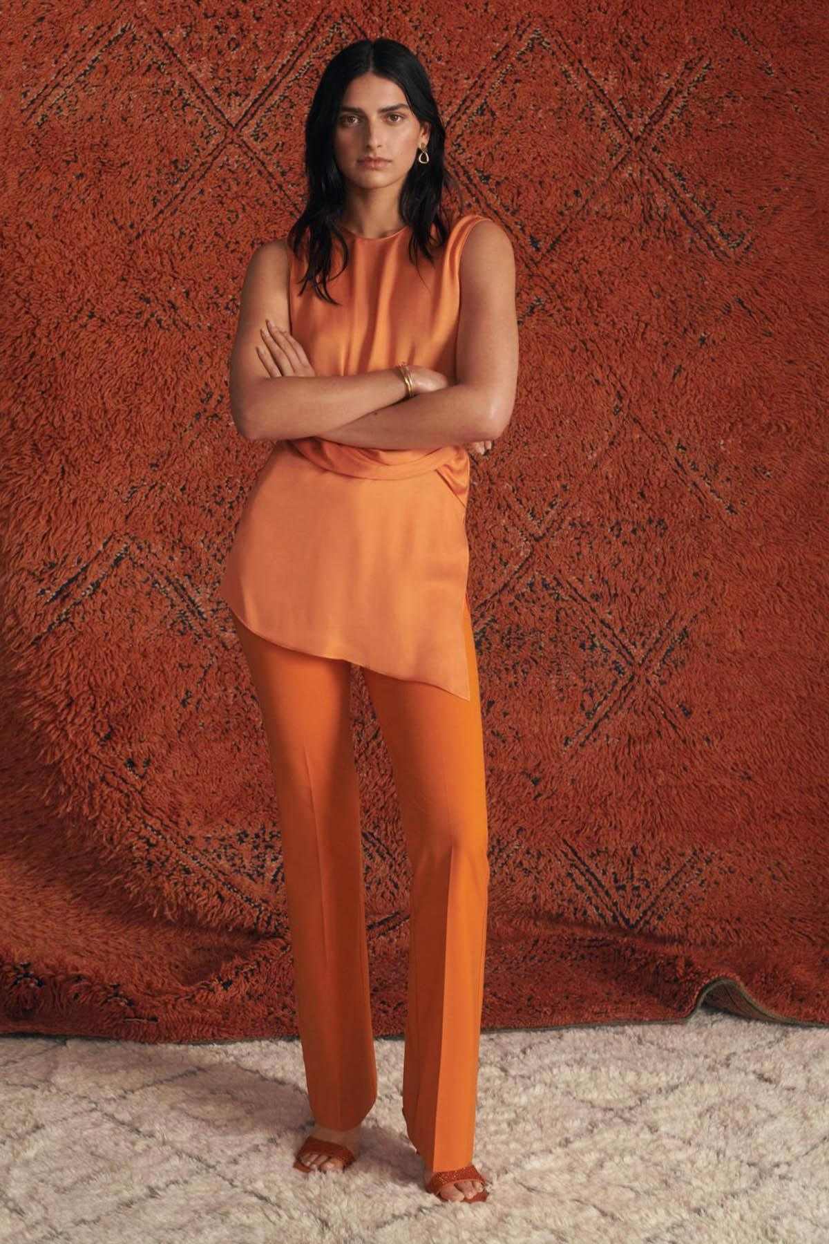 Recycled polyester blend fabric. Straight design. Long design. Medium waist. Decorative seams. Loops. Two side pockets. Concealed button, hook and zip fastening. Ramadan Collection.
