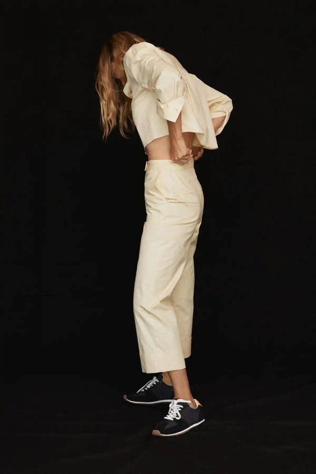 100% Cotton. Light fabric. Straight design. Cropped design. Rolled-up hem. Two side pockets. Zip and one button fastening.
