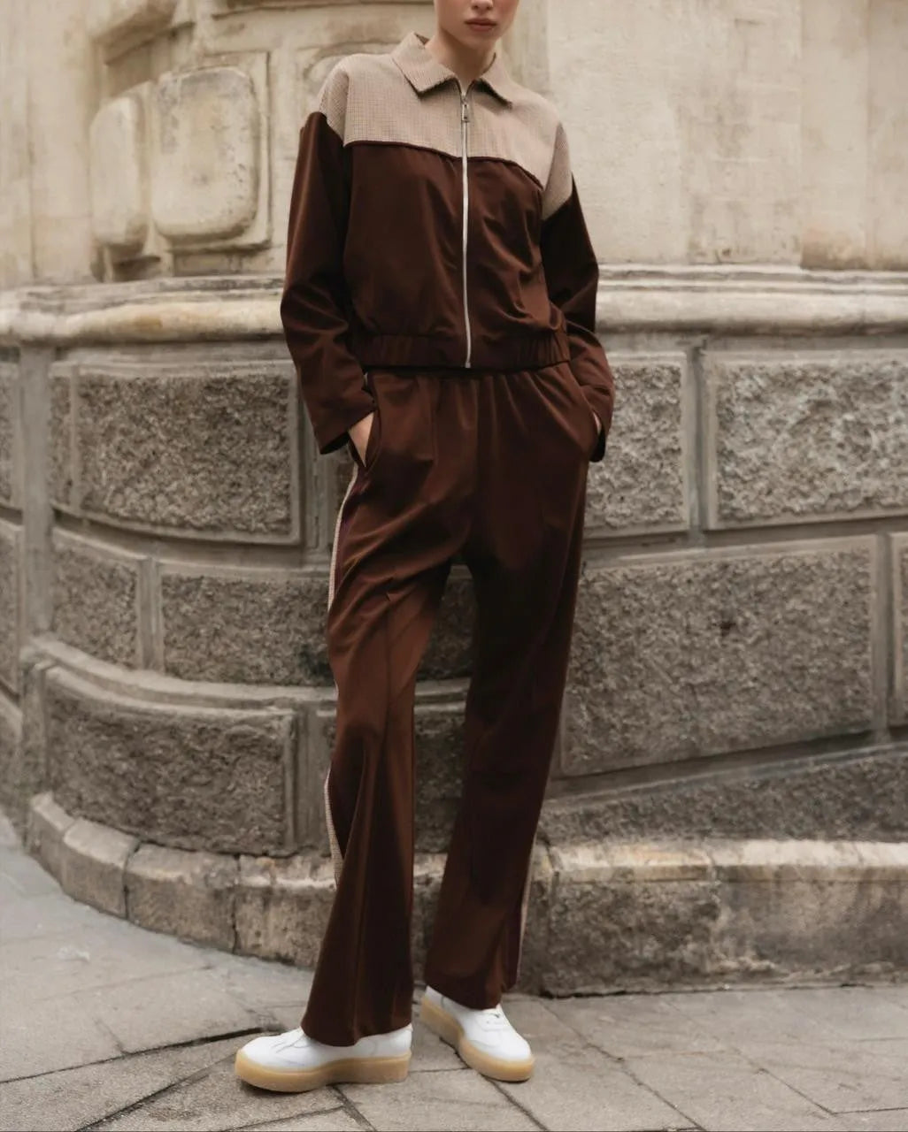 These trousers are cut in a relaxed fit for comfort and flexibility. Cross pockets at the front and pockets at the back add utility, while a checked lining along the sides ties the look back to the jacket. Designed for movement and ease, they complete the set with a coordinated finish.