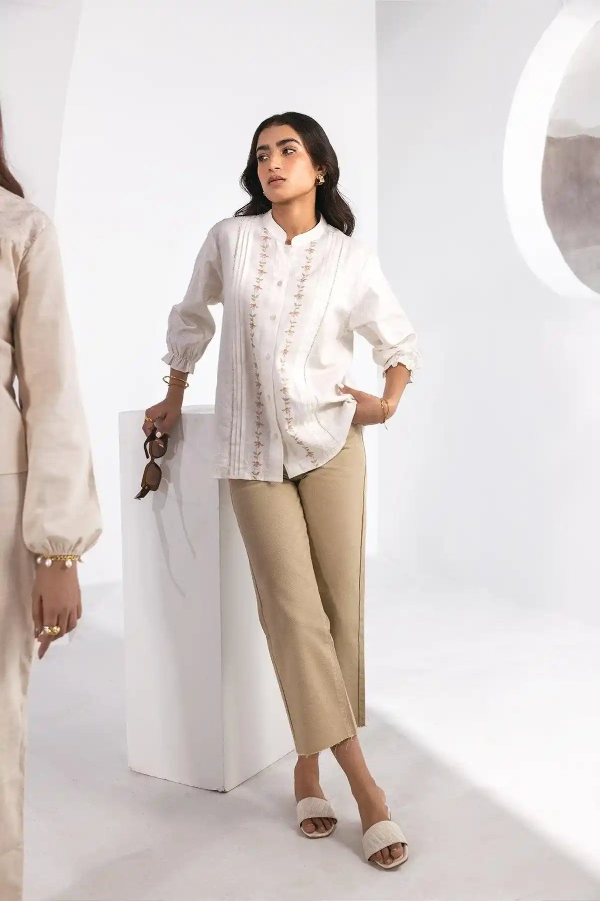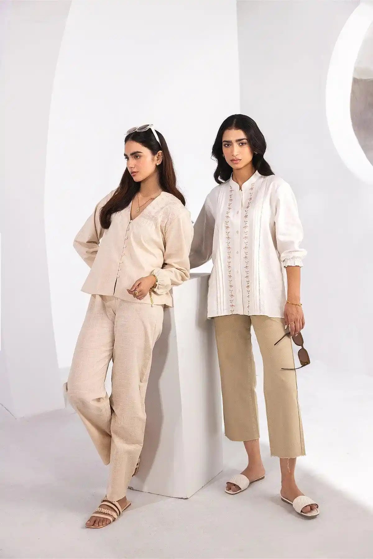 100% Cotton. Twill Fabric. Trendy, Smart Casual Pants Featuring Waistband With Button And Loops. Front Slash Pockets. Rear Welt Pockets. Zip Up Fly With Button. High Rise Waist. Straight Raw Hem.