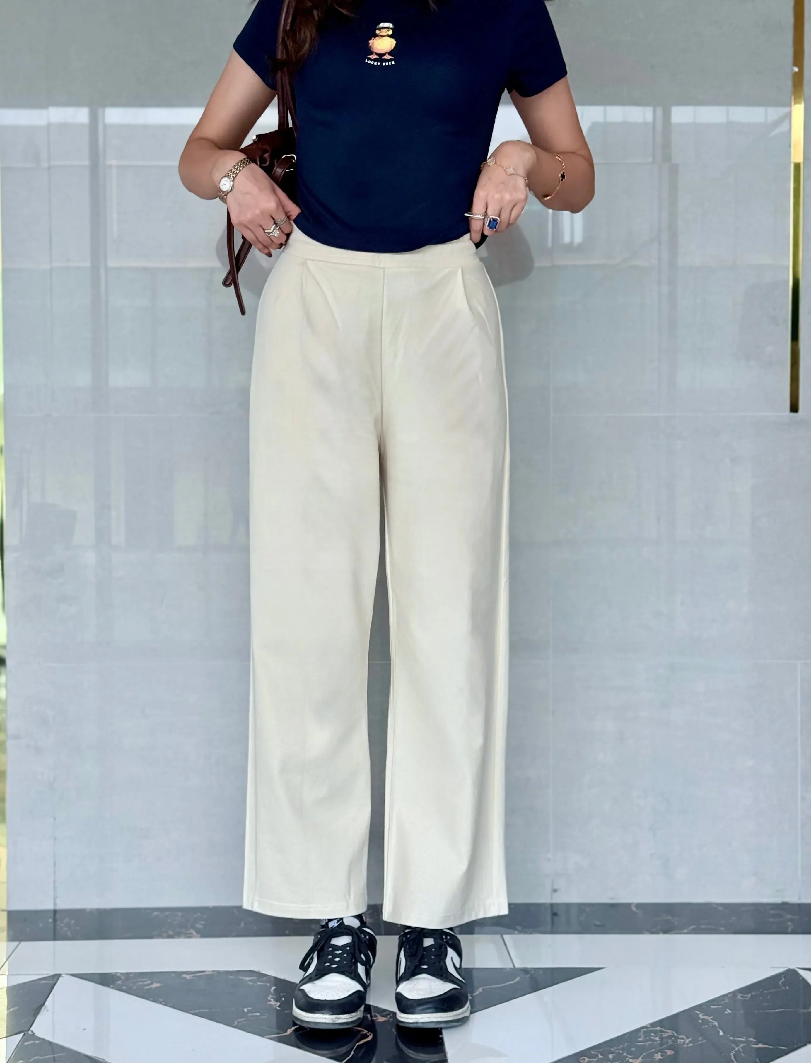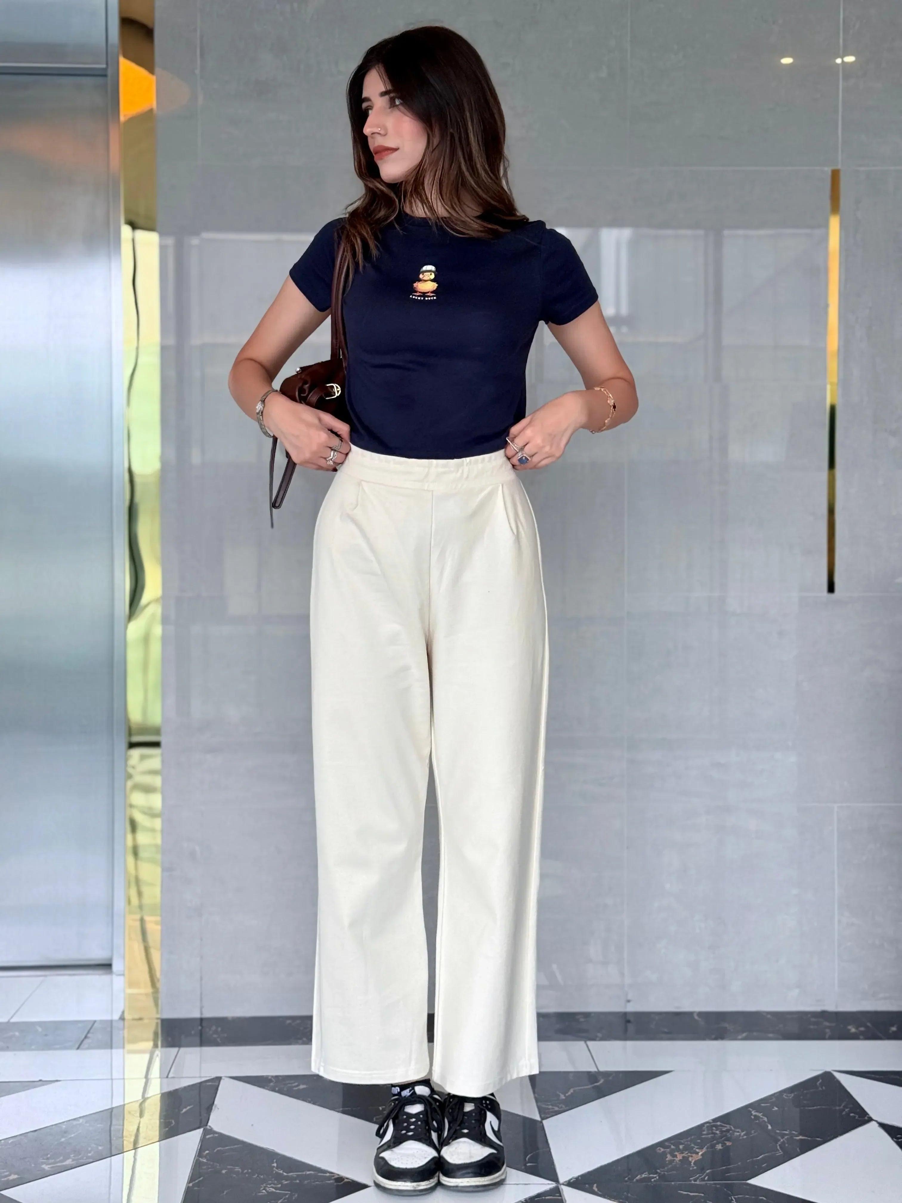 Soft And Flowy, The Off White Ribbed Loose Fit Trousers Offer Effortless Movement And Versatile Styling – Perfect For Summer Comfort And Everyday Wear.